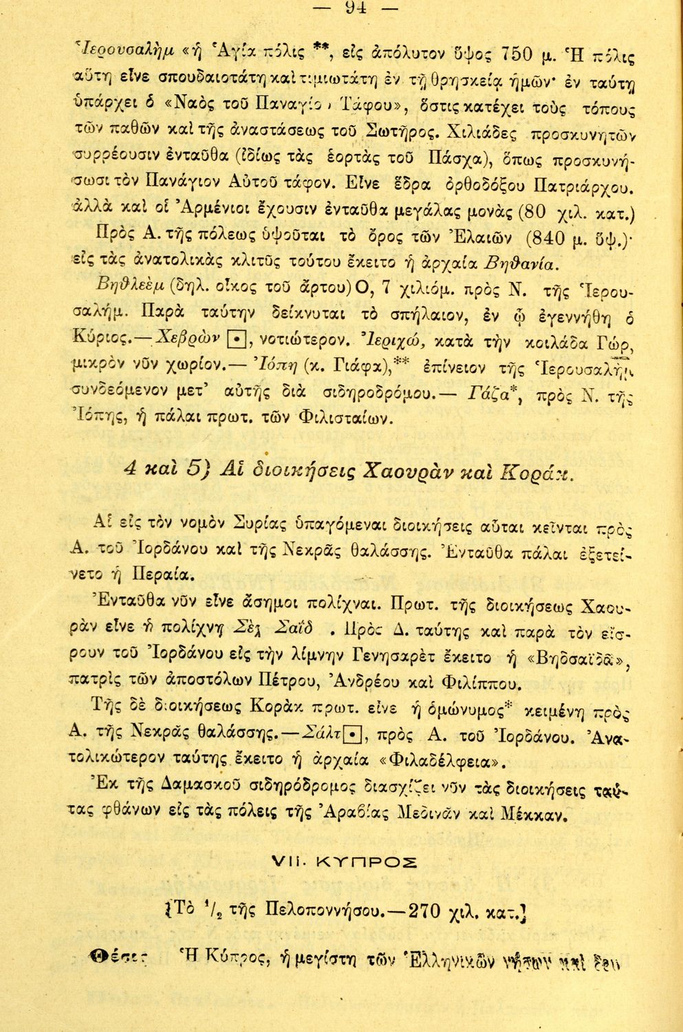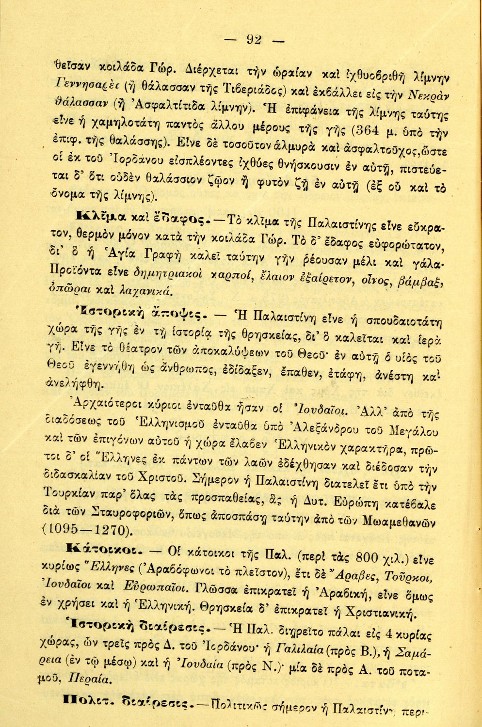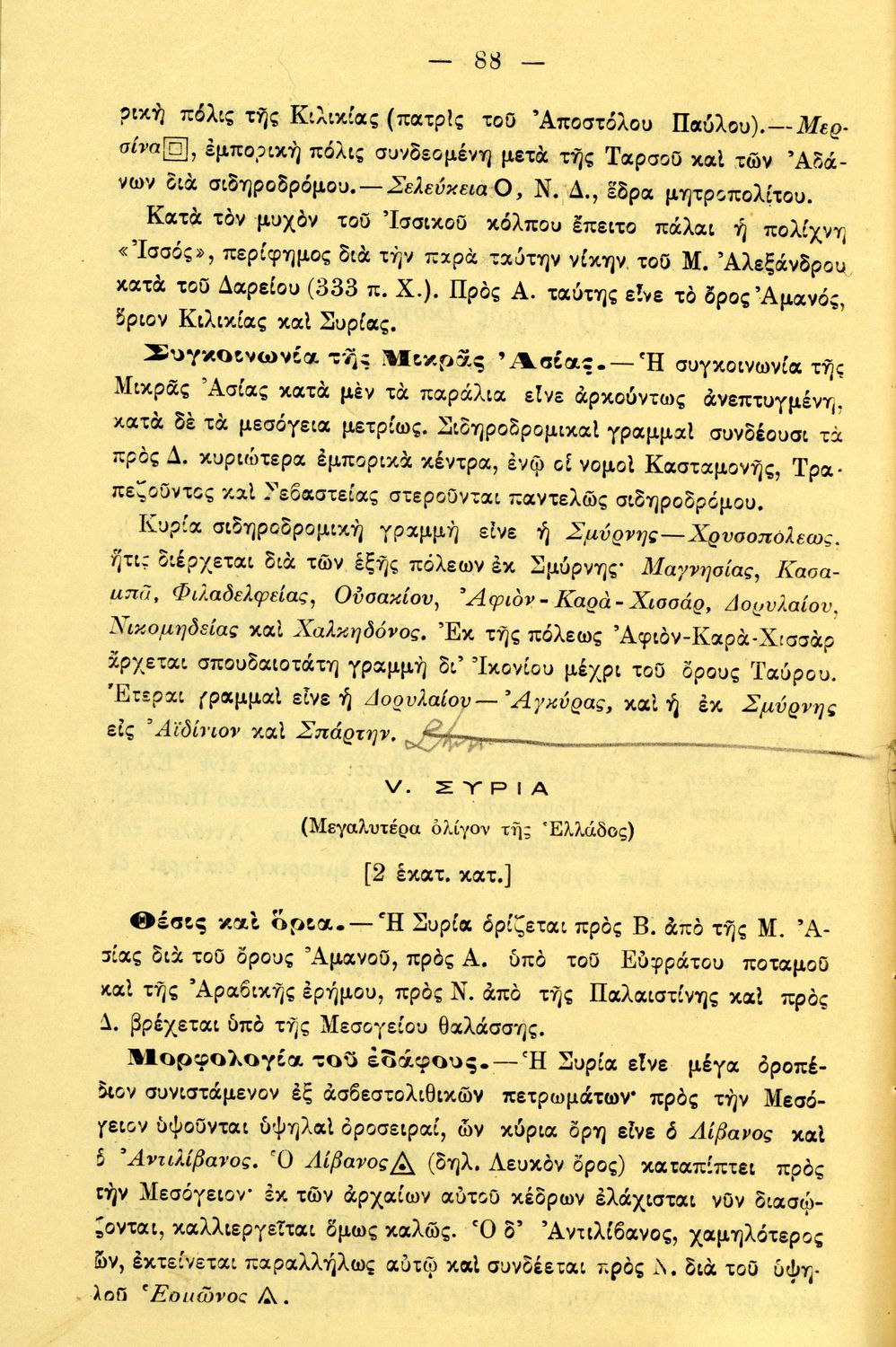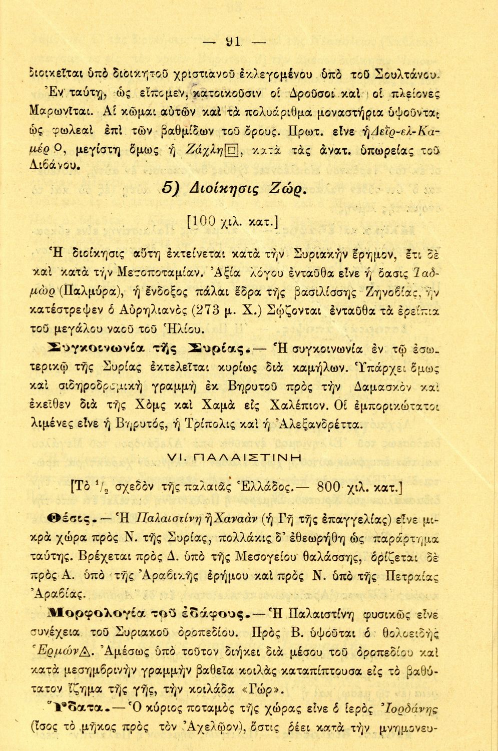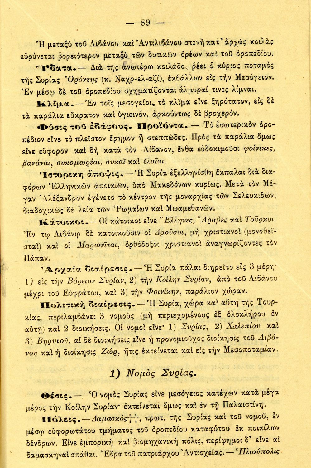 Σχολικό εγχειρίδιο Γεωγραφίας Γ΄ Ελληνικού Σχολείου που αποτελεί μια γενική επισκόπηση της Ελλάδας ανά διαμέρισμα και νομό. Περιέχει και ειδικό κεφάλαιο για τις "λοιπές ελληνικές χώρες" στις οποίες περιλαμβάνονται τα Δωδεκάνησα, η Τουρκική Θράκη, η Ανατολική Ρωμυλία, η Σερβική και Βουλγαρική Μακεδονία, η Μικρά Ασία, η Συρία, η Παλαιστίνη, και η Κύπρος.