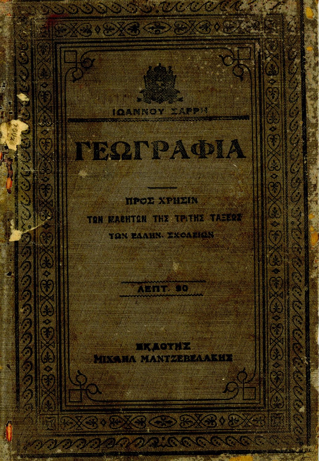 Κωδικός αναγνώρισης: 20-05714 Τίτλος: Γεωγραφία προς χρήσιν των μαθητών της Γ΄ τάξεως των Ελληνικών Σχολείων Συγγραφέας: Ιωάννης Σαρρής Μέγεθος και υπόστρωμα: Σχολικό εγχειρίδιο, 19εκ., σκληρό εξώφυλλο, 102 σελίδες. Σκίτσα (ασπρόμαυρα). |