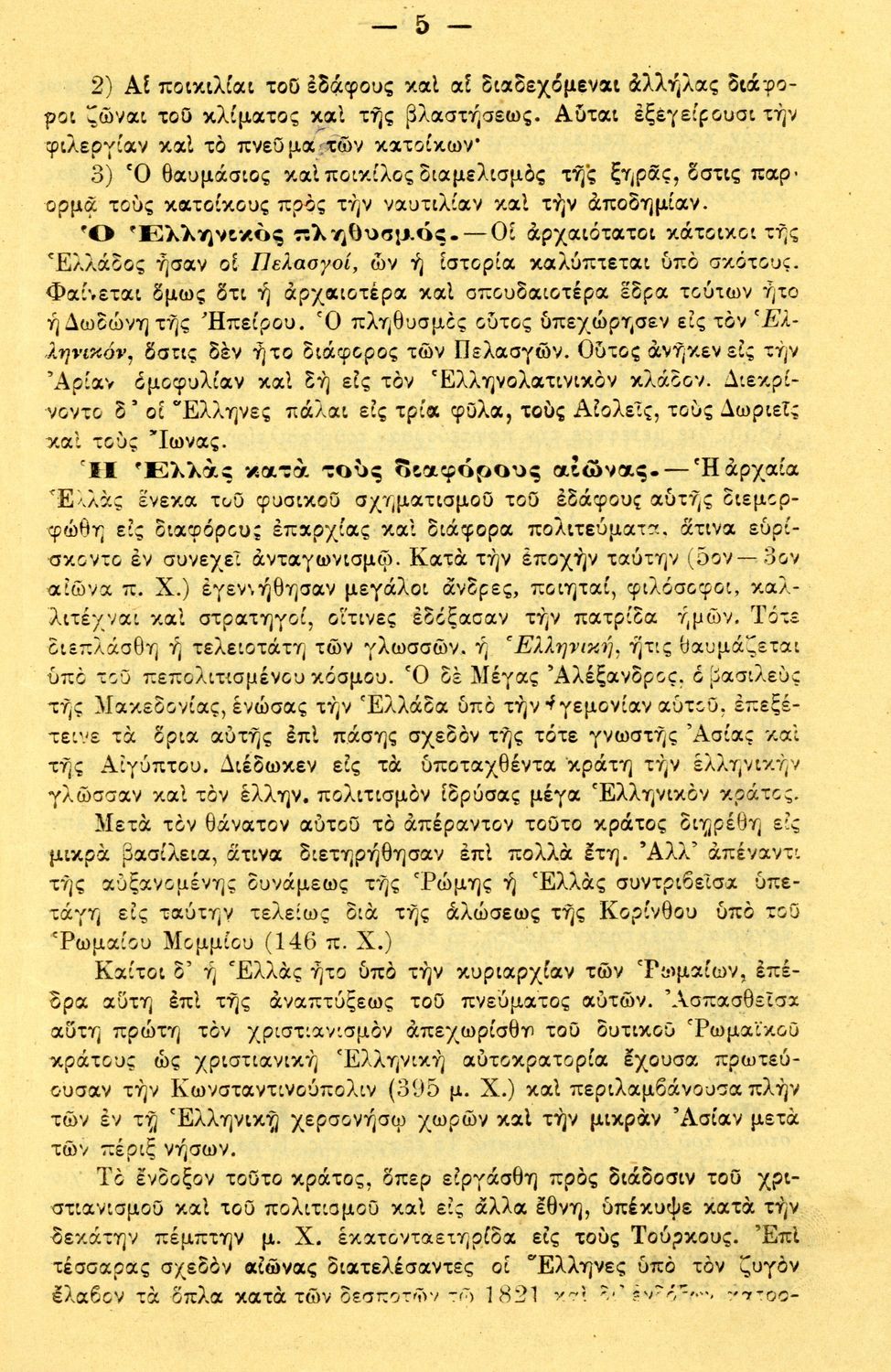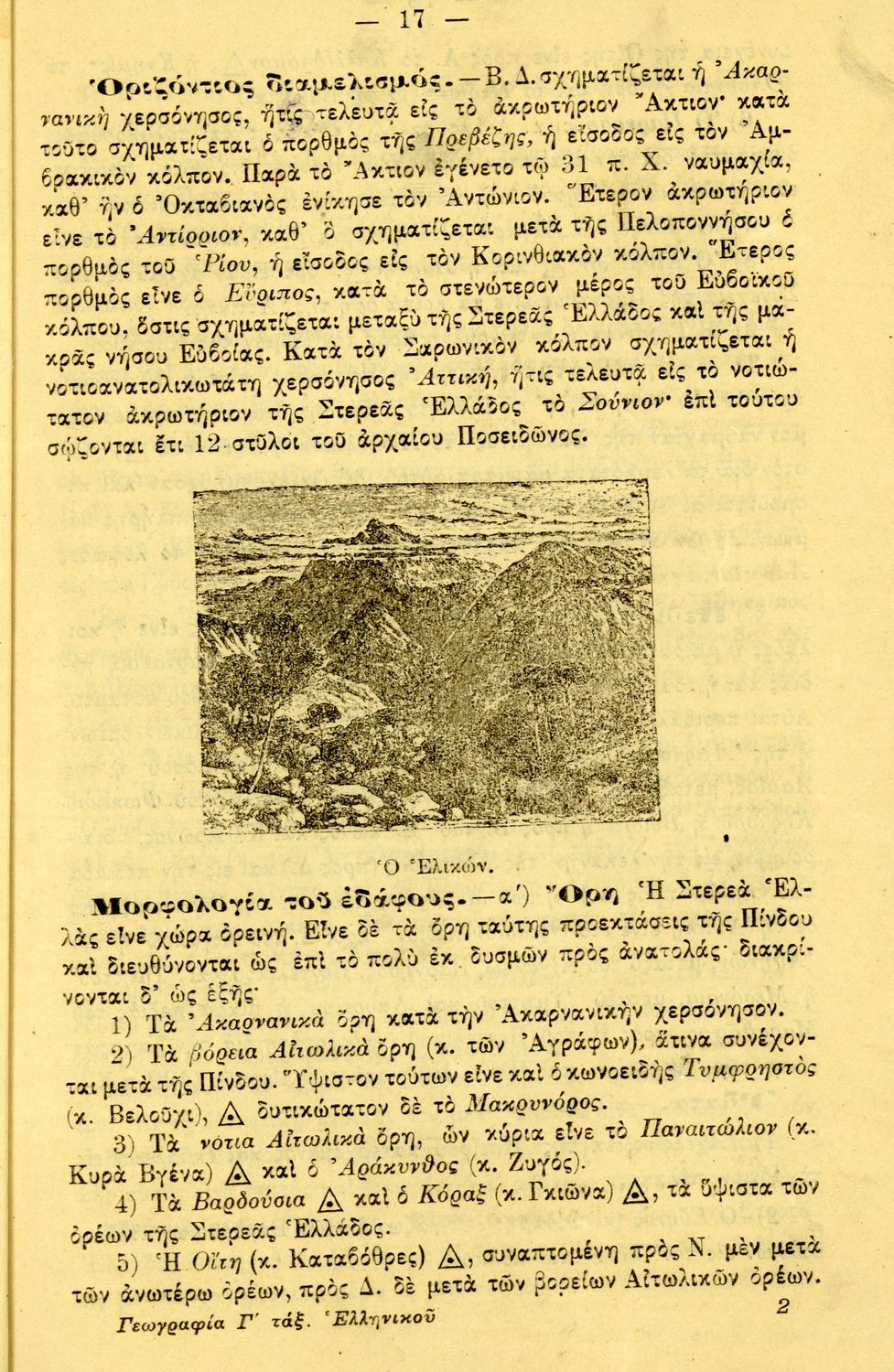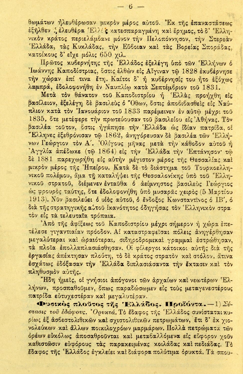 Σχολικό εγχειρίδιο Γεωγραφίας Γ΄ Ελληνικού Σχολείου που αποτελεί μια γενική επισκόπηση της Ελλάδας ανά διαμέρισμα και νομό. Περιέχει και ειδικό κεφάλαιο για τις "λοιπές ελληνικές χώρες" στις οποίες περιλαμβάνονται τα Δωδεκάνησα, η Τουρκική Θράκη, η Ανατολική Ρωμυλία, η Σερβική και Βουλγαρική Μακεδονία, η Μικρά Ασία, η Συρία, η Παλαιστίνη, και η Κύπρος.