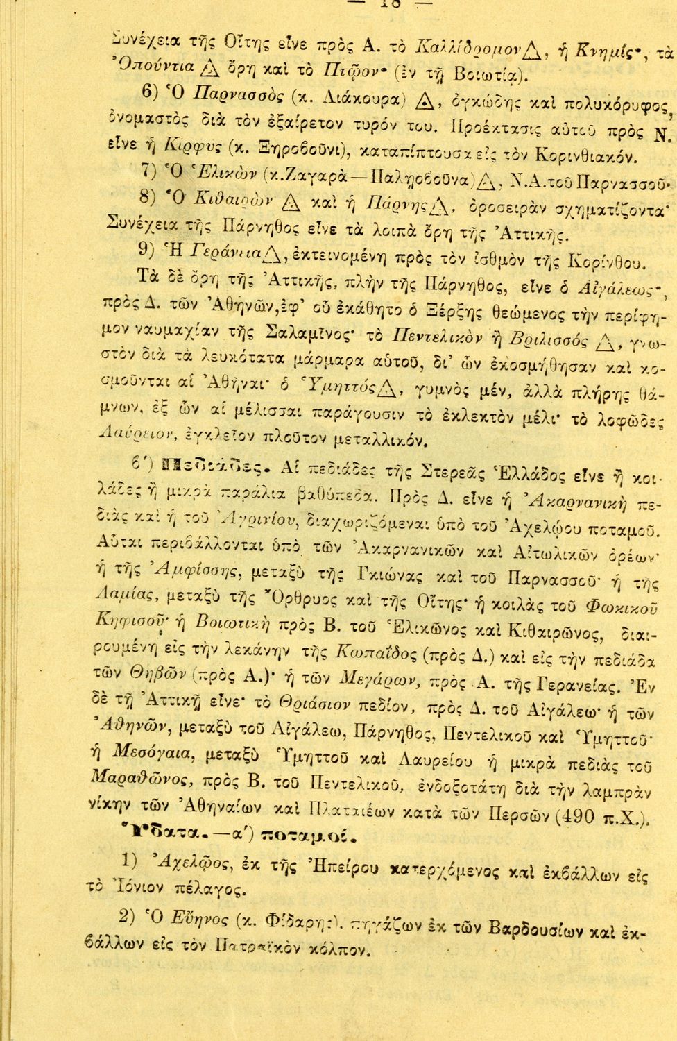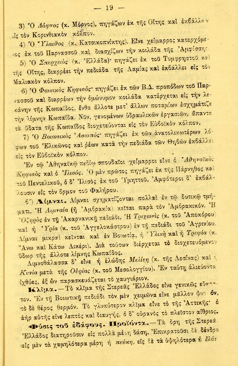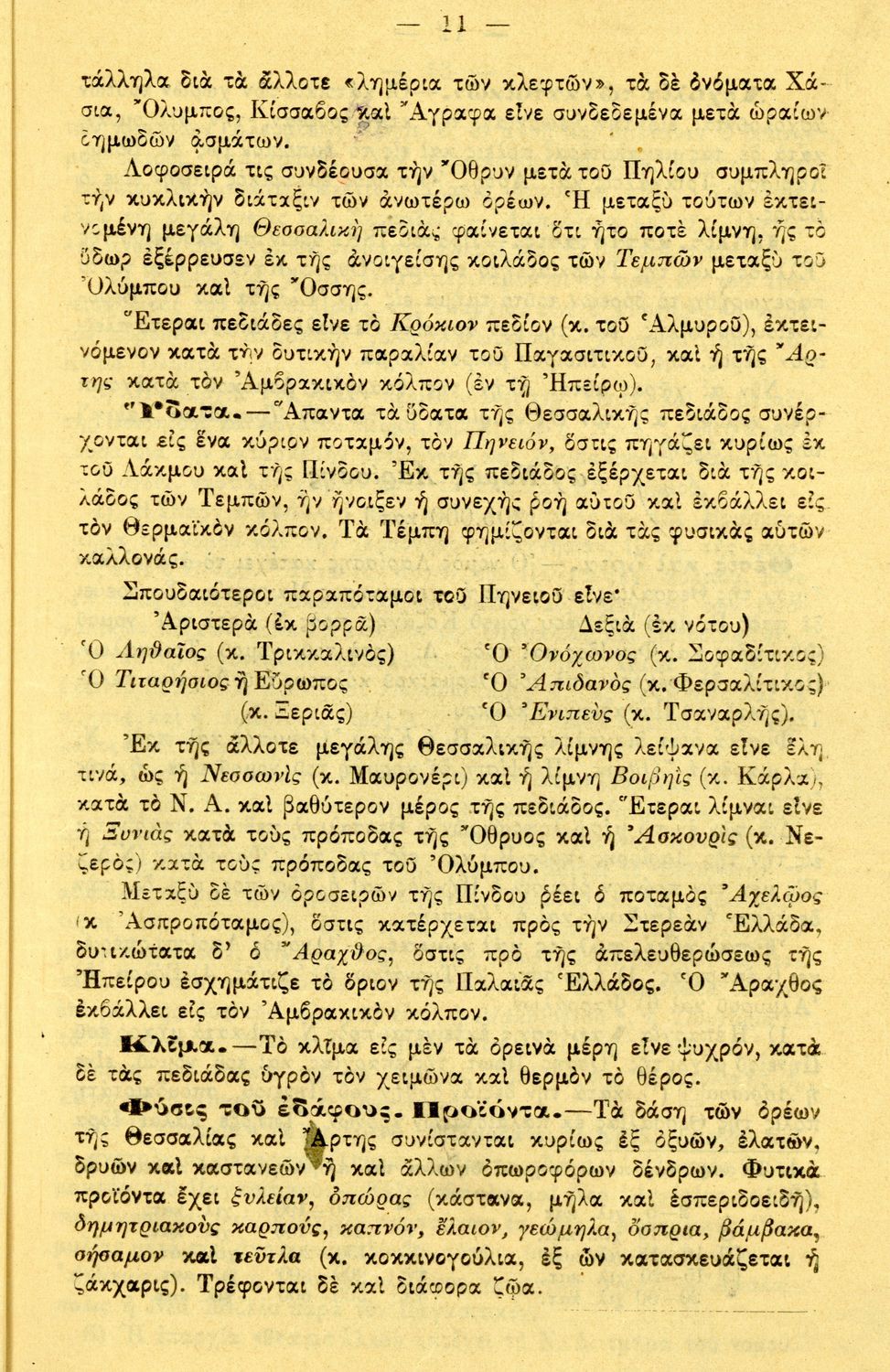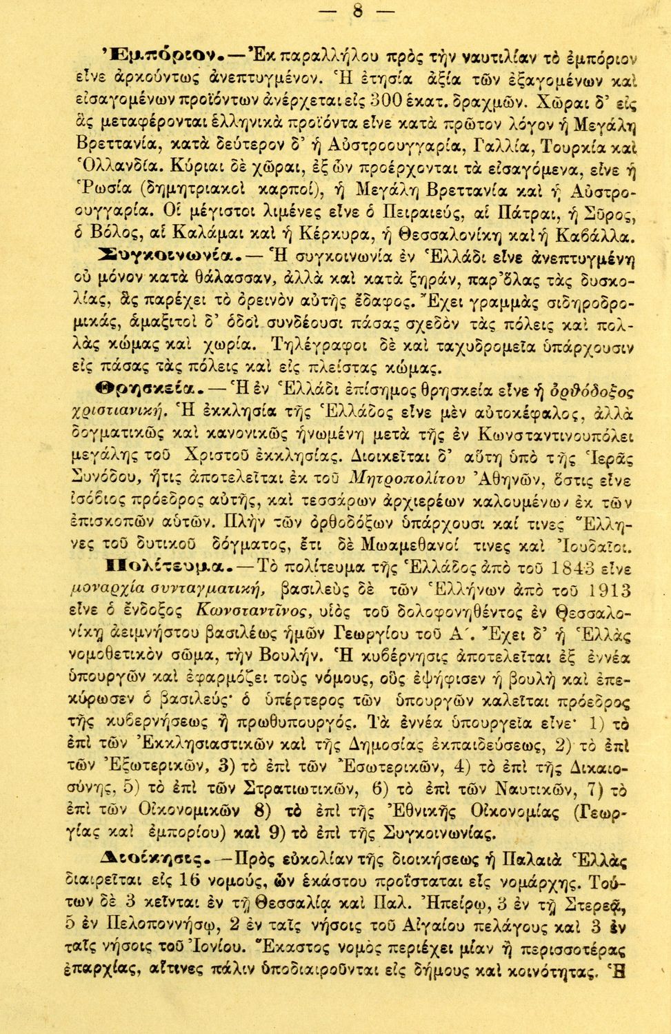 Σχολικό εγχειρίδιο Γεωγραφίας Γ΄ Ελληνικού Σχολείου που αποτελεί μια γενική επισκόπηση της Ελλάδας ανά διαμέρισμα και νομό. Περιέχει και ειδικό κεφάλαιο για τις "λοιπές ελληνικές χώρες" στις οποίες περιλαμβάνονται τα Δωδεκάνησα, η Τουρκική Θράκη, η Ανατολική Ρωμυλία, η Σερβική και Βουλγαρική Μακεδονία, η Μικρά Ασία, η Συρία, η Παλαιστίνη, και η Κύπρος.