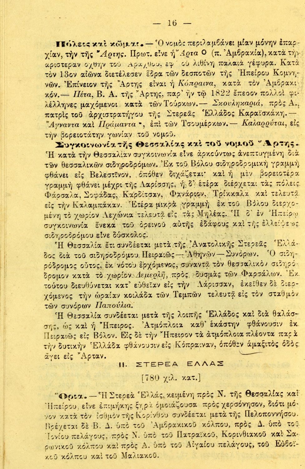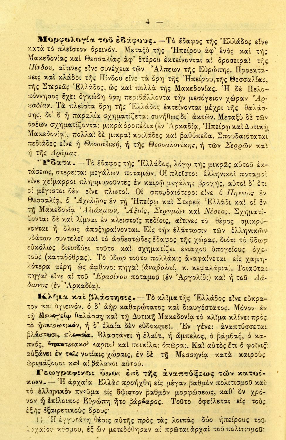 Βαθμίδα εκπαίδευσης: Δευτεροβάθμια Τάξη: Γ' Ελληνικού Σχολείου Μάθημα: Γεωγραφία Γλώσσα: Καθαρεύουσα Παρουσίαση περιεχομένου: Σχολικό εγχειρίδιο Γεωγραφίας Γ΄ Ελληνικού Σχολείου που αποτελεί μια γενική επισκόπηση της Ελλάδας ανά διαμέρισμα και νομό. Περιέχει και ειδικό κεφάλαιο για τις "λοιπές ελληνικές χώρες" στις οποίες περιλαμβάνονται τα Δωδεκάνησα, η Τουρκική Θράκη, η Ανατολική Ρωμυλία, η Σερβική και Βουλγαρική Μακεδονία, η Μικρά Ασία, η Συρία, η Παλαιστίνη, και η Κύπρος. |