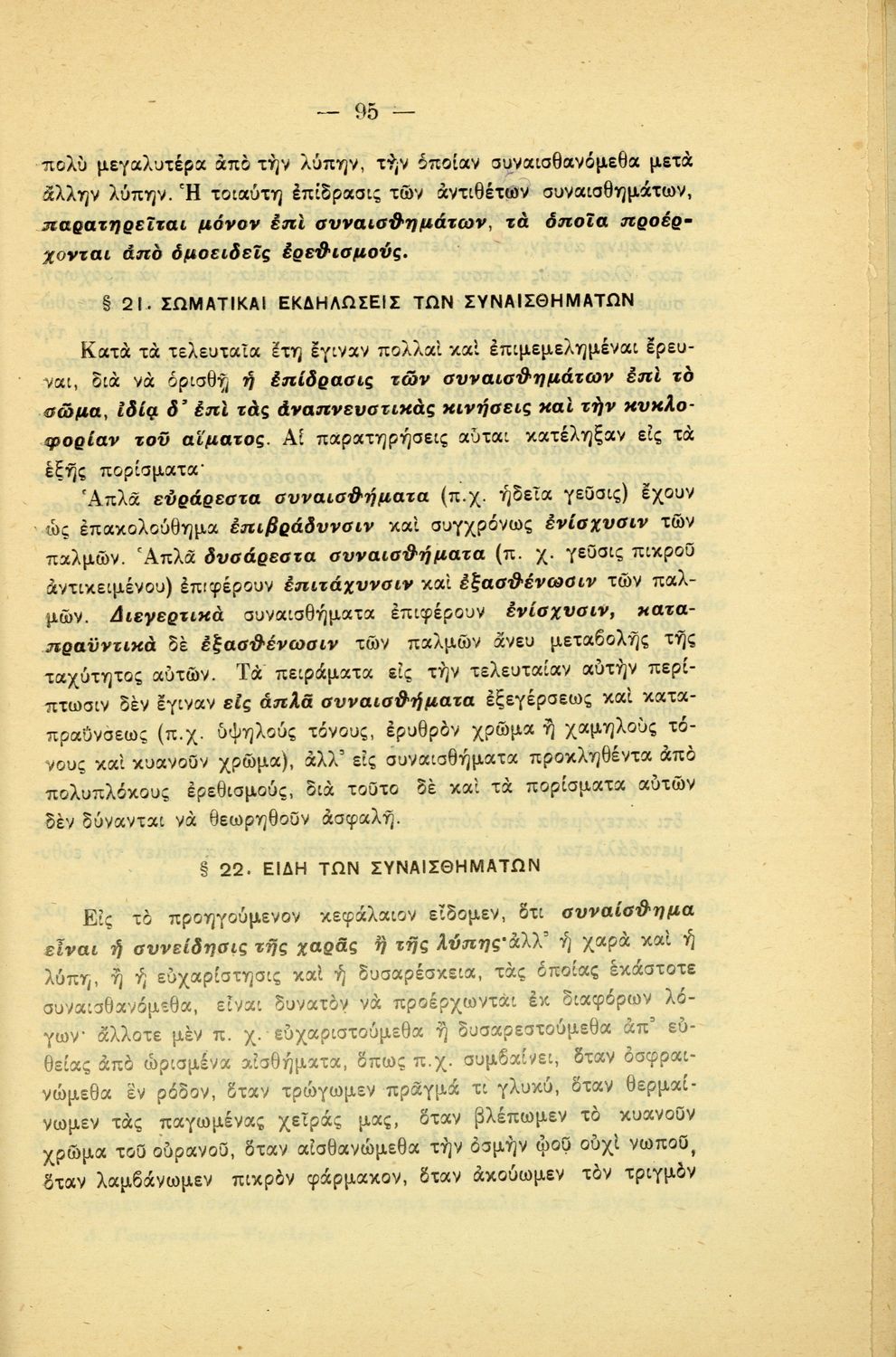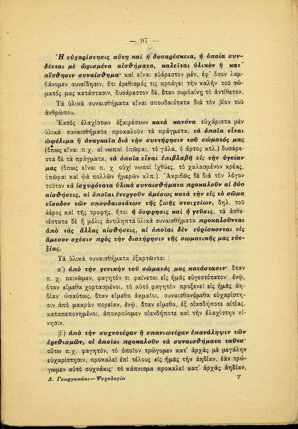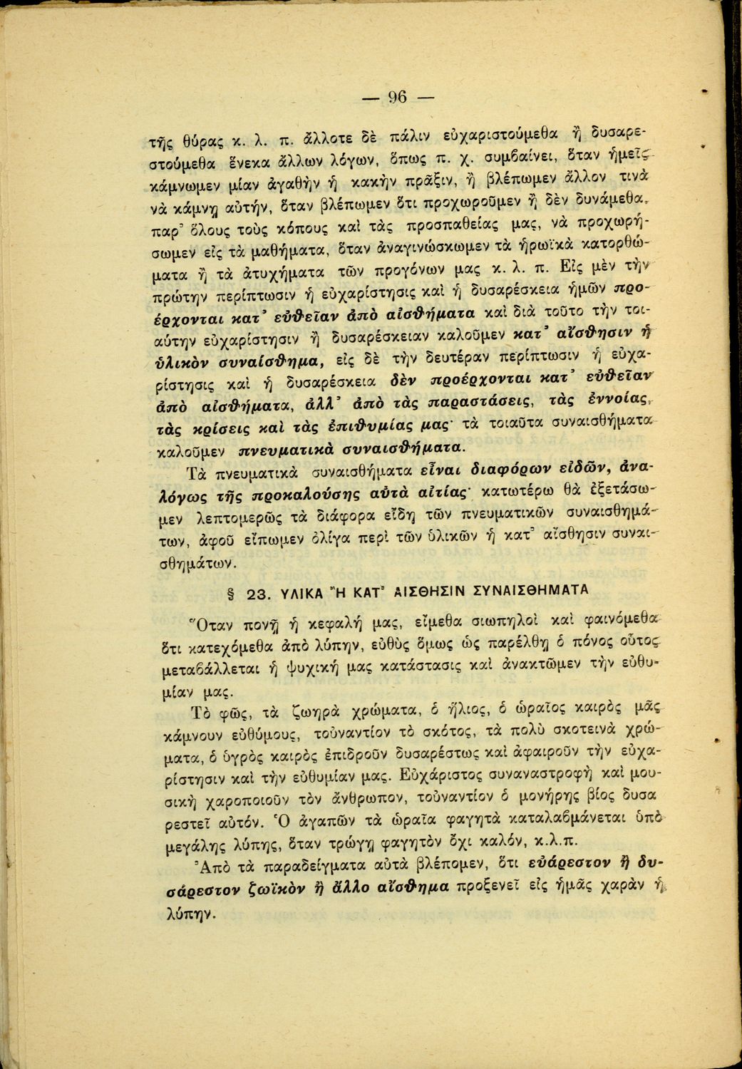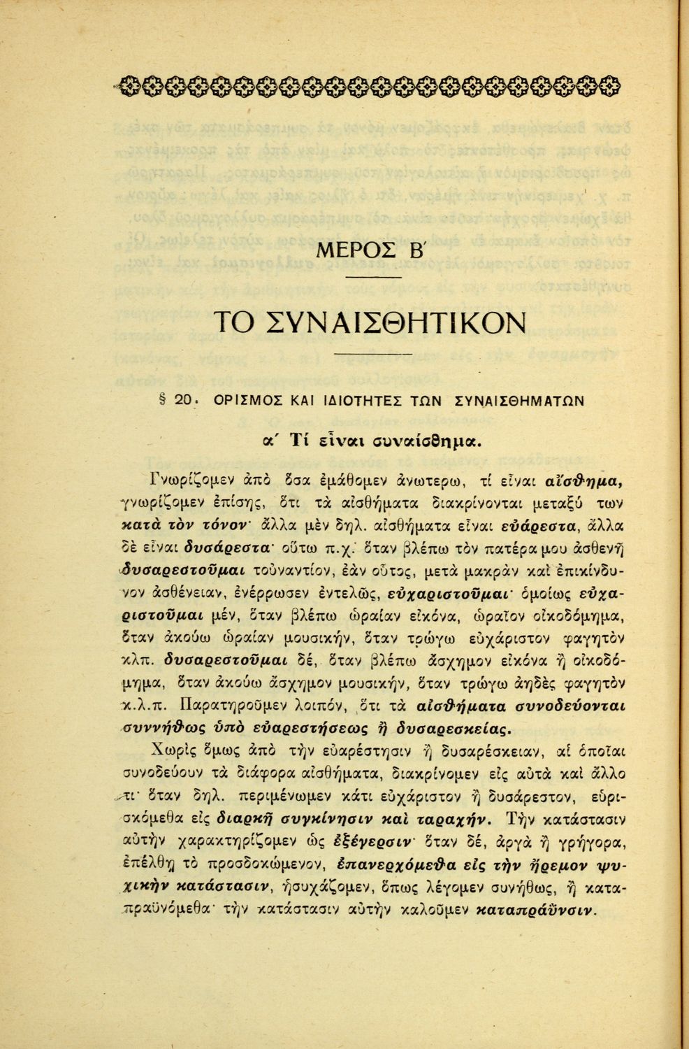 Σχολικό εγχειρίδιο Πειραματικής Ψυχολογίας για τη Γ΄ Γυμνασίου χωρισμένο σε τρία τμήματα: το παριστάναι, το συναισθάνεσθαι, και το βούλεσθαι.