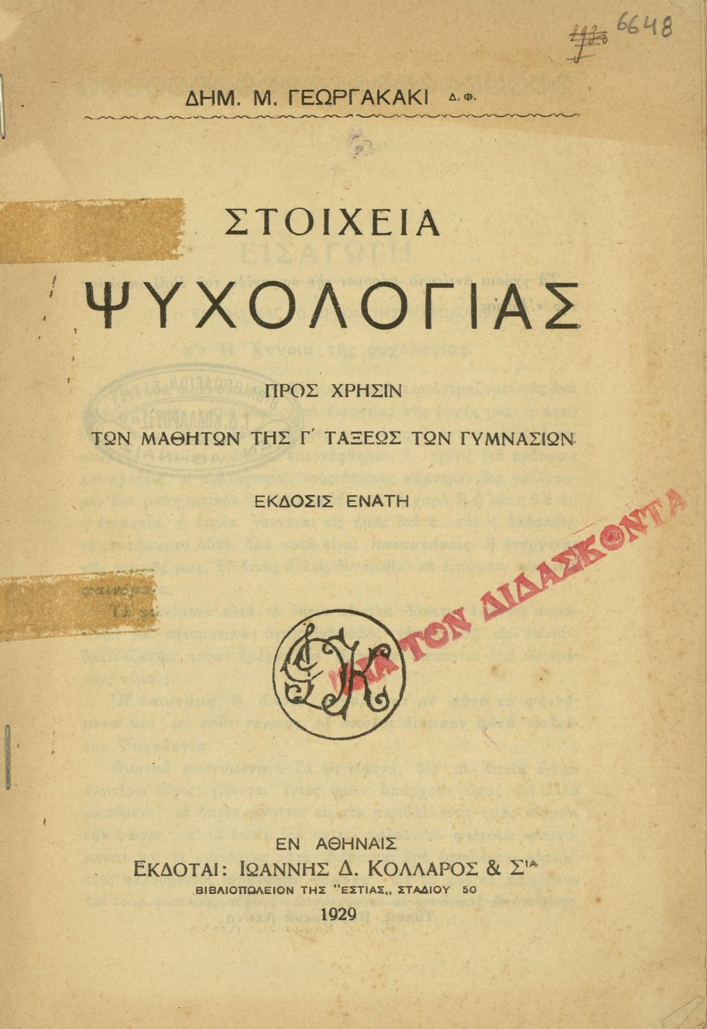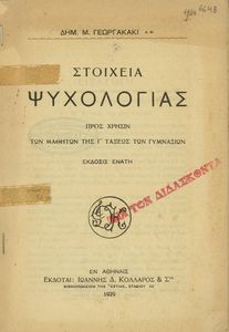 Κωδικός αναγνώρισης: 20-06648 Τίτλος: Στοιχεία ψυχολογίας προς χρήσιν των μαθητών της Γ΄ τάξεως των Γυμνασίων Συγγραφέας: Δημ. Μ. Γεωργακάκις Μέγεθος και υπόστρωμα: Σχολικό εγχειρίδιο, 21εκ., μαλακό εξώφυλλο, 144 σελίδες. |