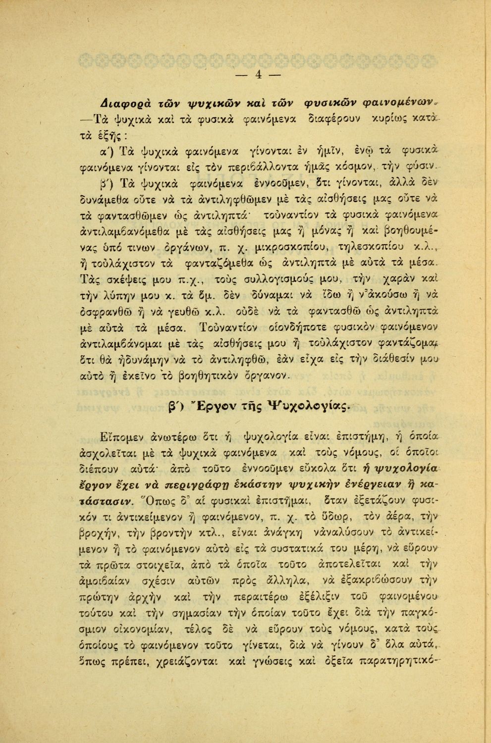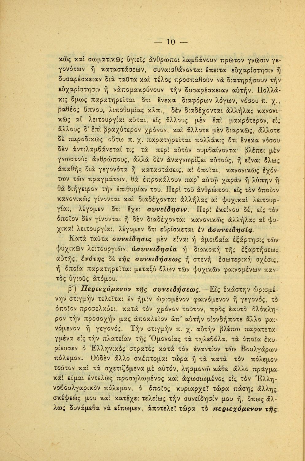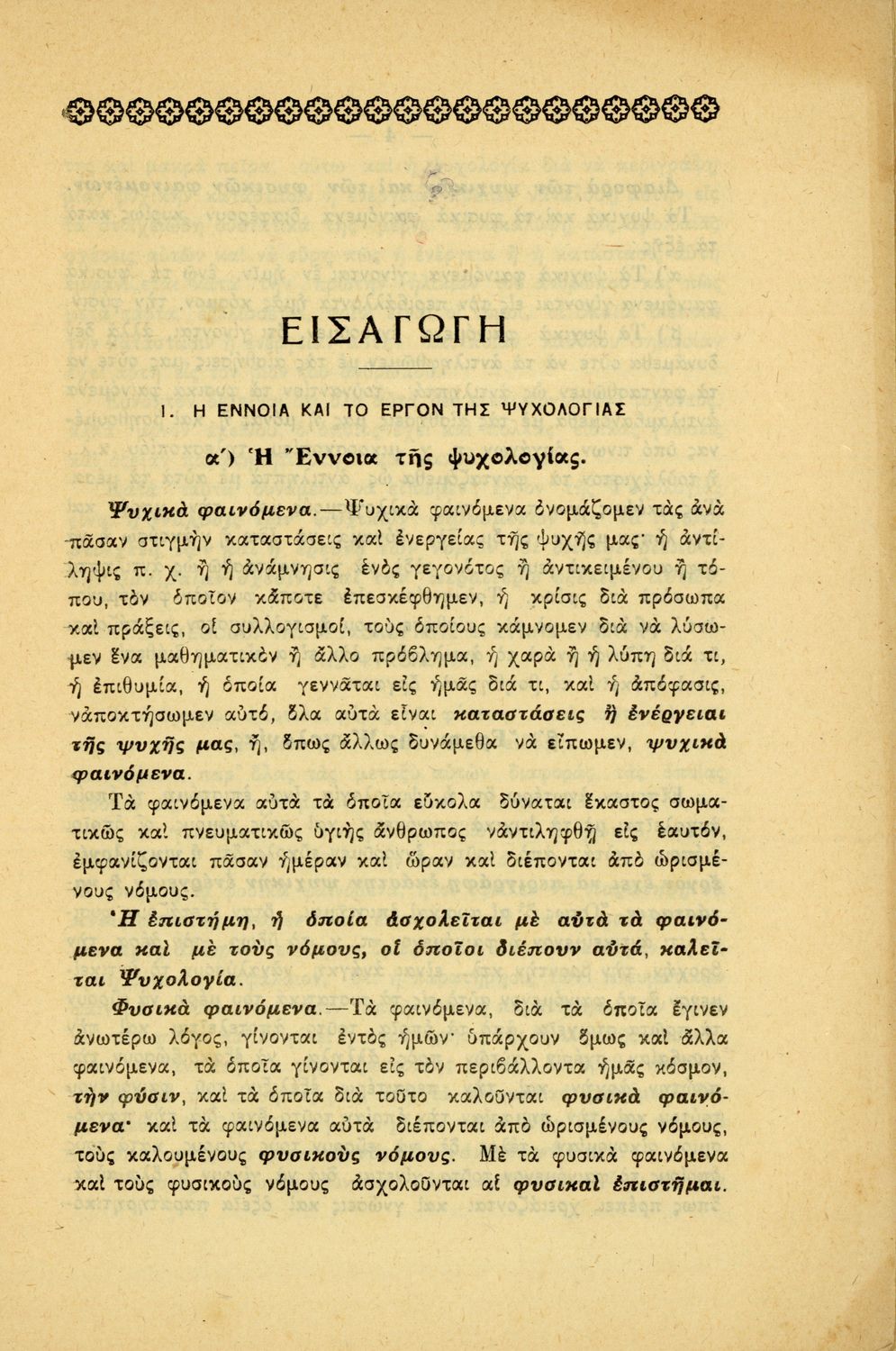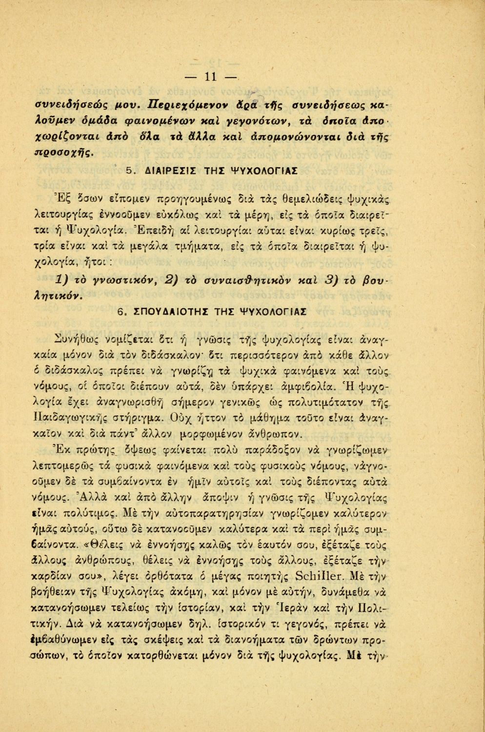 Βαθμίδα εκπαίδευσης: Δευτεροβάθμια Τάξη: Γ' Γυμνασίου Μάθημα: Ψυχολογία Γλώσσα: Καθαρεύουσα Παρουσίαση περιεχομένου: Σχολικό εγχειρίδιο Εμπειρικής Ψυχολογίας για τη Γ΄ Γυμνασίου χωρισμένο σε τρία τμήματα: το γνωστικό, το συναισθηματικό και το βουλητικό. Εξετάζει και τις ανωμαλίες της συνείδησης. |
