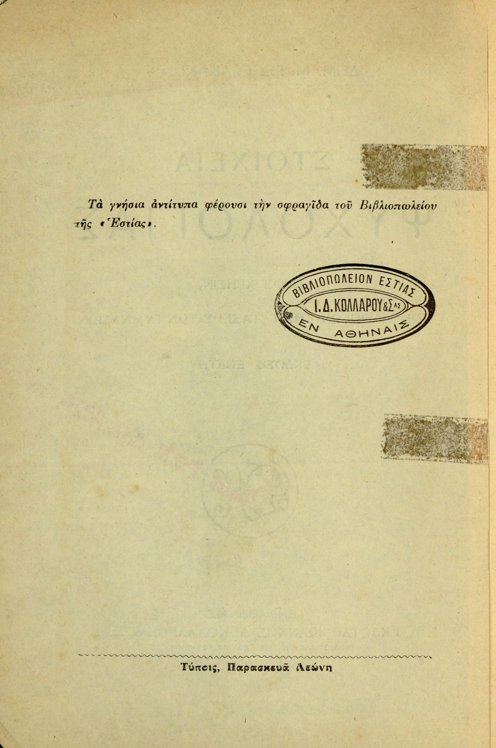 Εκδότης: Ιωάννης Δ. Κολλάρος, Βιβλιοπωλείο της "Εστίας" Έτος έκδοσης: 1929 Τόπος έκδοσης: Αθήνα Έκδοση: 9η |