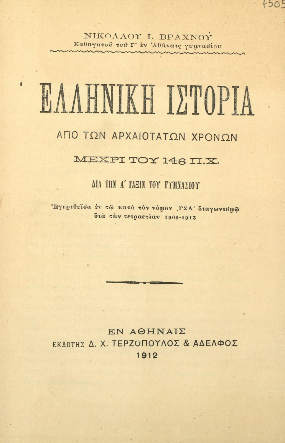 LDR 01228 2200193 4500 035 ## _a20-07505 040 ## _aΚΕΝΕΚ - Εταιρεία Σπουδών Νεοελληνικού Πολιτισμού και Παιδείας 041 ## _ael 100 ## _aΝικόλαος Ι. Βραχνός 110 ## _a7505 245 0# _aΕλληνική ιστορία από των αρχαιοτάτων χρόνων μέχρι του 146 π. Χ. διά την Α΄ τάξιν του Γυμνασίου 260 ## _aΑθήνα _bΔ.Χ. Τερζόπουλος _c1912 300 ## _a218 _c21 520 ## _aΣχολικό εγχειρίδιο Ιστορίας Α΄ Γυμνασίου που καλύπτει την περίοδο από τους προϊστορικούς χρόνους μέχρι την κατάληψη της Ελλάδας από τους Ρωμαίους. 521 ## _aΑ' Γυμνασίου 522 ## _aΕλλάδα 546 ## _aΚαθαρεύουσα 563 ## _aΜαλακό Εξώφυλλο 650 #4 _aΑθήνα _aΑλκιβιάδης _aΑνατολικοί λαοί _aΔράκων _aΜ Αλέξανδρος _aΜηδικά _aΠελοποννησιακός πόλεμος _aΠερικλής _aΡωμαίοι _aΣόλων _aΣπάρτη