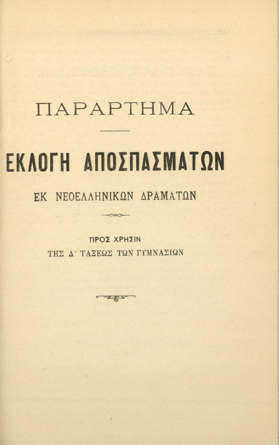 Τίτλος: Εκλογή αναγνωσμάτων εκ ξένων λογοτεχνιών εν μεταφράσει προς χρήσιν της Γ΄ τάξεως των Τριτάξιων Διδασκαλείων αμφοτέρων των φύλων και των Μονοτάξιων Διδασκαλείων έτι δε της Γ΄ και Δ΄ τάξεως των Γυμνασίων μετά βιογραφικών σημειώσεων και εικόνων