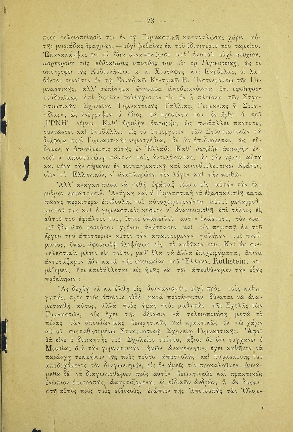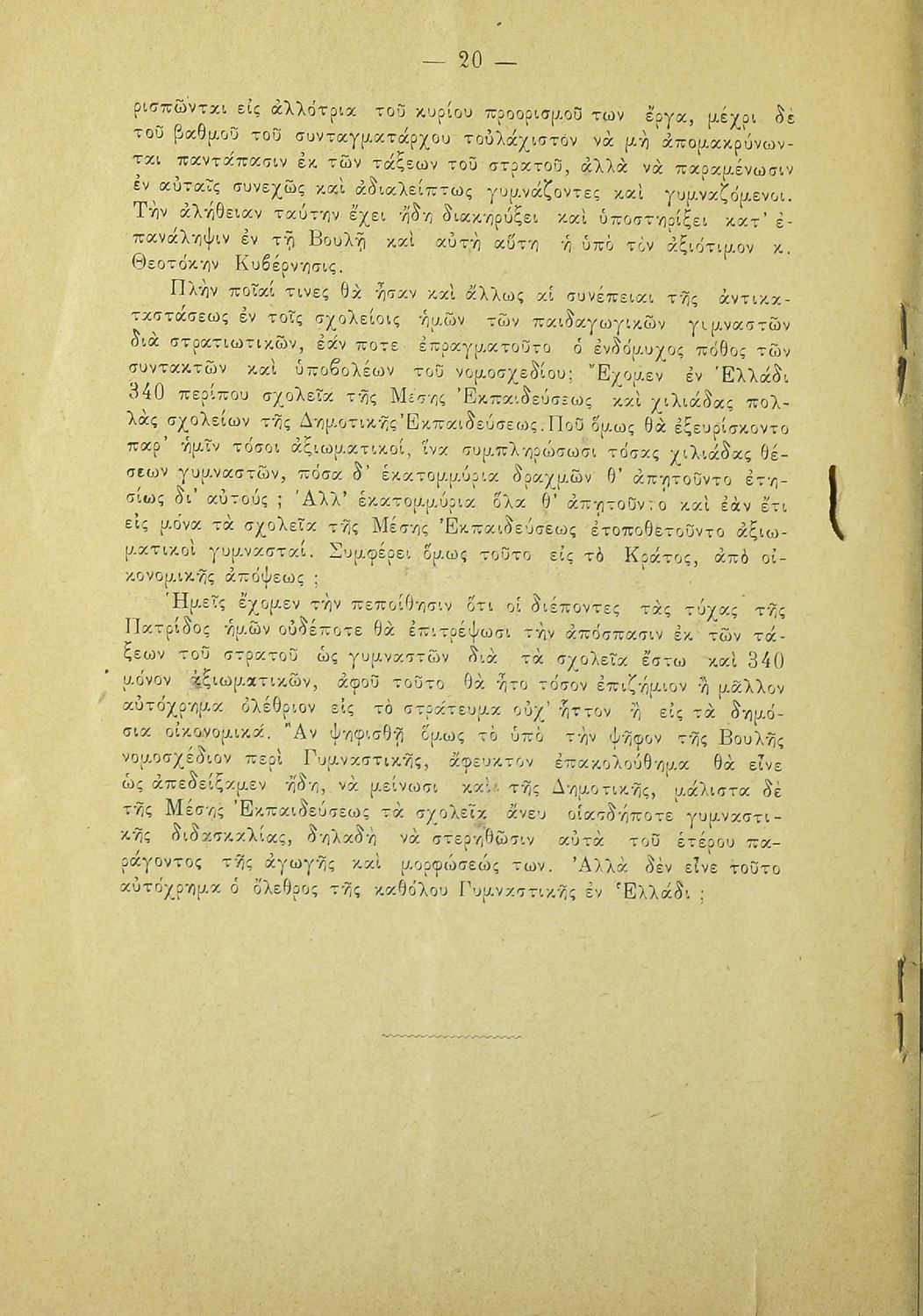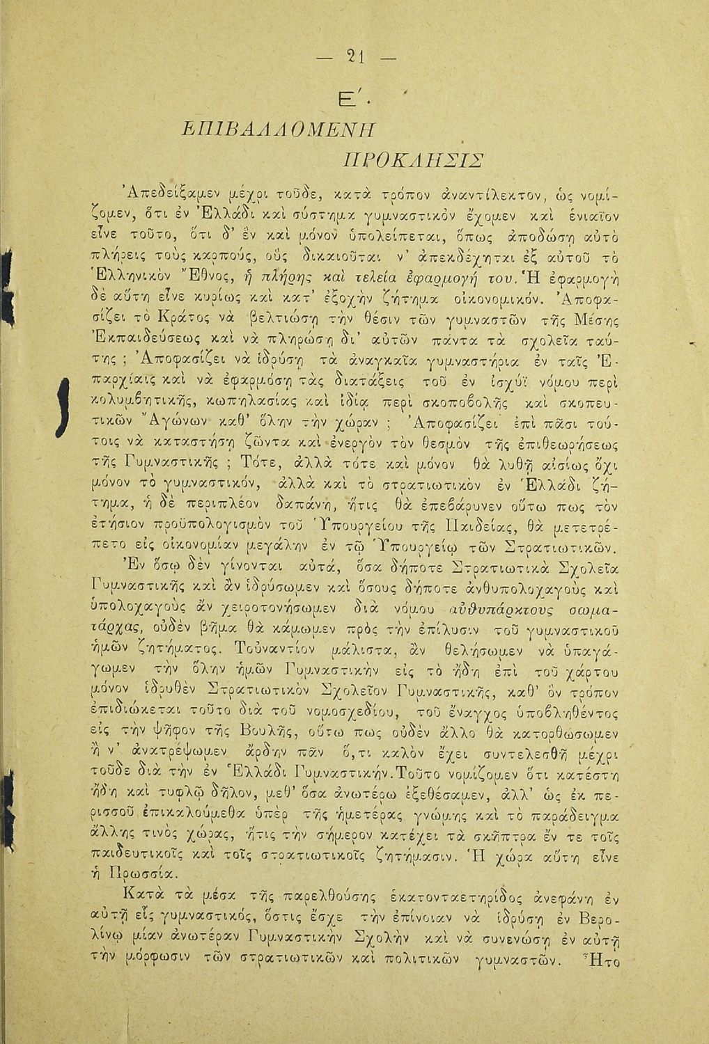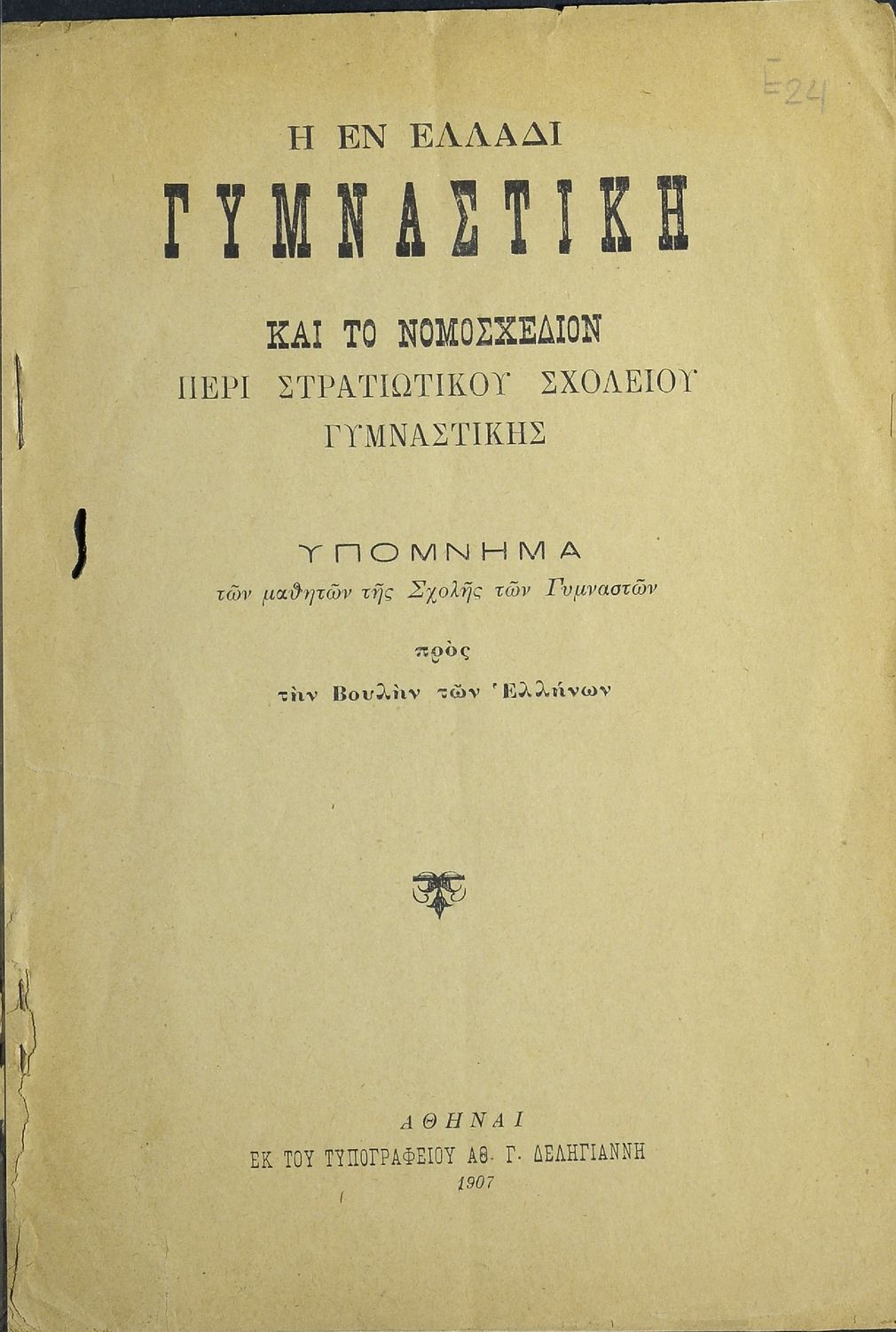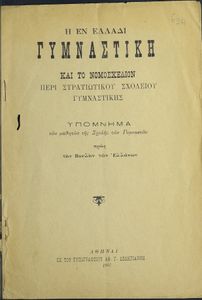 Κωδικός αναγνώρισης: 20-E0024 Τίτλος: Η εν Ελλάδι γυμναστική και το νομοσχέδιον περί στρατιωτικού σχολείου γυμναστικής. Υπόμνημα των μαθητών της Σχολής των Γυμναστών προς την Βουλήν των Ελλήνων Μέγεθος και υπόστρωμα: Άλλο, 21εκ., μαλακό εξώφυλλο, 24 σελίδες. |