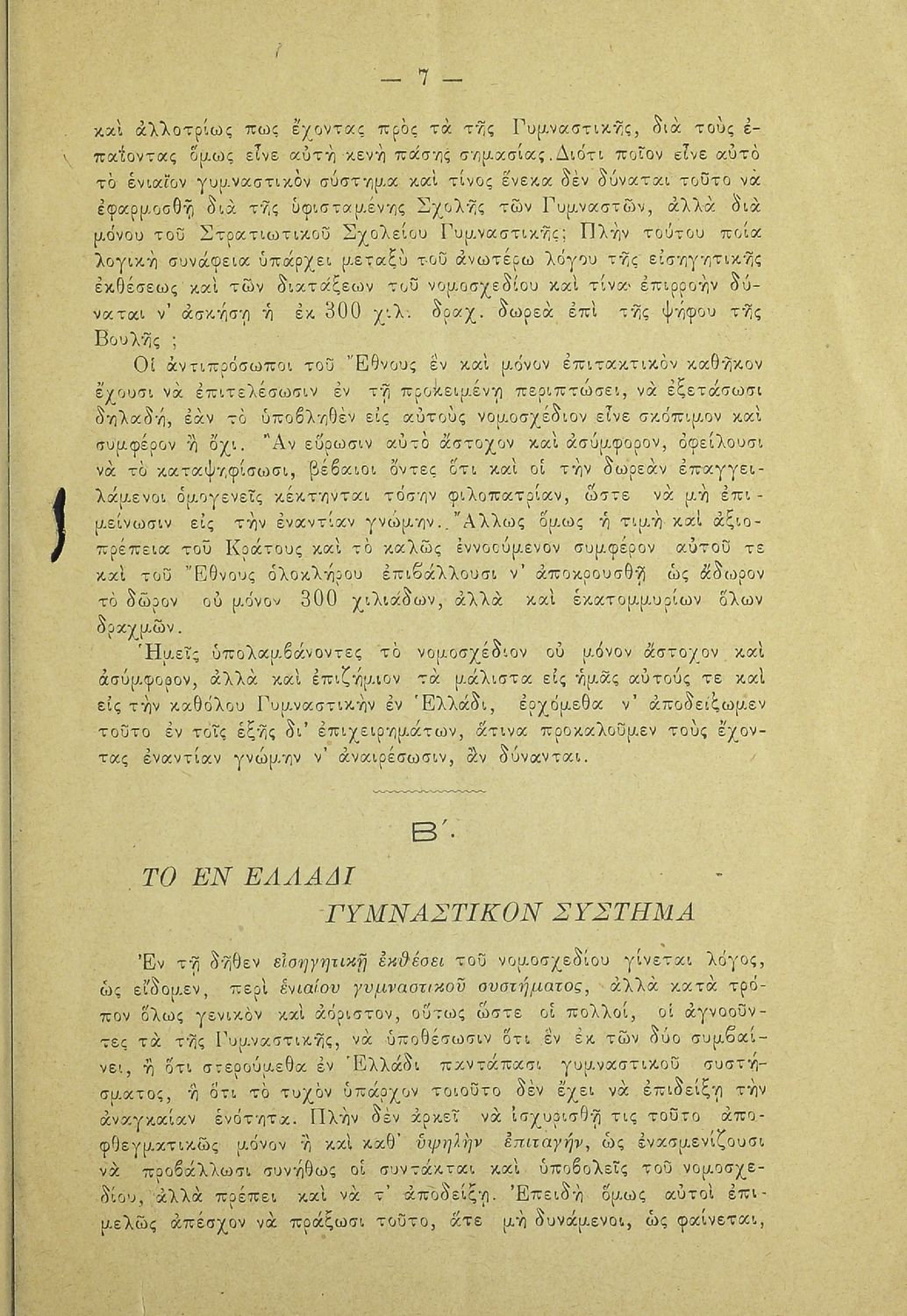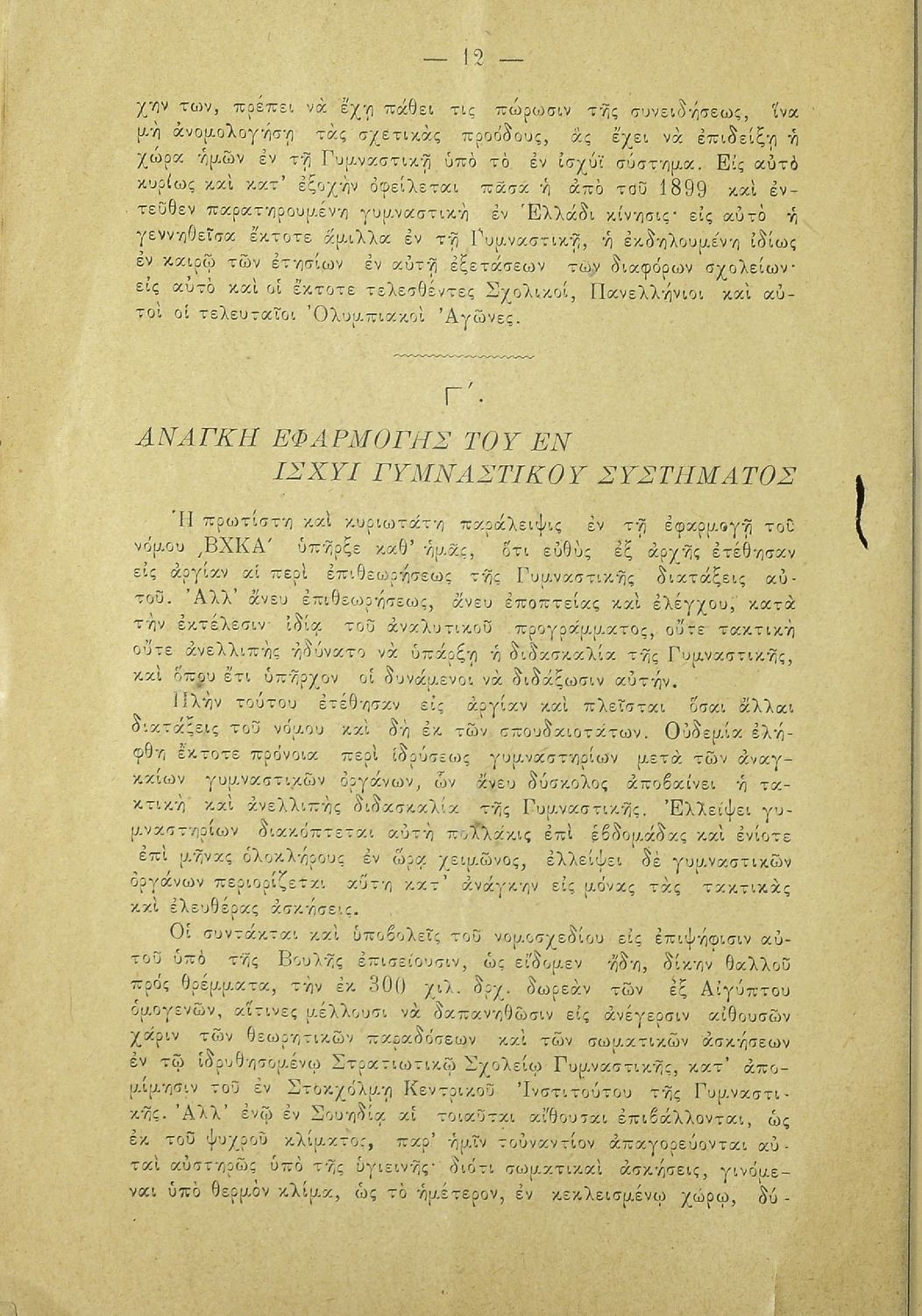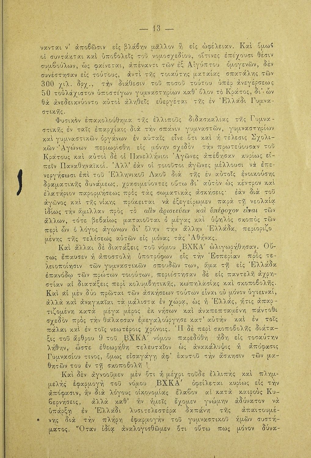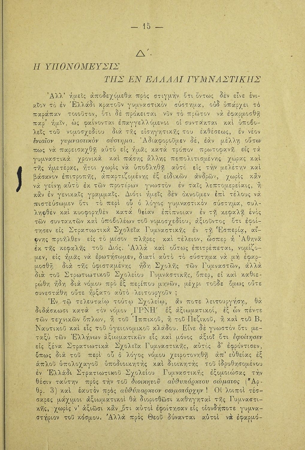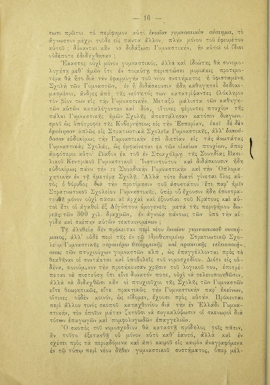 Κωδικός αναγνώρισης: 20-E0024 Τίτλος: Η εν Ελλάδι γυμναστική και το νομοσχέδιον περί στρατιωτικού σχολείου γυμναστικής. Υπόμνημα των μαθητών της Σχολής των Γυμναστών προς την Βουλήν των Ελλήνων Μέγεθος και υπόστρωμα: Άλλο, 21εκ., μαλακό εξώφυλλο, 24 σελίδες. |
