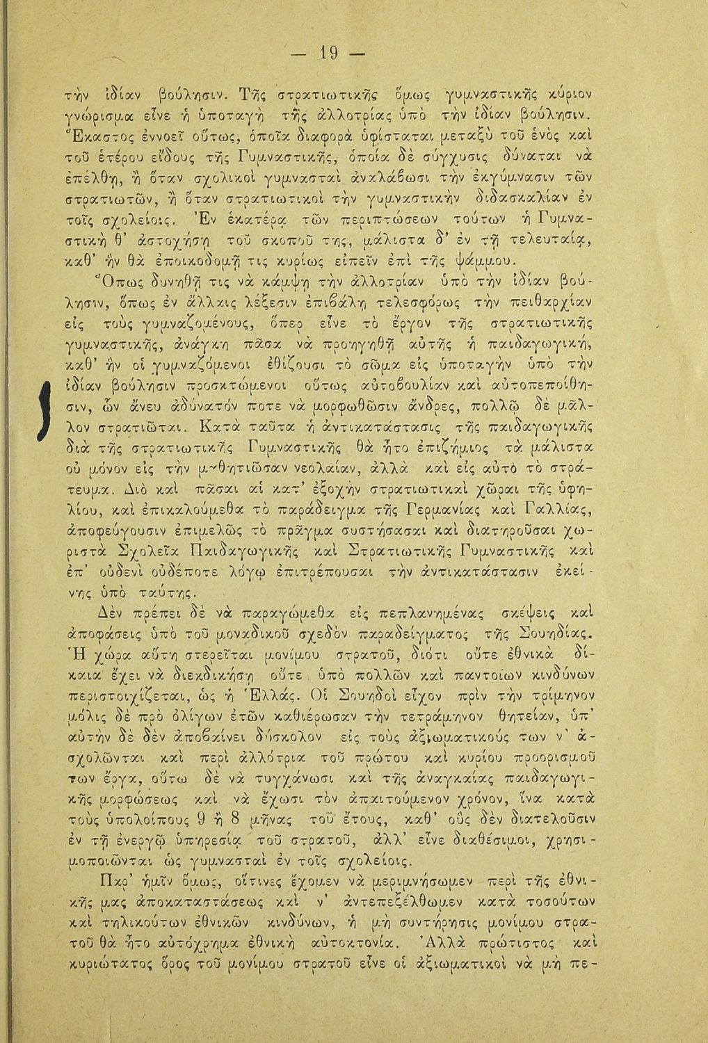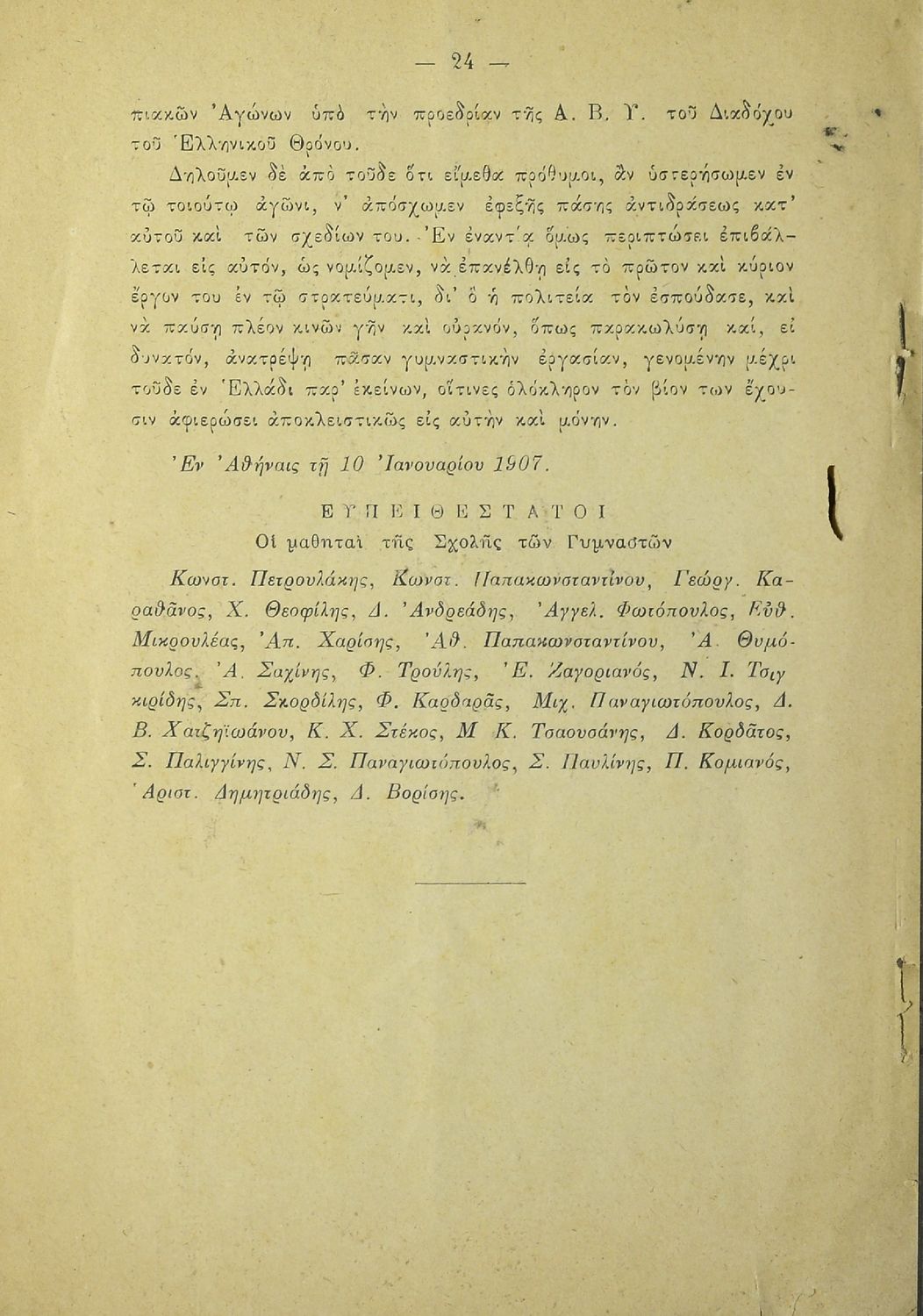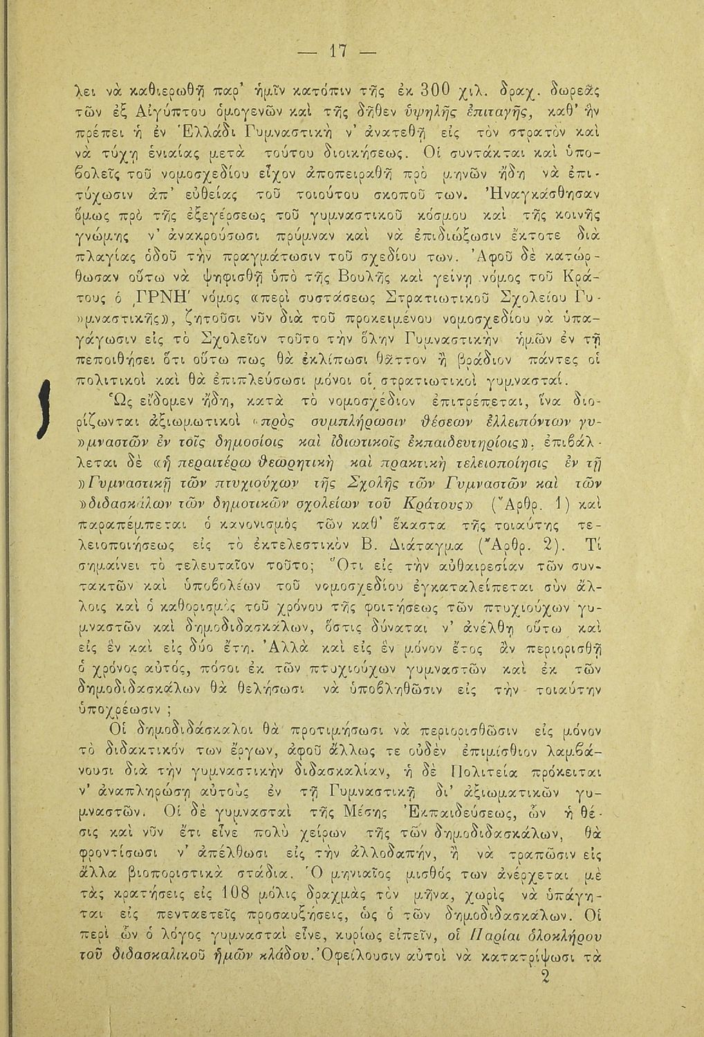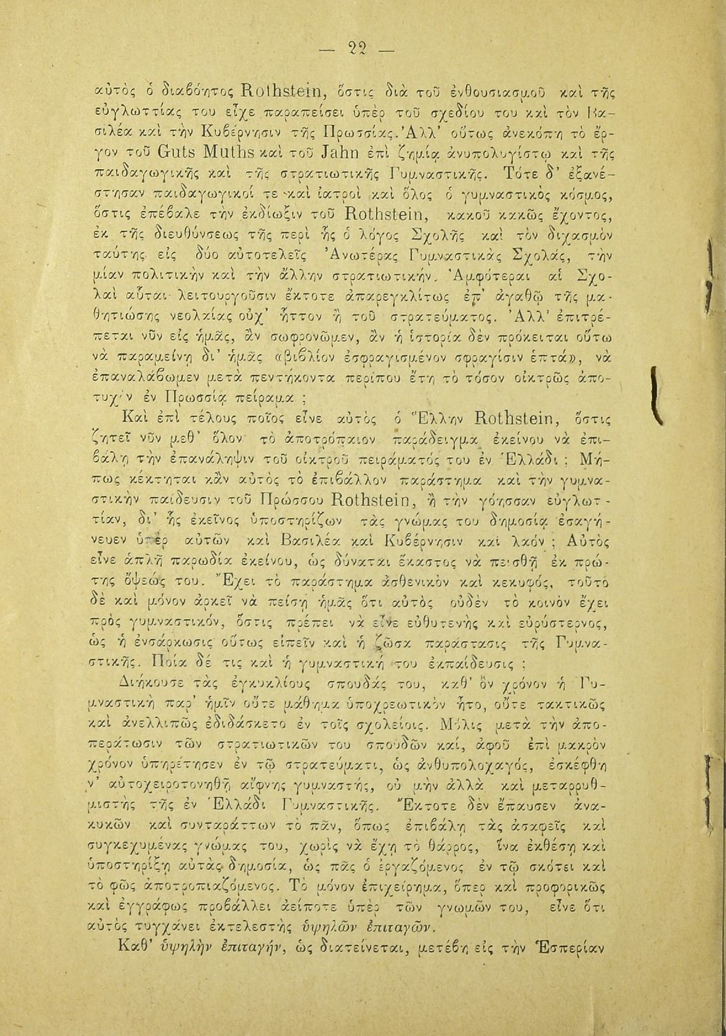 Κωδικός αναγνώρισης: 20-E0024 Τίτλος: Η εν Ελλάδι γυμναστική και το νομοσχέδιον περί στρατιωτικού σχολείου γυμναστικής. Υπόμνημα των μαθητών της Σχολής των Γυμναστών προς την Βουλήν των Ελλήνων Μέγεθος και υπόστρωμα: Άλλο, 21εκ., μαλακό εξώφυλλο, 24 σελίδες. |