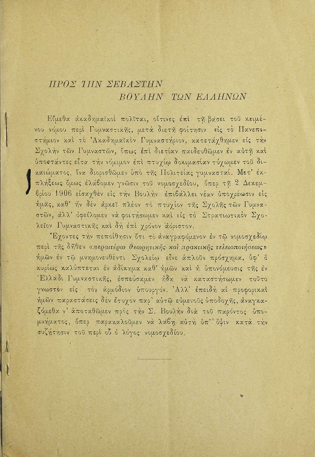 Υπόμνημα που υπέβαλαν στην Βουλή των Ελλήνων οι μαθητές της Γυμναστικής Ακαδημίας για να σχολιάσουν το σύστημα γυμναστικής εκπαίδευσης στην Ελλάδα, το νέο εκπαιδευτικό σύστημα γυμναστικής και την προσπάθεια υπονόμευσής του.