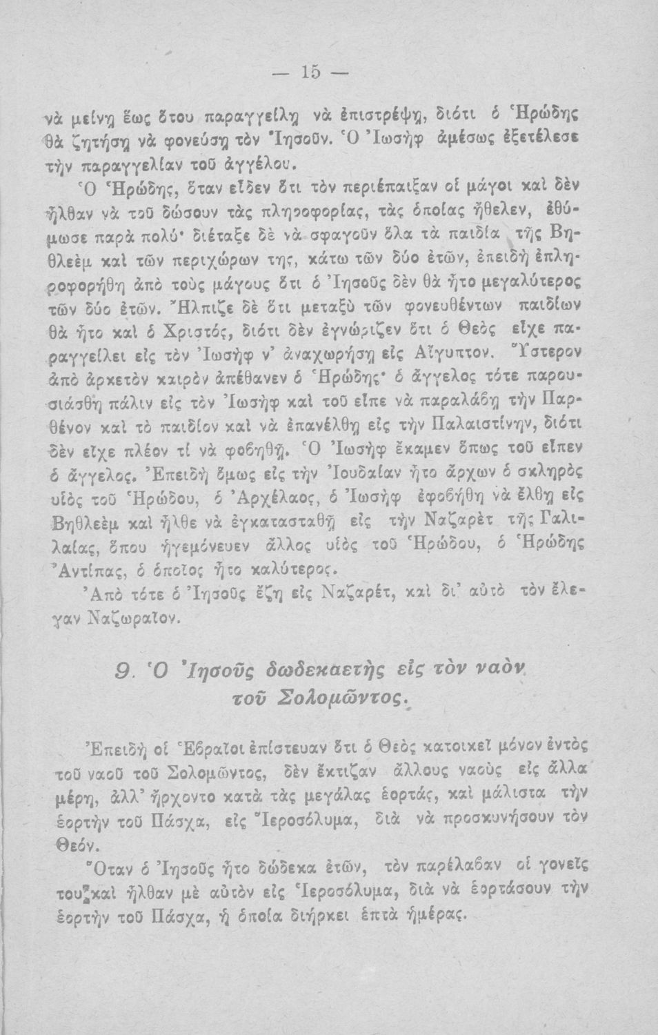 Σχολικό εγχειρίδιο Θρησκευτικών για τα Ελληνικά Σχολεία και τα Παρθεναγωγεία που περιλαμβάνει την ιστορία της Καινής Διαθήκης από τον Ευαγγελισμό της Θεοτόκου μέχρι την ανάληψη του Ιησού Χριστού