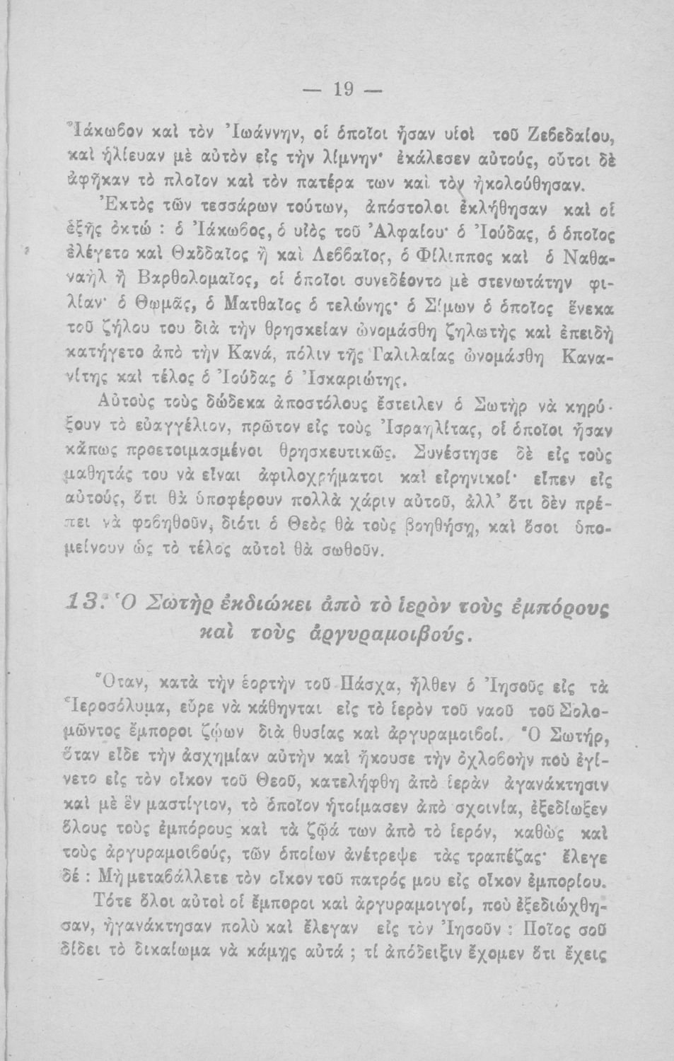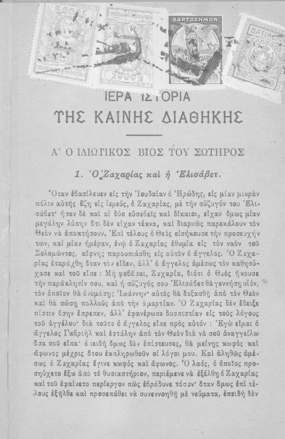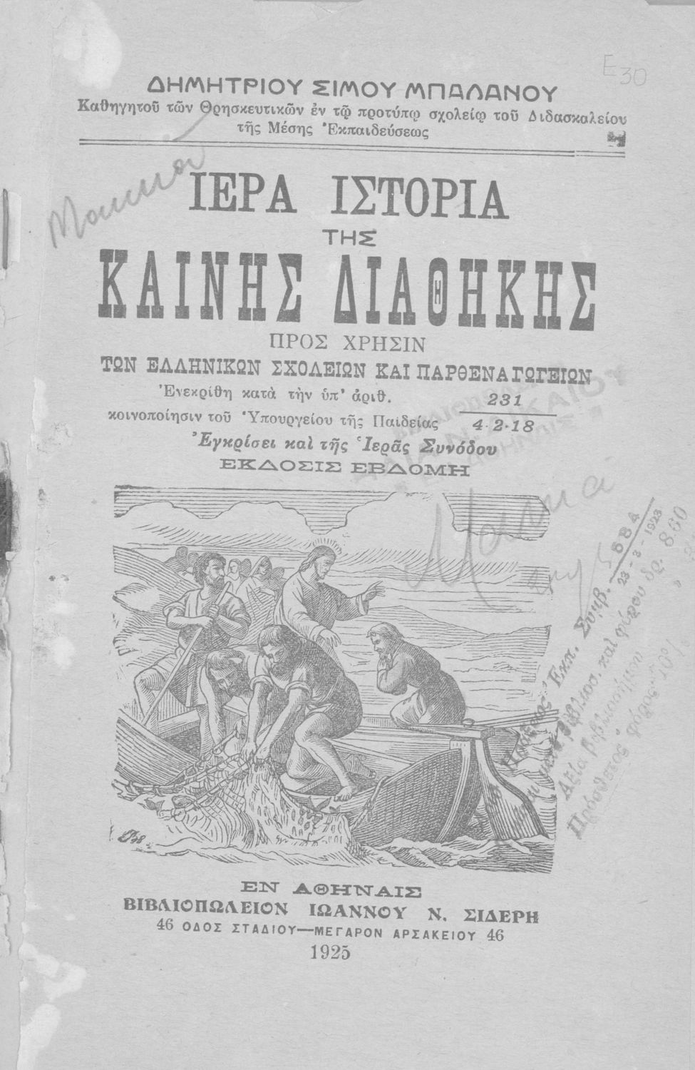 Σχολικό εγχειρίδιο Θρησκευτικών για τα Ελληνικά Σχολεία και τα Παρθεναγωγεία που αποτελεί μια εξιστόρηση της Καινής Διαθήκης από την γέννηση του Ιησού Χριστού ως το έργο των Αποστόλων