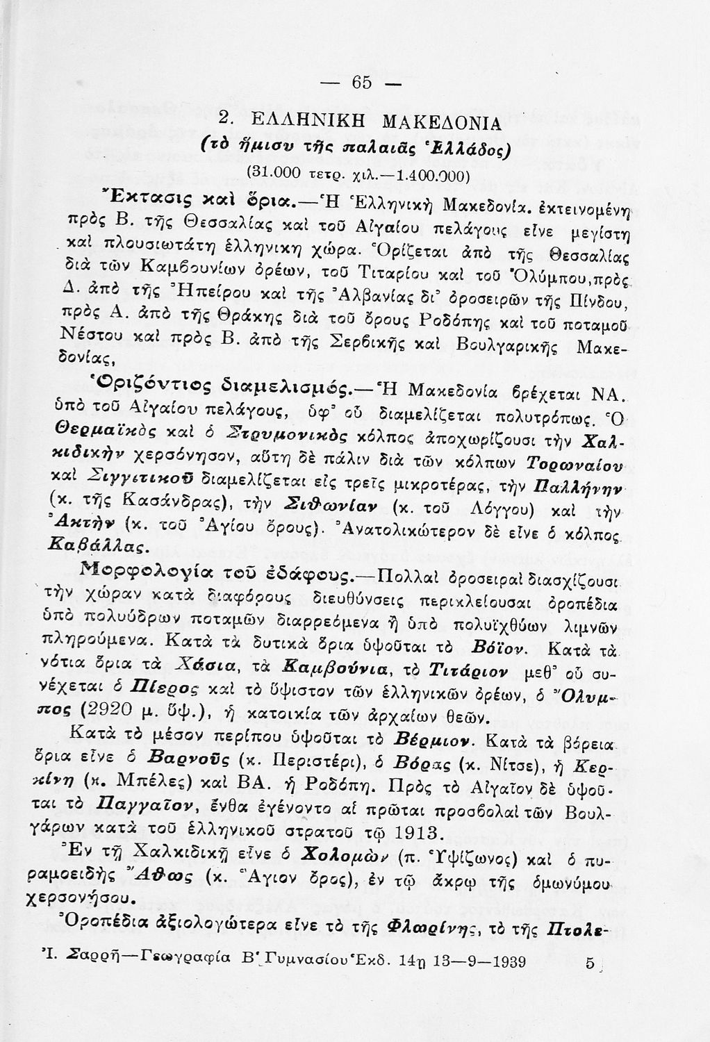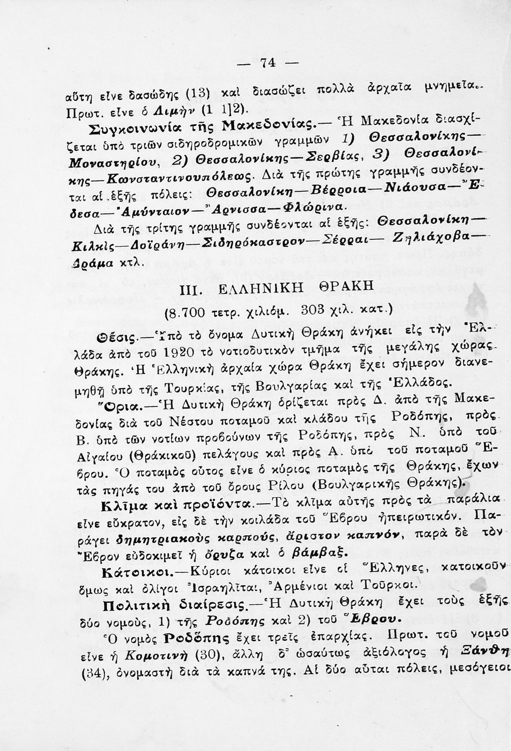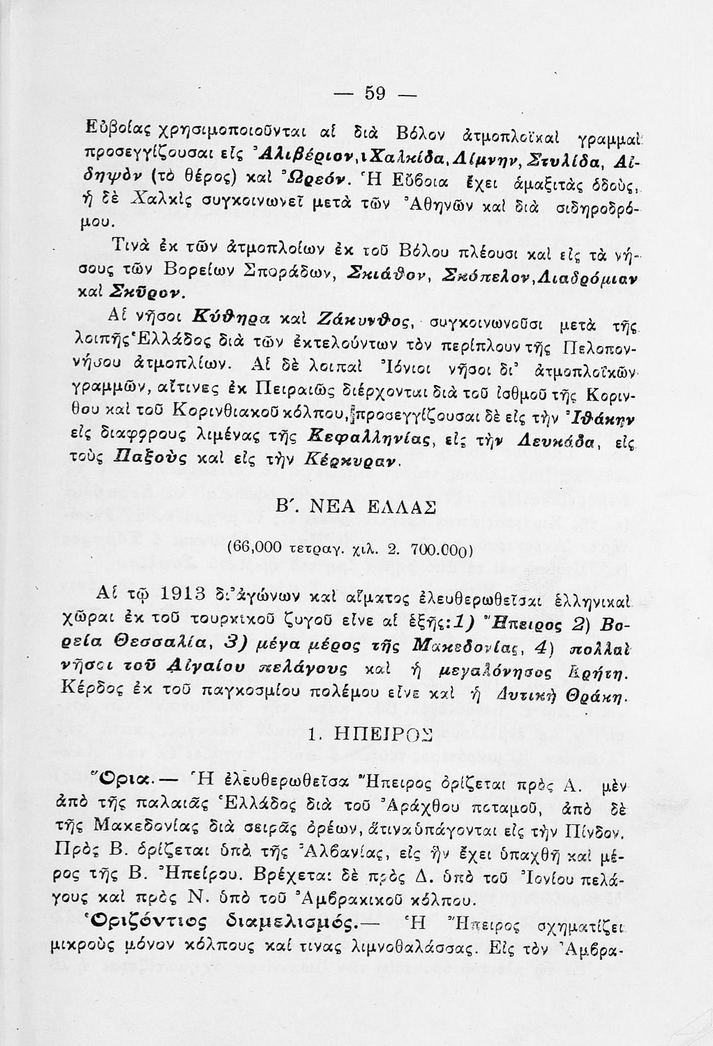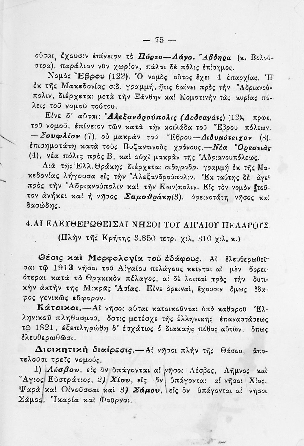 Σχολικό εγχειρίδιο Γεωγραφίας Β΄ Γυμνασίου που εστιάζει στην περίοδο της Α΄ Ελληνικής Δημοκρατίας και διακρίνει μεταξύ της Παλαιάς και Νέας Ελλάδας. Περιέχει εκτενή σχολιασμό των γεωμορφολογικών στοιχείων νομών, πόλεων και χωριών ενώ περιλαμβάνει και τα εδάφη της Τουρκικής Θράκης.