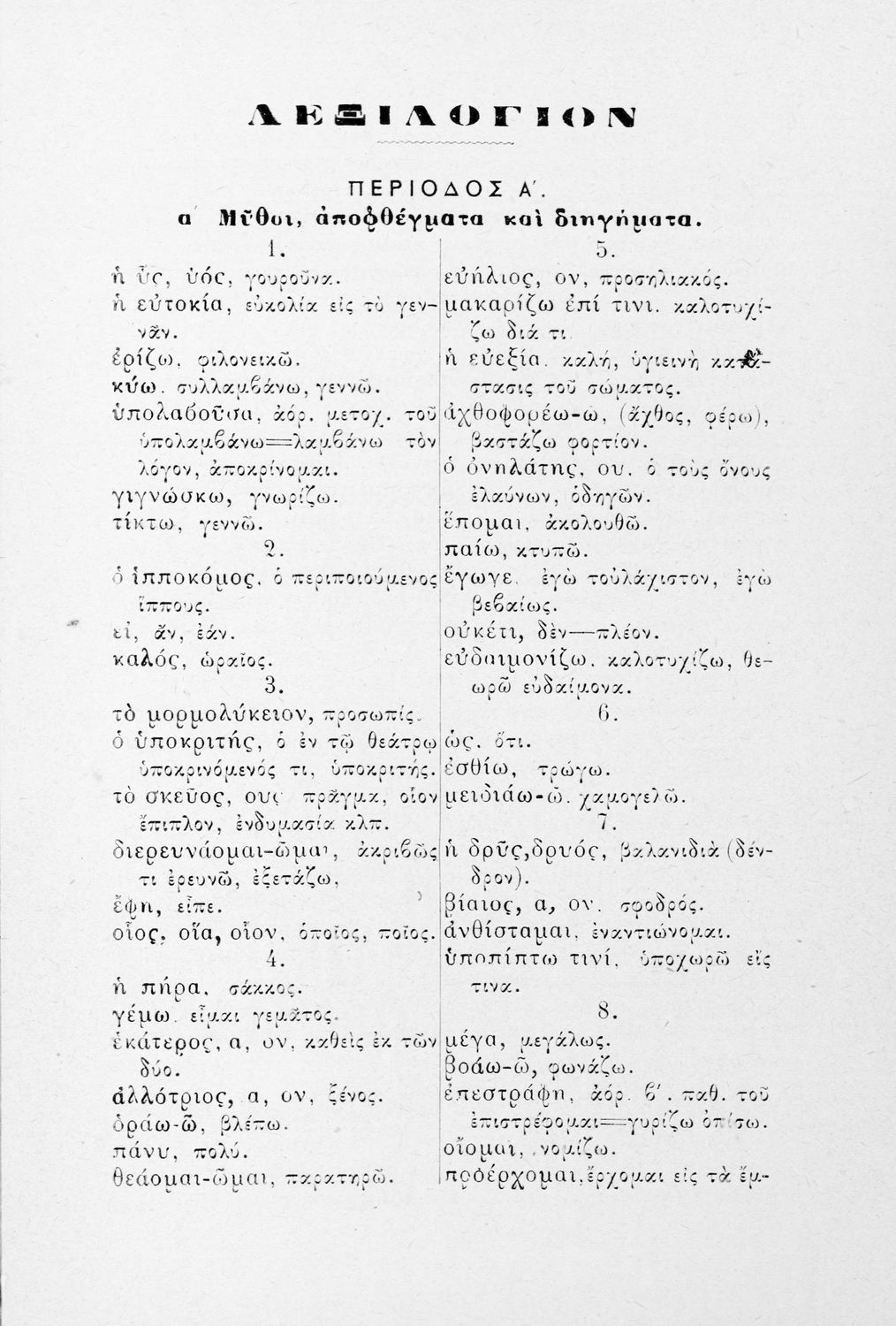 Σχολικό εγχειρίδιο Αρχαίων Ελληνικών Α' Ελληνικού Σχολείου που περιλαμβάνει αποσπάσματα έργων αρχαίων Ελλήνων συγγραφέων και λεξιλόγιο.