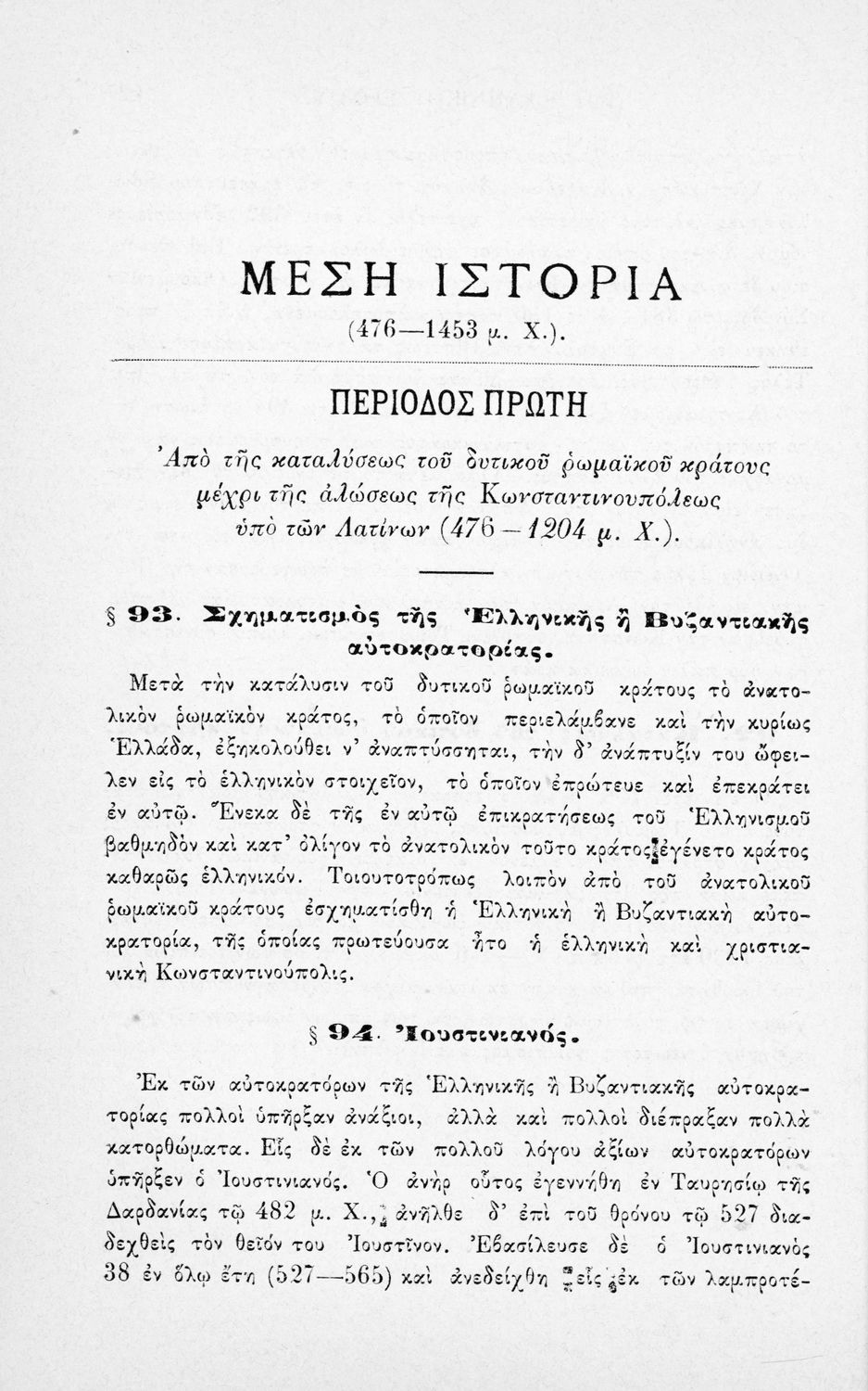 Σχολικό εγχειρίδιο Ιστορίας για τα Ελληνικά και Αστικά Σχολεία και Παρθεναγωγεία που καλύπτει την περίοδο από τους προϊστορικούς χρόνους μέχρι την Ελληνική Επανάσταση και την προσάρτηση των Επτανήσων και της Θεσσαλίας.