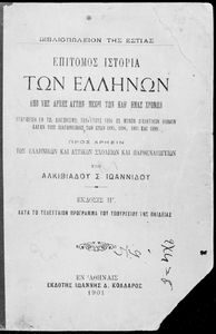 Βαθμίδα εκπαίδευσης: Δευτεροβάθμια Τάξη: Ελληνικό Σχολείο / Αστικό Σχολείο / Παρθεναγωγείο Μάθημα: Ιστορία Γλώσσα: Καθαρεύουσα Παρουσίαση περιεχομένου: Σχολικό εγχειρίδιο Ιστορίας για τα Ελληνικά και Αστικά Σχολεία και Παρθεναγωγεία που καλύπτει την περίοδο από τους προϊστορικούς χρόνους μέχρι την Ελληνική Επανάσταση και την προσάρτηση των Επτανήσων και της Θεσσαλίας. |