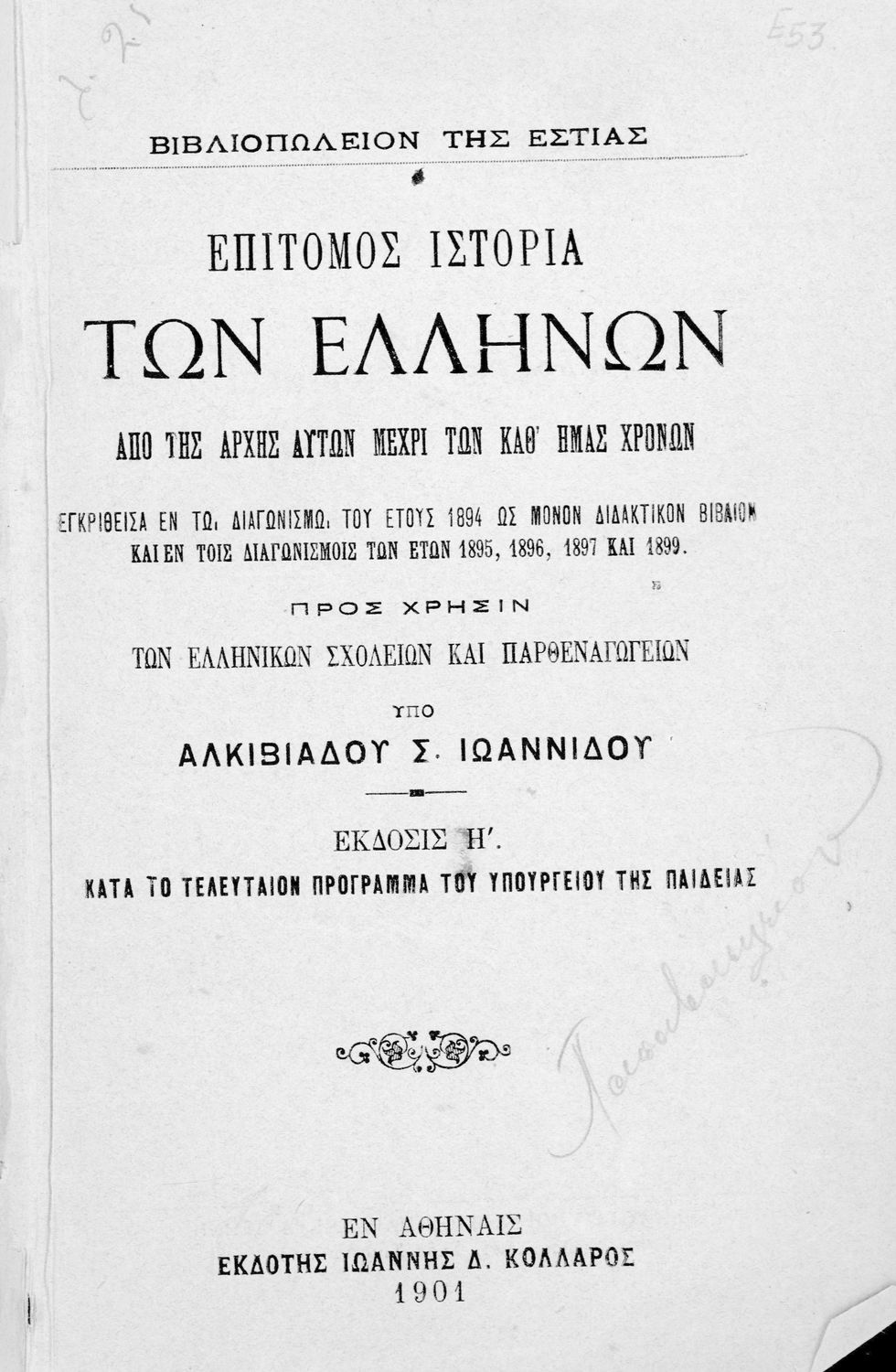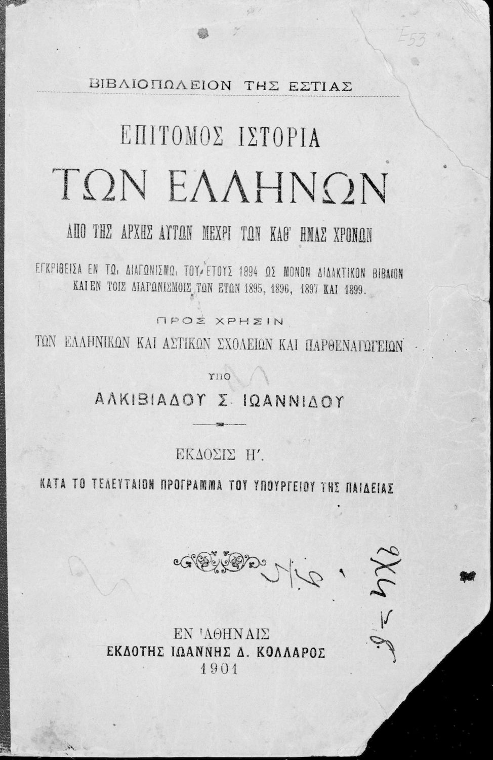 LDR 01584 2200217 4500 035 ## _a20-E0053 040 ## _aΚΕΝΕΚ - Εταιρεία Σπουδών Νεοελληνικού Πολιτισμού και Παιδείας 041 ## _ael 100 ## _aΑλκιβιάδης Σ. Ιωαννίδης 110 ## _aE0053 245 0# _aΕπίτομος ιστορία των Ελλήνων από της αρχής μέχρι των καθ' ημάς χρόνων προς χρήσιν των Ελληνικών Σχολείων, Αστικών Σχολείων και Παρθεναγωγείων 250 ## _a8η Έκδοση 260 ## _aΑθήνα _bΙωάννης Δ. Κολλάρος, Βιβλιοπωλείο της "Εστίας" _c1901 300 ## _a230 _c21 520 ## _aΣχολικό εγχειρίδιο Ιστορίας για τα Ελληνικά και Αστικά Σχολεία και Παρθεναγωγεία που καλύπτει την περίοδο από τους προϊστορικούς χρόνους μέχρι την Ελληνική Επανάσταση και την προσάρτηση των Επτανήσων και της Θεσσαλίας. 521 ## _aΕλληνικό Σχολείο / Αστικό Σχολείο / Παρθεναγωγείο 522 ## _aΕλλάδα 546 ## _aΚαθαρεύουσα 563 ## _aΣκληρό Εξώφυλλο 583 ## _a12055/21-8-1896 _c1896 650 #4 _aΒυζάντιο _aΚαποδίστριας _aΚολοκοτρώνης _aΜ Αλέξανδρος _aΠελασγοί _aΠερικλής _aΣπάρτη