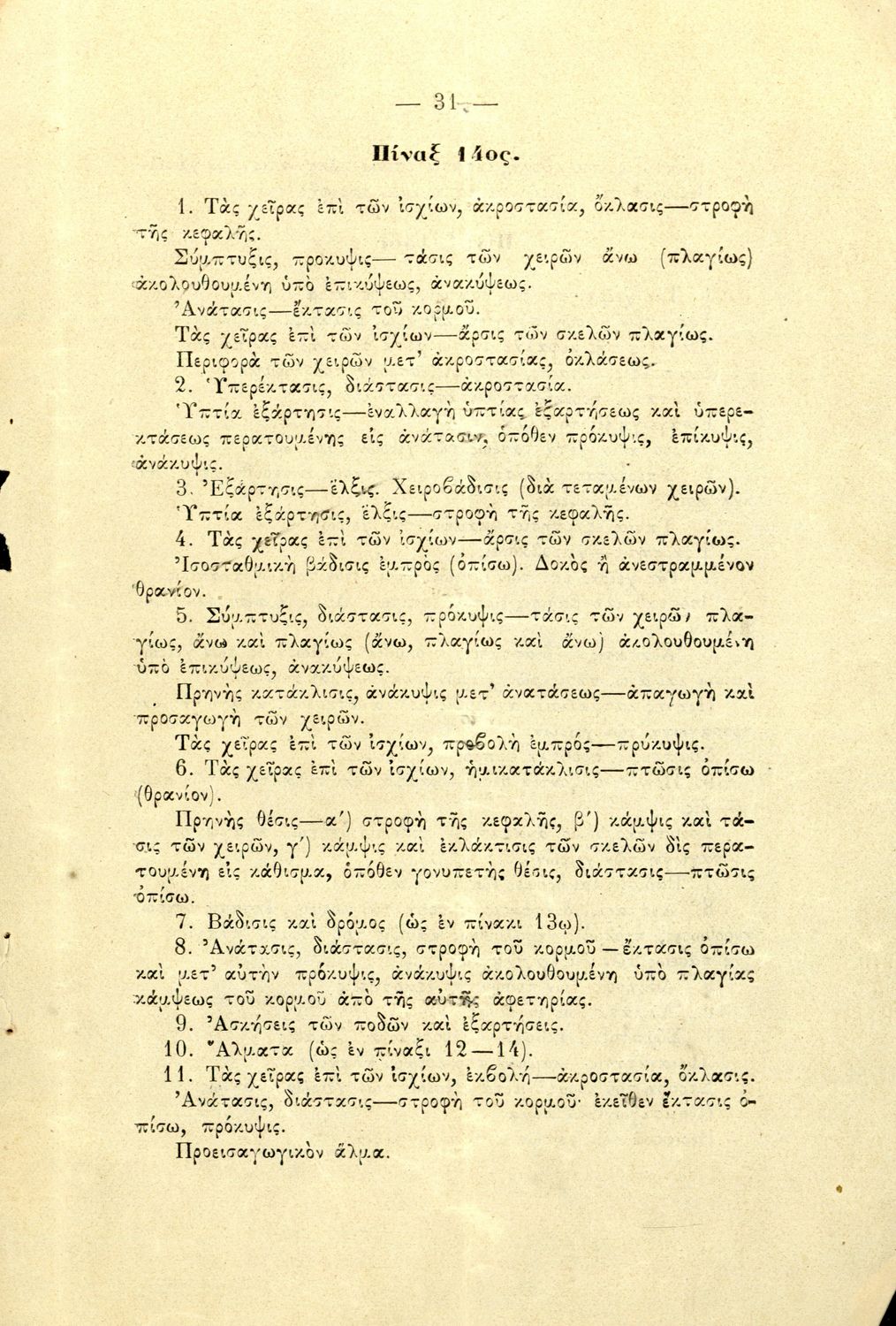 Κωδικός αναγνώρισης: 20-E0072 Τίτλος: Βασιλικόν διάταγμα περί κανονισμού της διδακτέας γυμναστικής εν τοις σχολείοις της Δημοτικής και Μέσης Εκπαιδεύσεως Συγγραφέας: Υπουργείον Εκκλησιαστικών & Δημόσιας Εκπαιδεύσεως Μέγεθος και υπόστρωμα: Αναλυτικό πρόγραμμα, 21εκ., μαλακό εξώφυλλο, 38 σελίδες. |