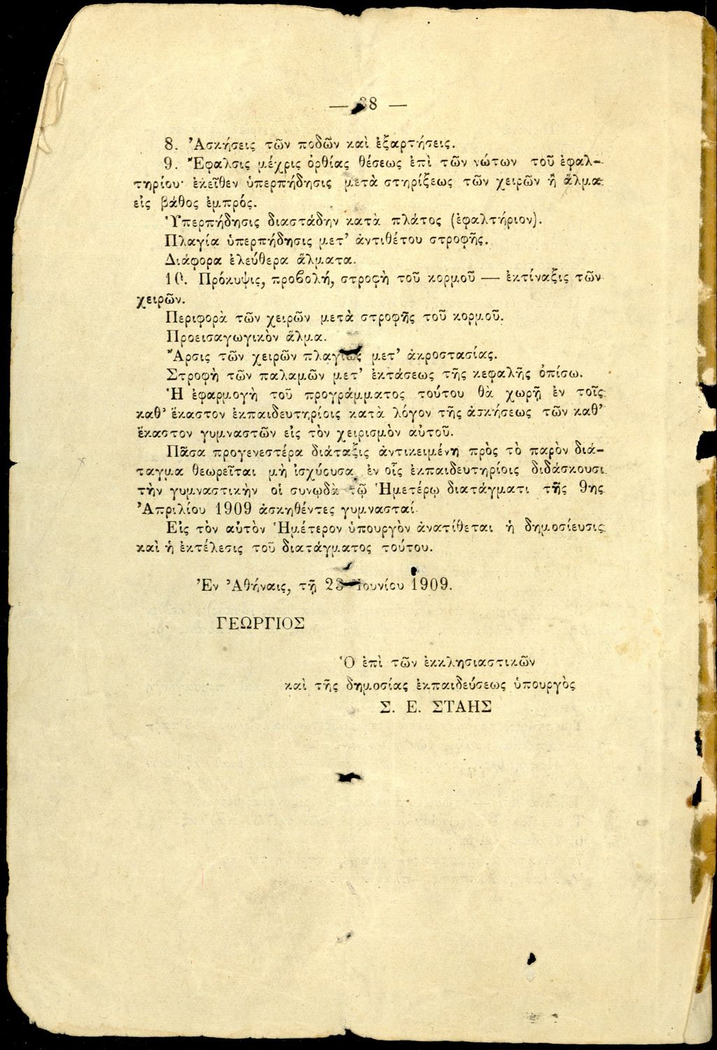 Βασιλικό διάταγμα που περιλαμβάνει την νομοθεσία και τη διδακτέα ύλη της Γυμναστικής για την Πρωτοβάθμια / Δευτεροβάθμια Εκπαίδευση.