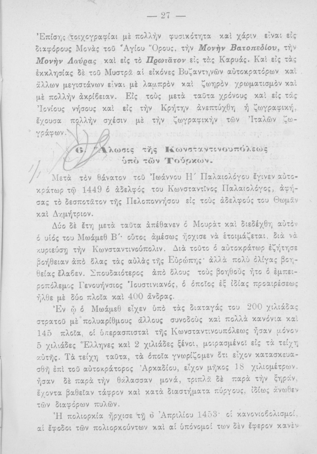 Κωδικός αναγνώρισης: 20-E0088 Τίτλος: Ελληνική ιστορία από των χρόνων της Αχαϊκής συμπολιτείας μέχρι της Αλώσεως της Κωνσταντινούπολης υπό των Φράγκων Συγγραφέας: Νικόλαος Ι. Βραχνός Μέγεθος και υπόστρωμα: Σχολικό εγχειρίδιο, 18εκ., σκληρό εξώφυλλο, 116 σελίδες. Σκίτσα (ασπρόμαυρα). |