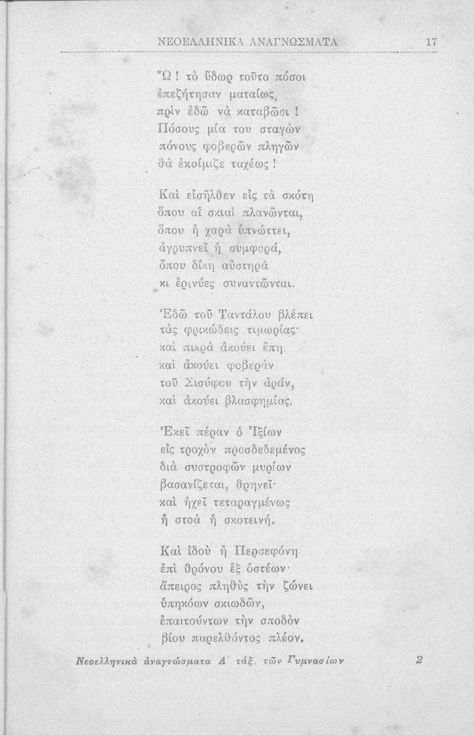 Σχολικό εγχειρίδιο για την Β΄ Γυμνασίου και την Γ΄ Αστικού Θηλέων για το μάθημα των Νέων Ελληνικών. Το εγχειρίδιο αποτελείται από κείμενα πεζού λόγου, επικολυρικά ποιήματα, ωδές, ηθογραφικά διηγήματα, ρητορικά