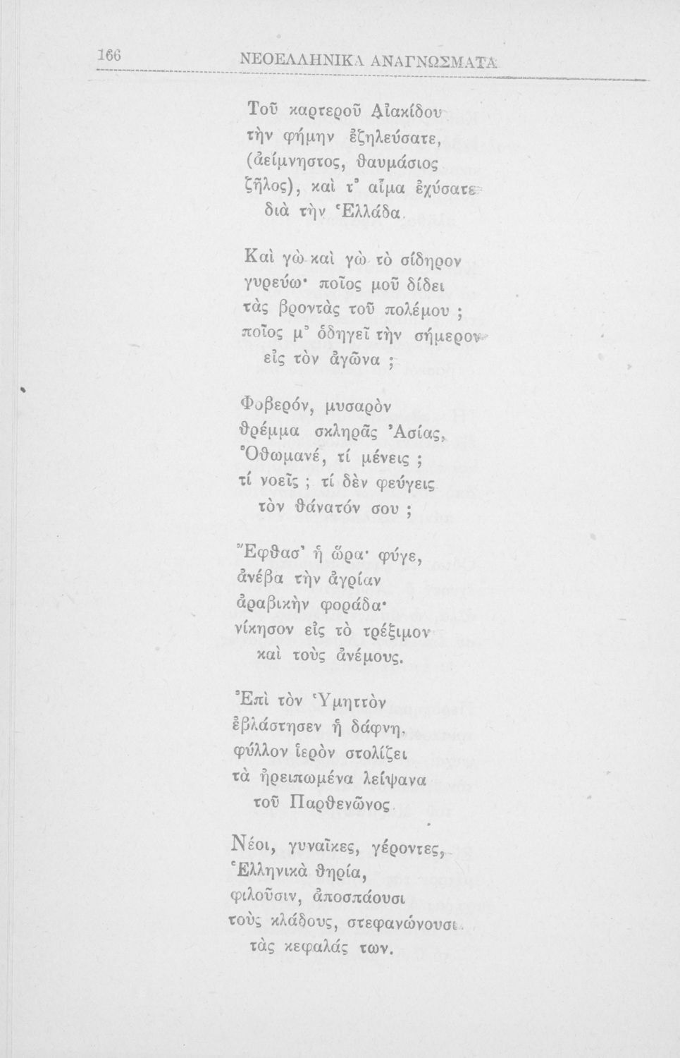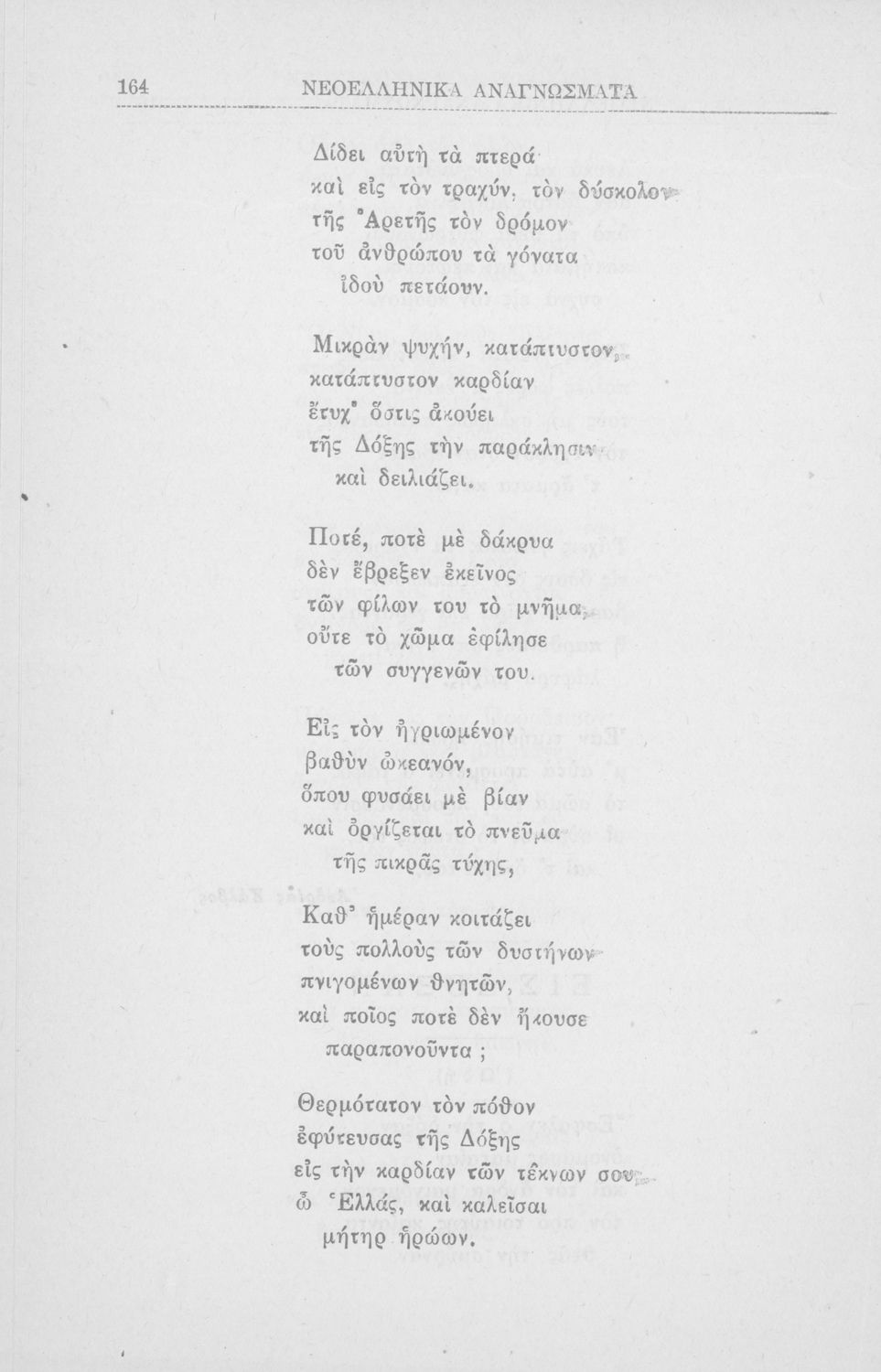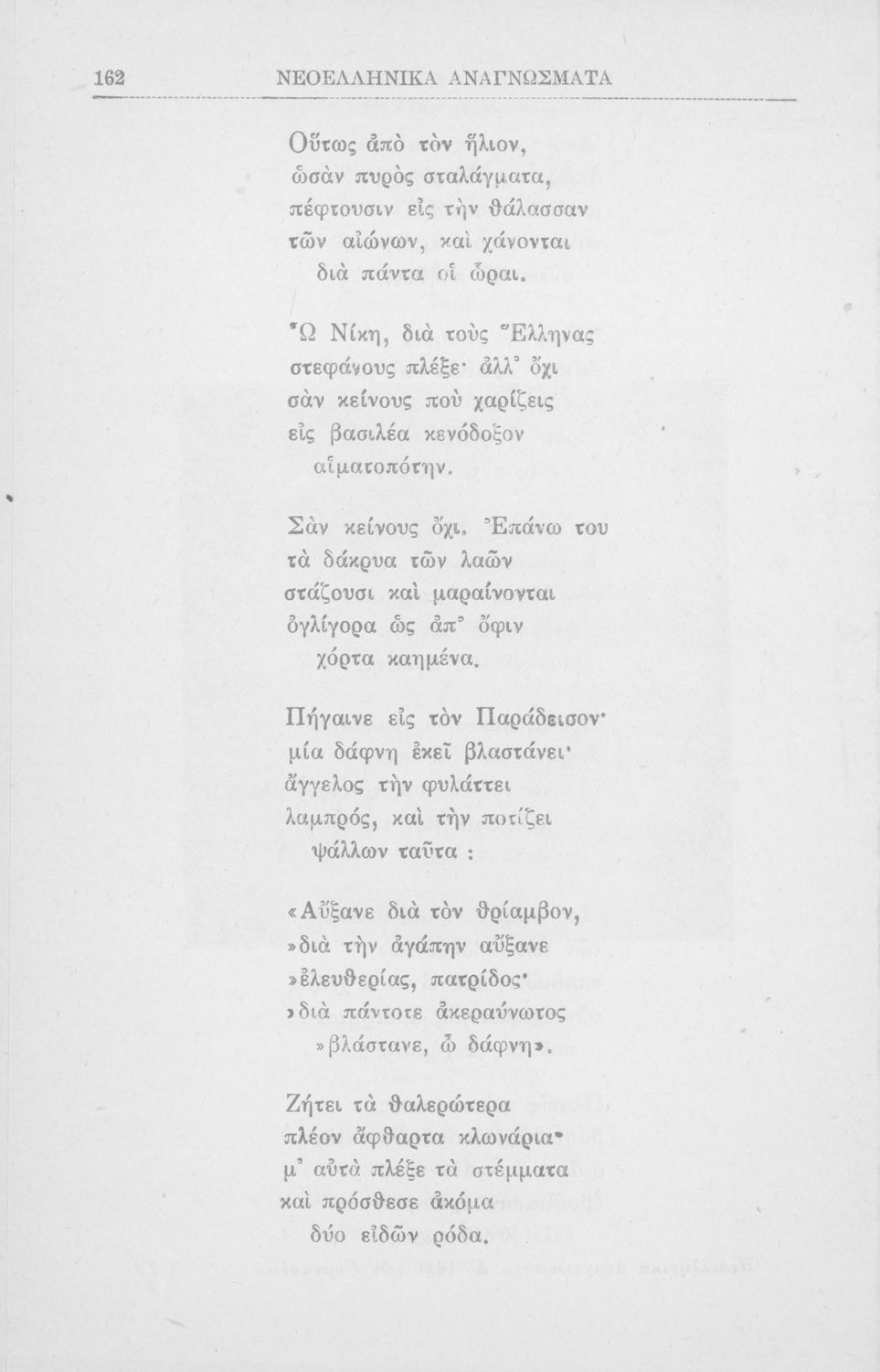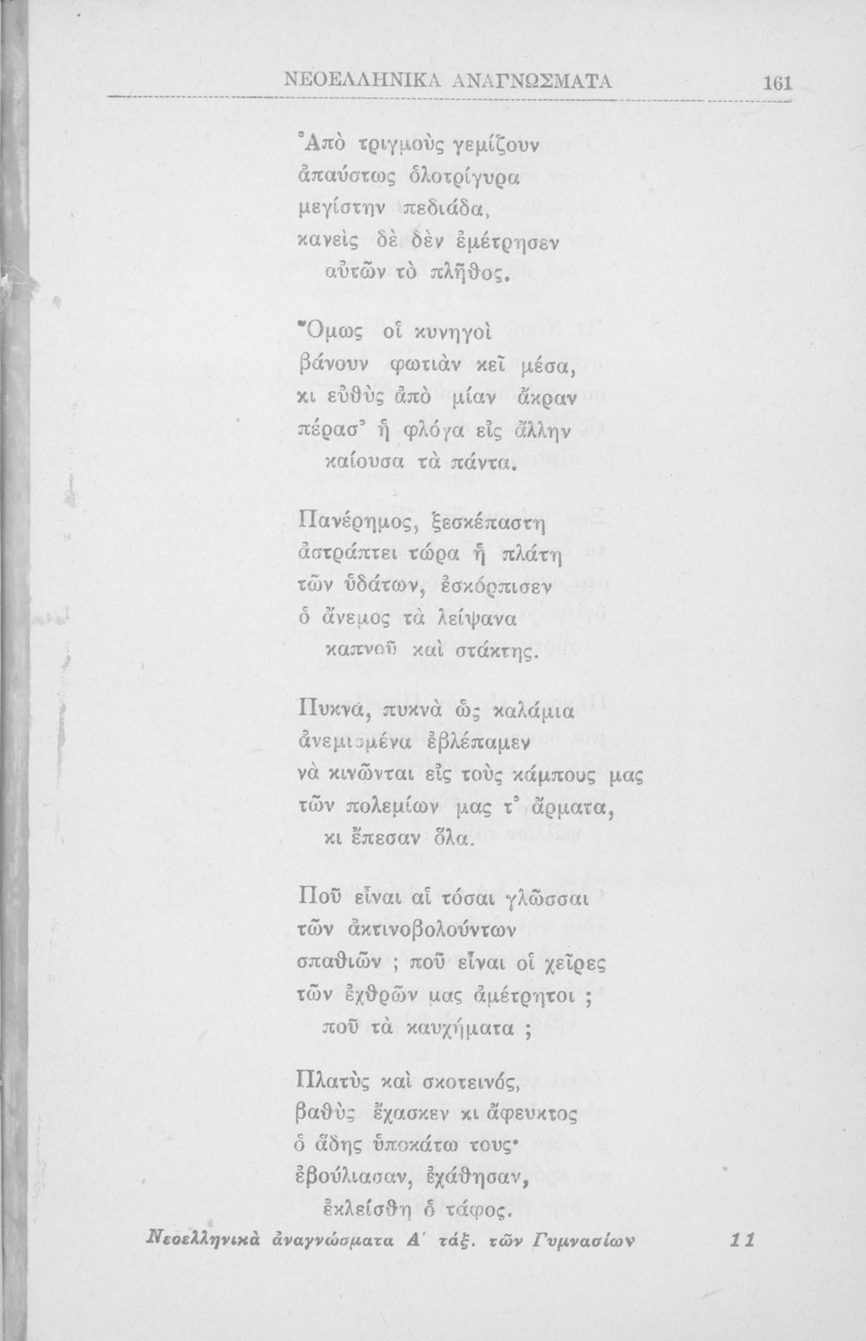 Σχολικό εγχειρίδιο για την Β΄ Γυμνασίου και την Γ΄ Αστικού Θηλέων για το μάθημα των Νέων Ελληνικών. Το εγχειρίδιο αποτελείται από κείμενα πεζού λόγου, επικολυρικά ποιήματα, ωδές, ηθογραφικά διηγήματα, ρητορικά