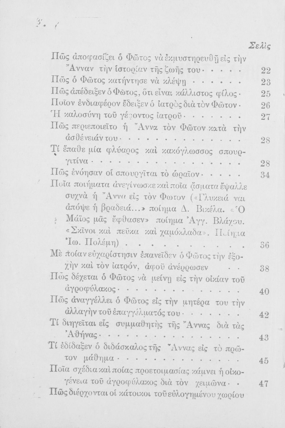 Αναγνωστικό Δ΄ Δημοτικού που περιλαμβάνει κείμενα εμπνευσμένα από την ελληνική ύπαιθρο και οικογένεια, τα τοπικά ήθη και έθιμα, τις διαπροσωπικές σχέσεις, τις καθημερινές ασχολίες και τα επαγγέλματα, τις ηθικές αρετές, τις εθνικές παραδόσεις και την ιστορία της αρχαίας Ελλάδας.