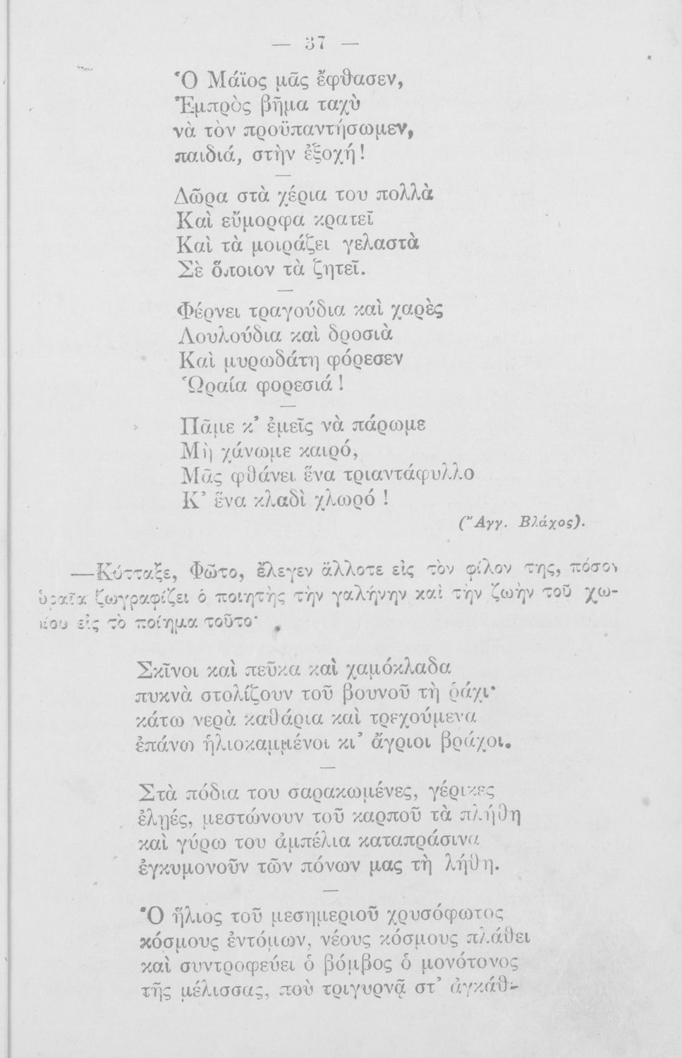 Αναγνωστικό για τους μαθητές της Δ΄ Δημοτικού που περιλαμβάνει ποιήματα και πεζά ηθικοπλαστικού περιεχομένου με θέματα από την ελληνική φύση και ιστορία.