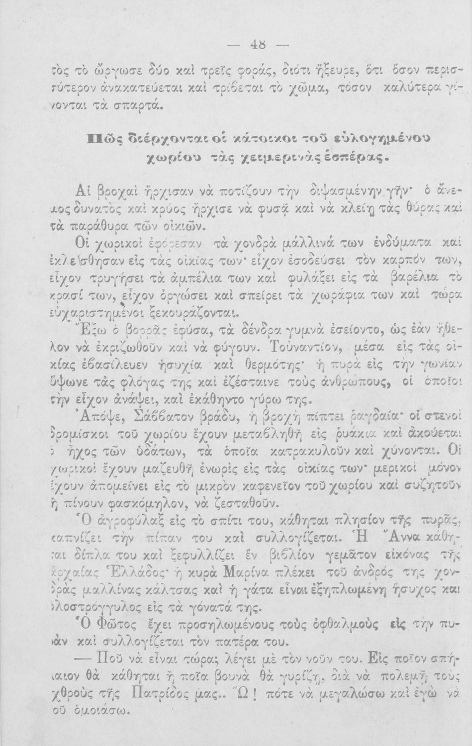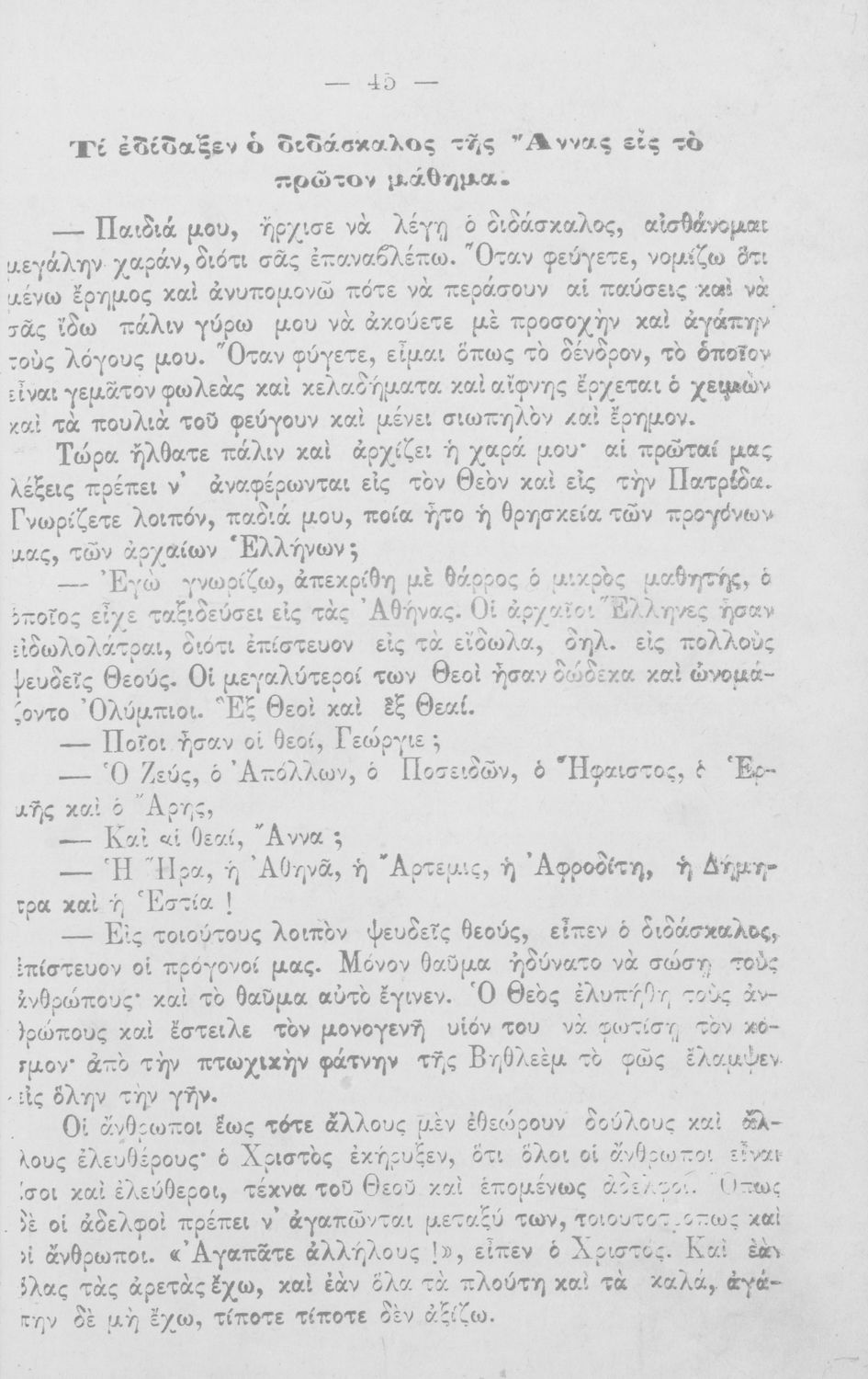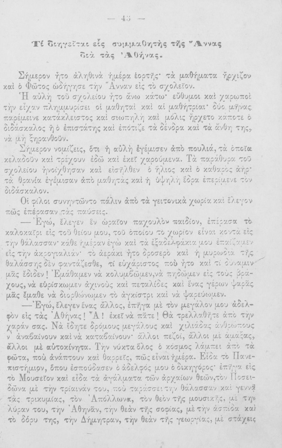 Αναγνωστικό Δ΄ Δημοτικού που περιλαμβάνει κείμενα εμπνευσμένα από την ελληνική ύπαιθρο και οικογένεια, τα τοπικά ήθη και έθιμα, τις διαπροσωπικές σχέσεις, τις καθημερινές ασχολίες και τα επαγγέλματα, τις ηθικές αρετές, τις εθνικές παραδόσεις και την ιστορία της αρχαίας Ελλάδας.