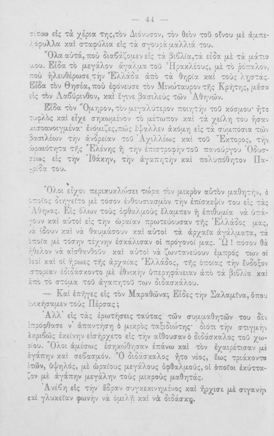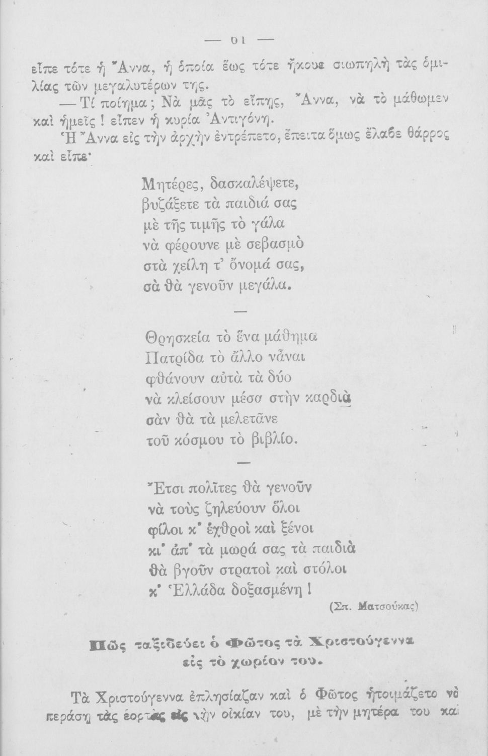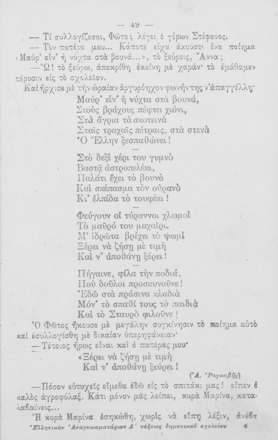 Αναγνωστικό για τους μαθητές της Δ΄ Δημοτικού που περιλαμβάνει ποιήματα και πεζά ηθικοπλαστικού περιεχομένου με θέματα από την ελληνική φύση και ιστορία.