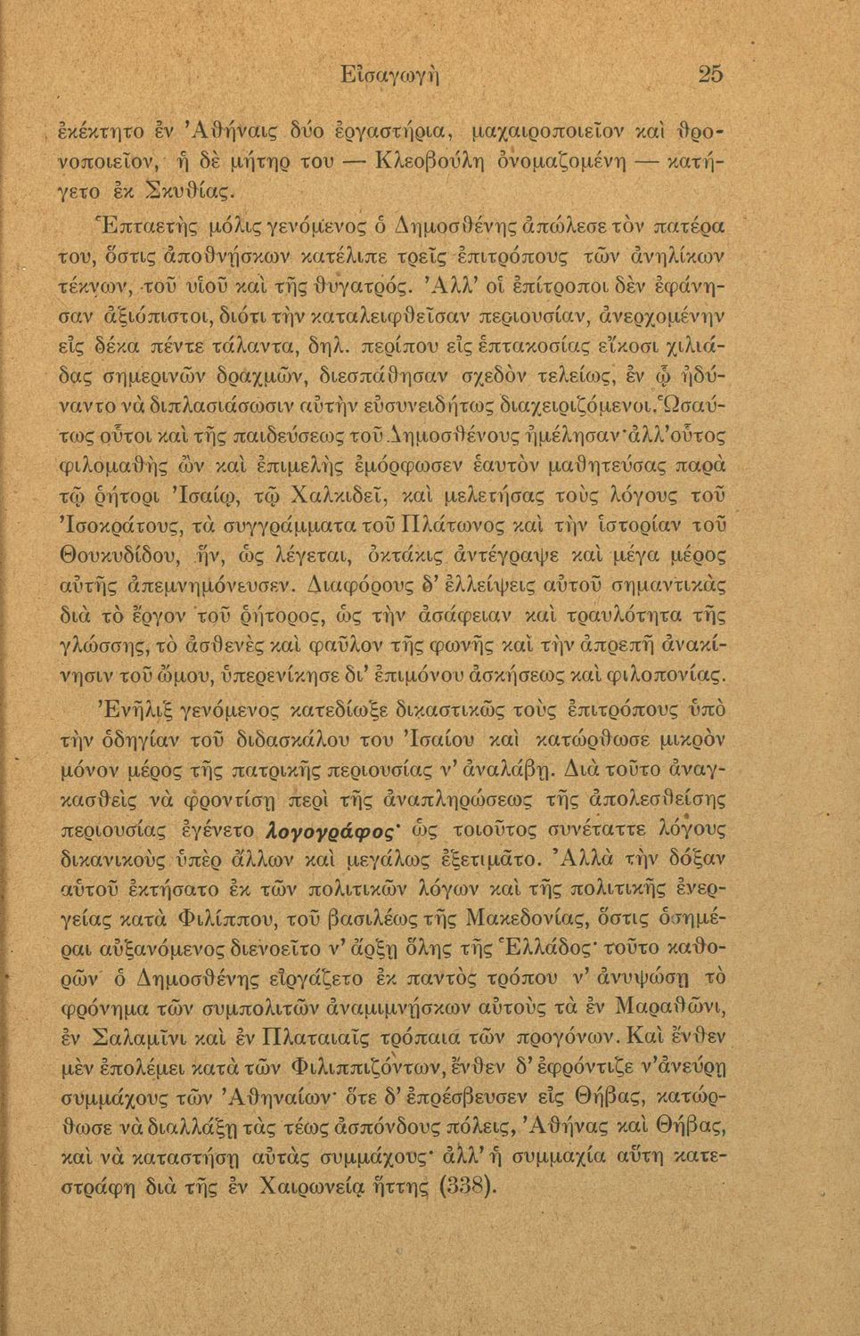 Σχολικό εγχειρίδιο Αρχαίων Ελληνικών Γ΄ Γυμνασίου που περιλαμβάνει τον Λόγο του Δημοσθένη Α΄ κατά Φιλίππου, εισαγωγικά σχόλια στο έργο και τη ζωή του, ερμηνευτικά και γραμματικά σχόλια και παρατηρήσεις.