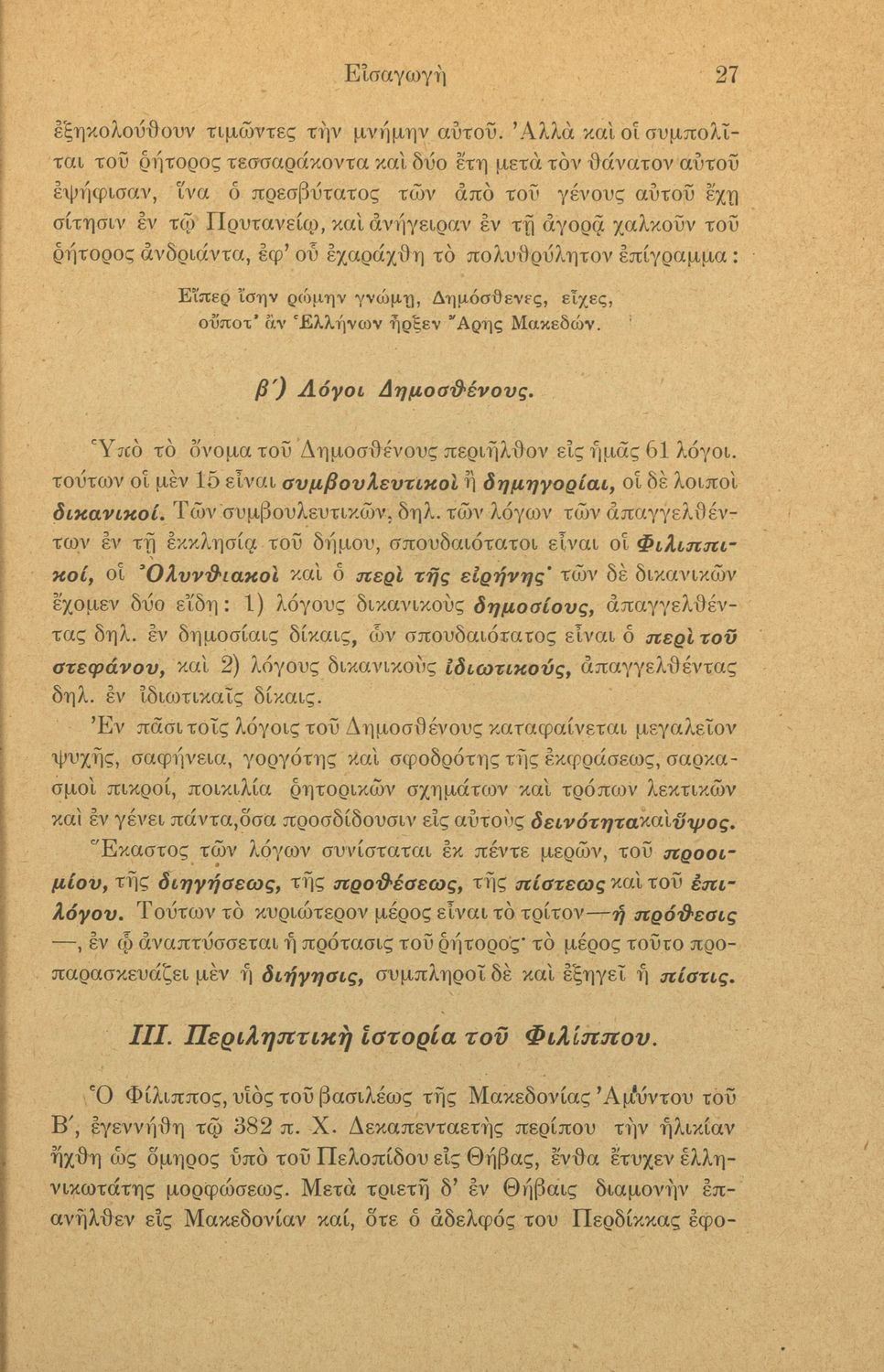 Μαθητικό βοήθημα Αρχαίων Ελληνικών Γ΄ Γυμνασίου που περιλαμβάνει το Λόγο του Δημοσθένη Κατά Φιλίππου Γ΄, εισαγωγή στην υπόθεση και πλοκή του έργου και ερμηνευτικά, πραγματολογικά και γραμματικά σχόλια.