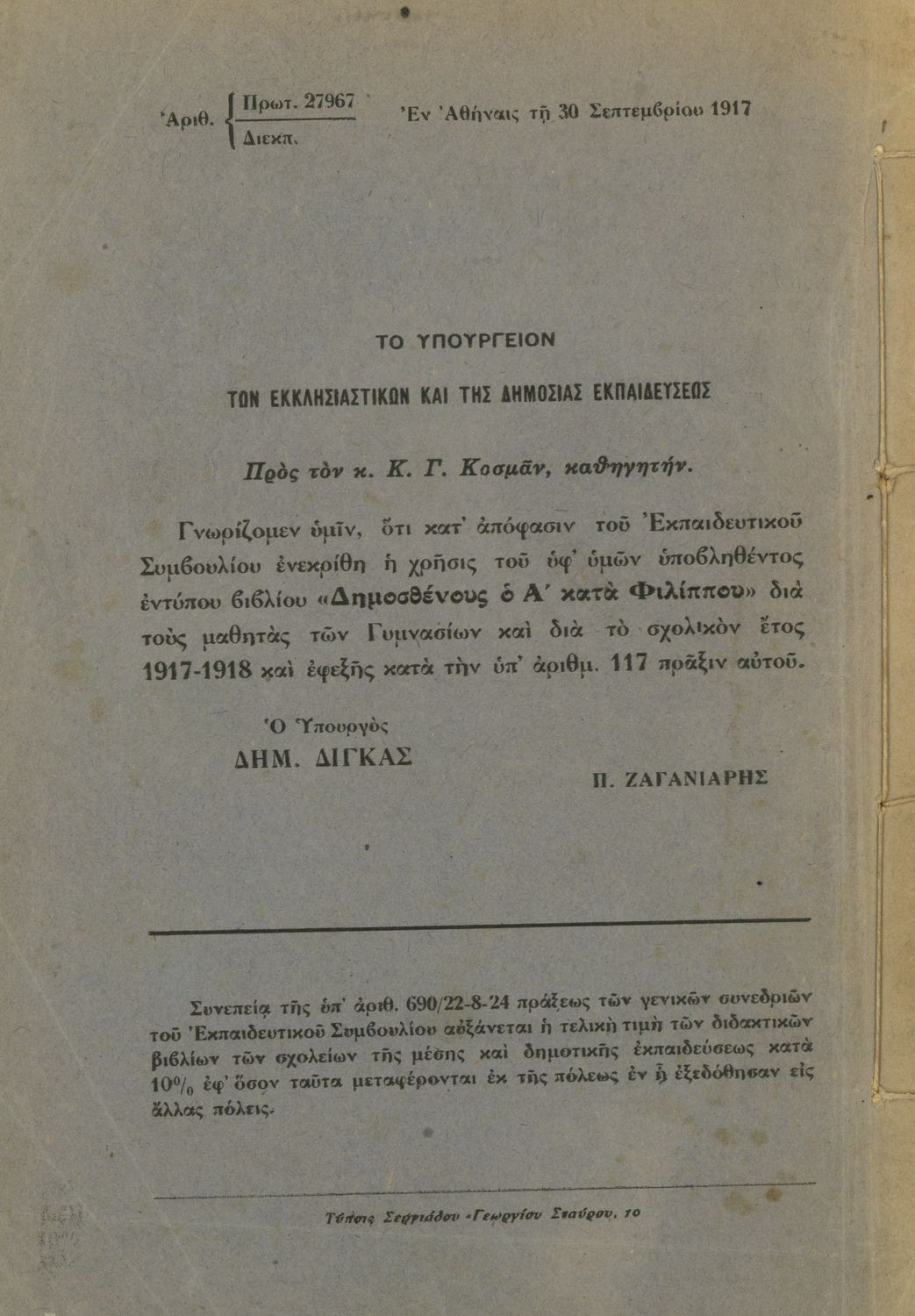 Σχολικό εγχειρίδιο Αρχαίων Ελληνικών Ε΄ Εξαταξίου Γυμνασίου που περιλαμβάνει τον Λόγο του Δημοσθένη Α΄ κατά Φιλίππου, εισαγωγή, ερμηνευτικά και γραμματικά σχόλια και παρατηρήσεις.