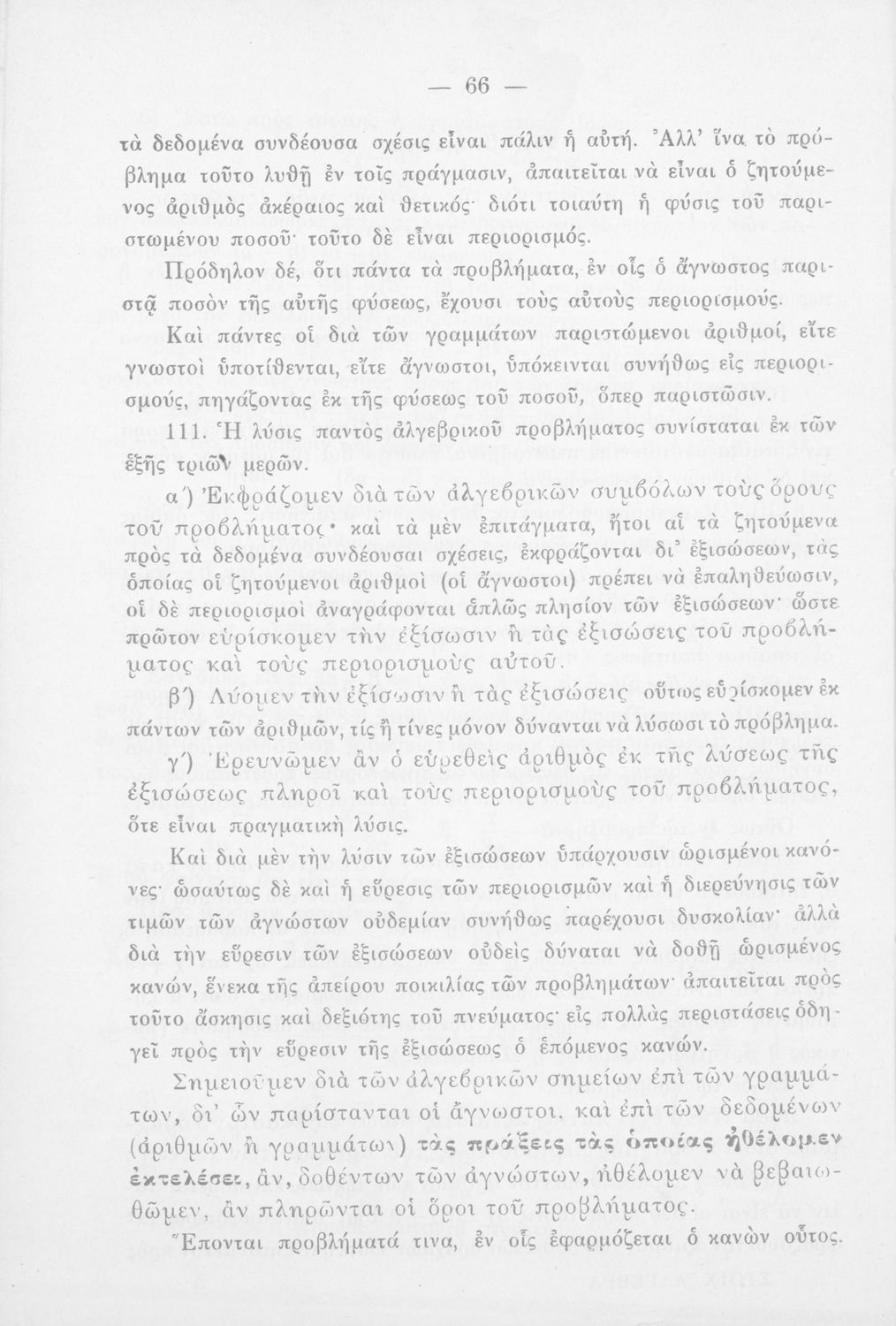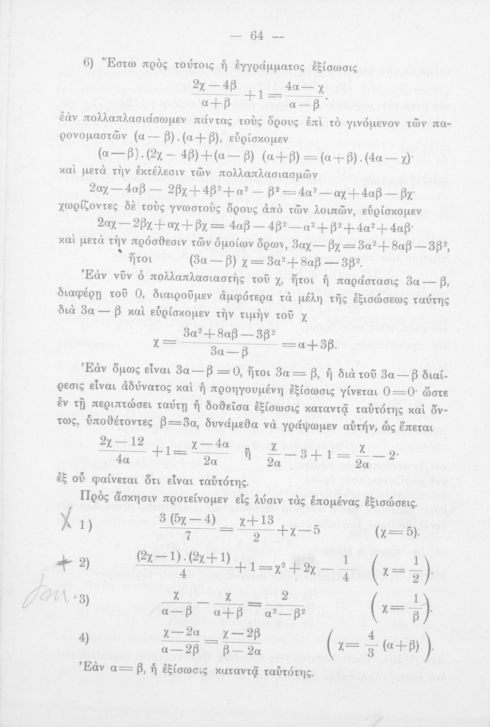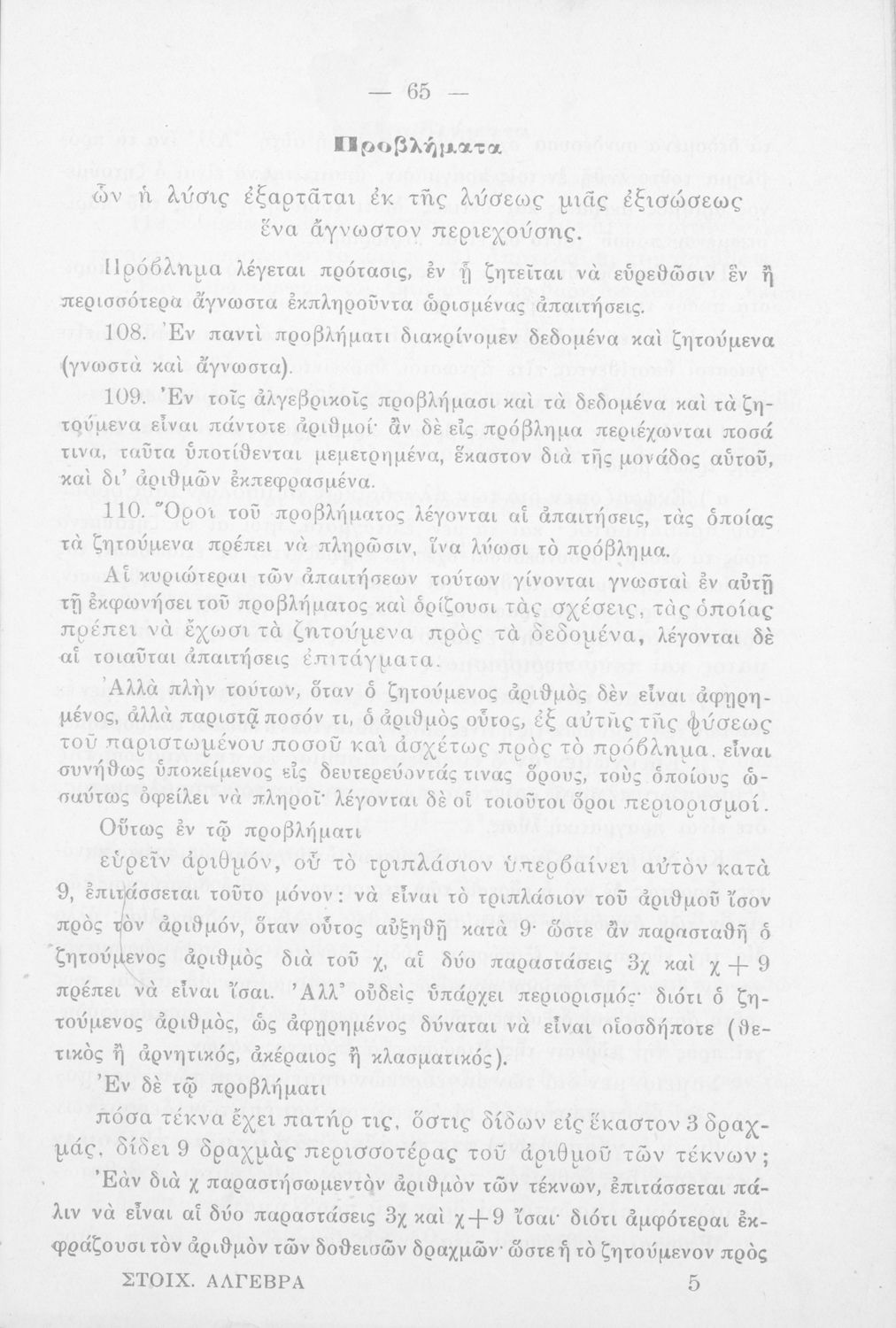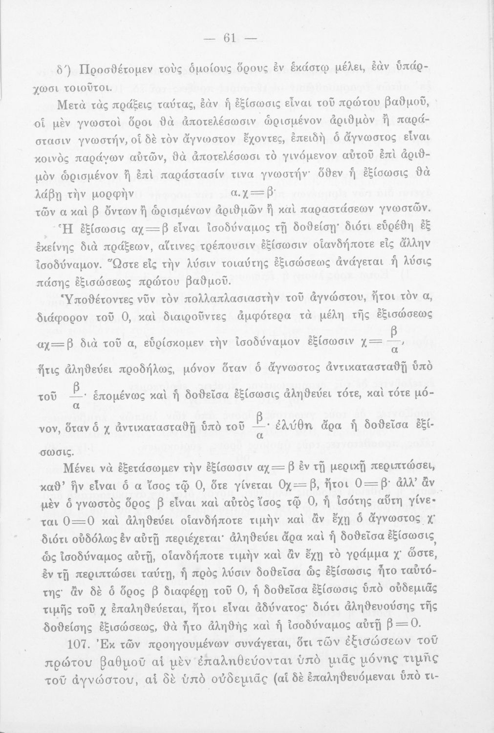 Σχολικό εγχειρίδιο Άλγεβρας Γυμνασίου που περιέχει θεωρία και ασκήσεις. Ο συγγραφέας ήταν υφηγητής στο Εθνικό Πανεπιστήμιο.