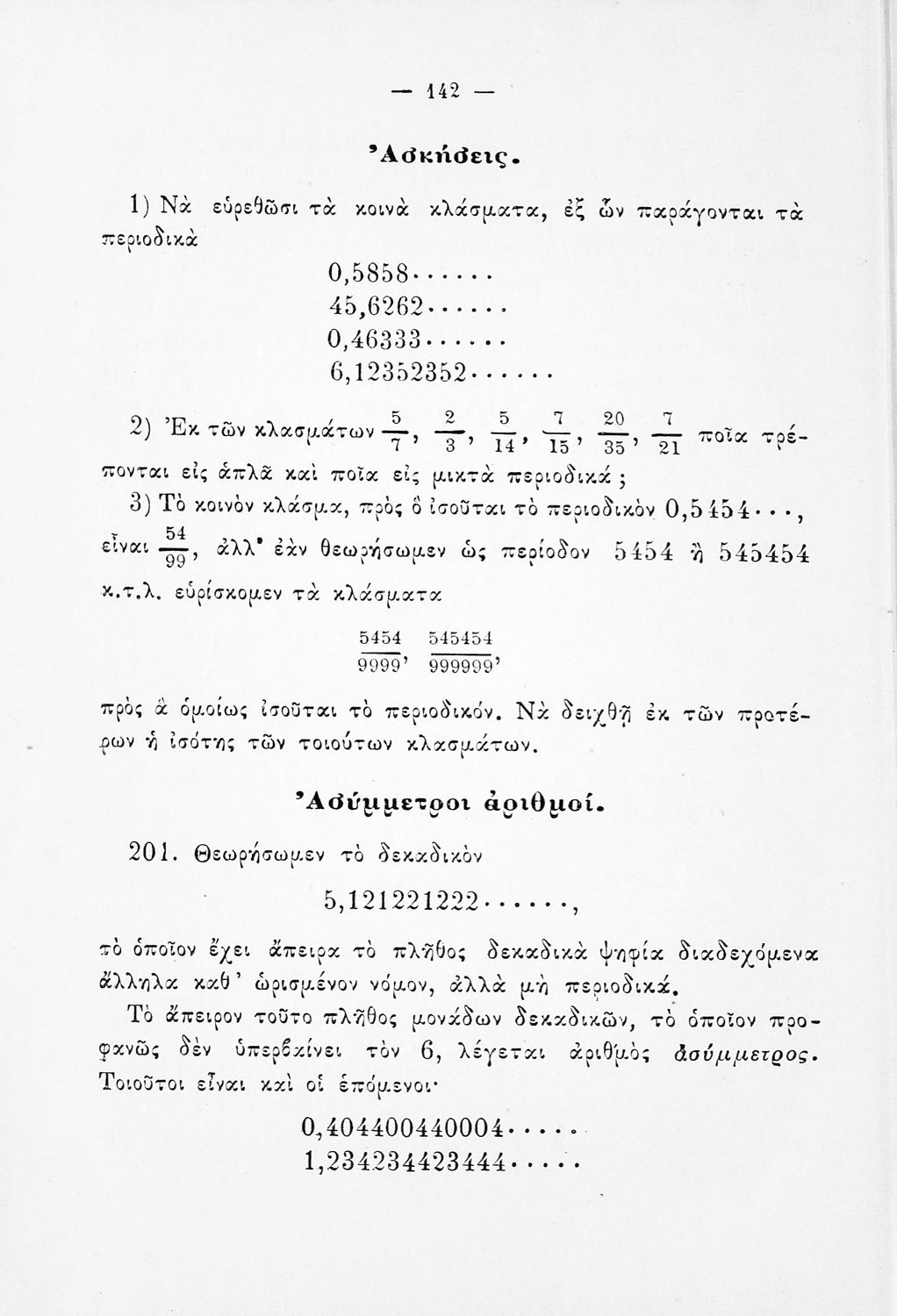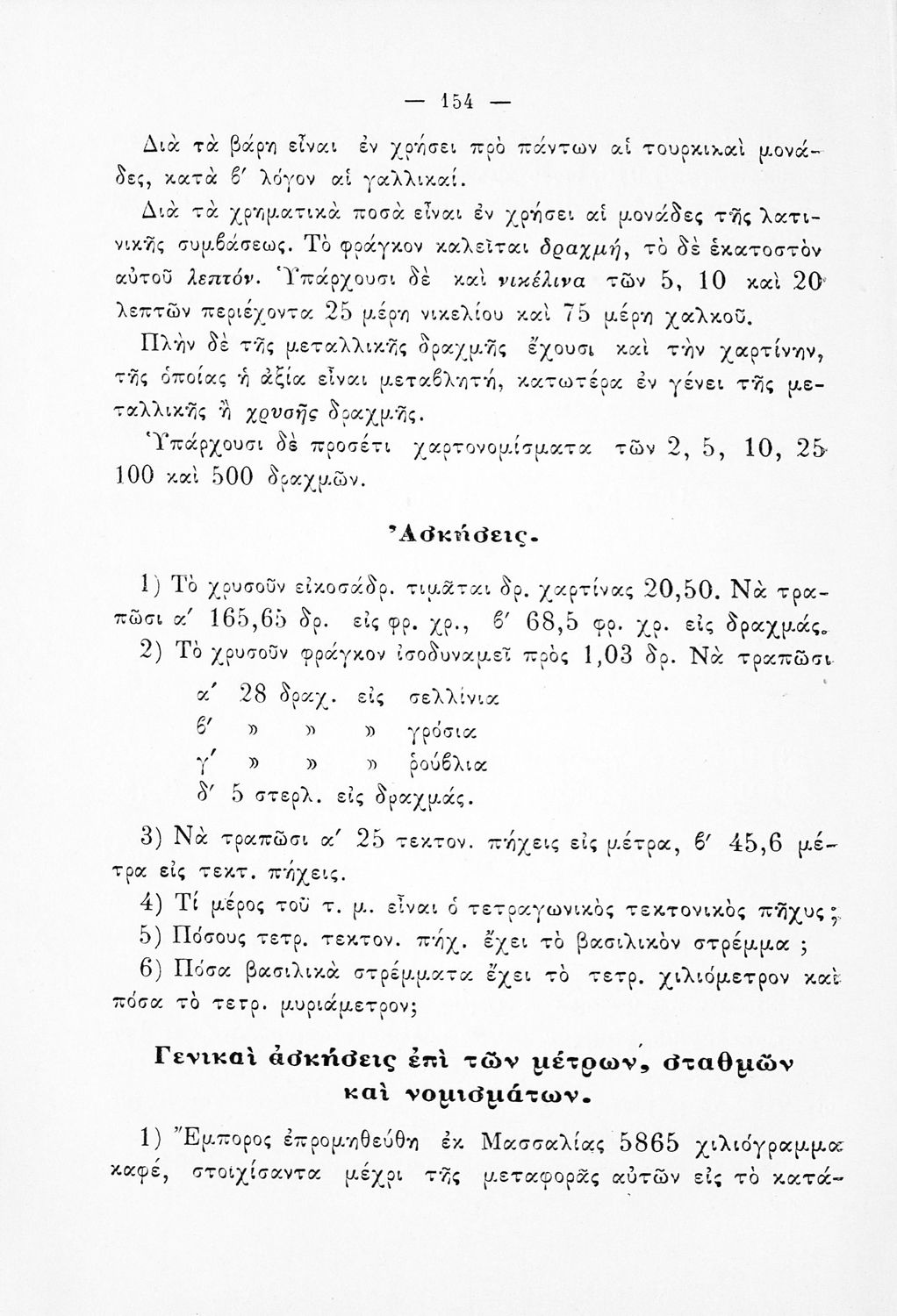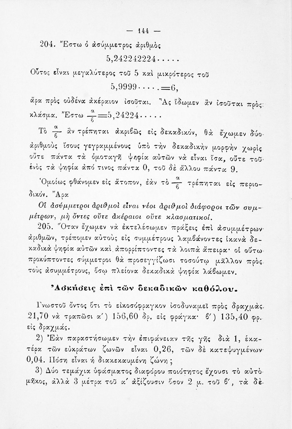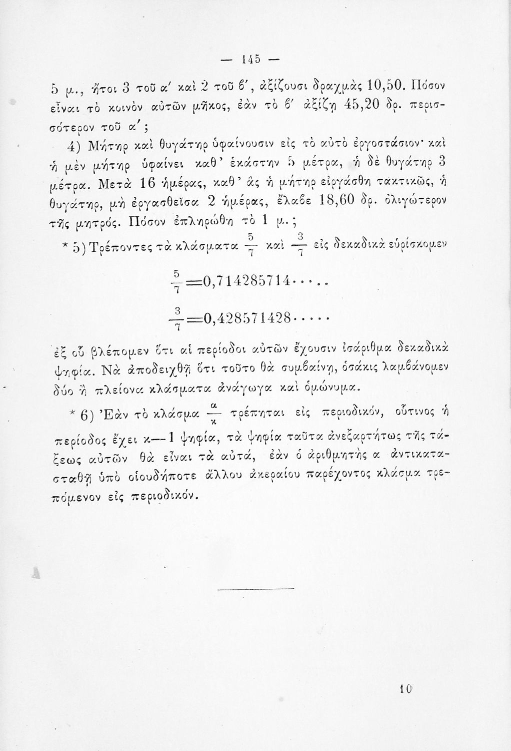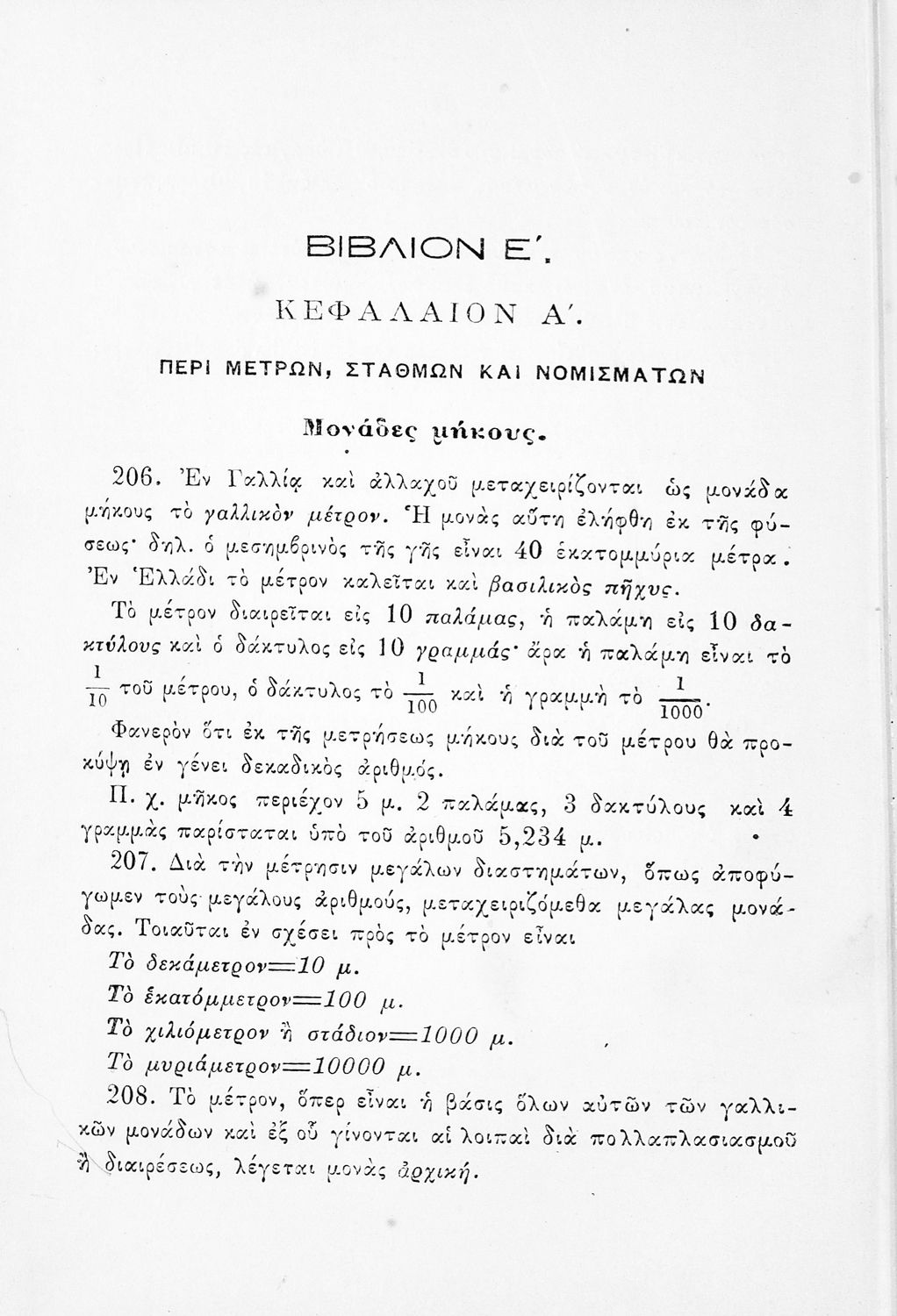 Βαθμίδα εκπαίδευσης: Δευτεροβάθμια Τάξη: Γυμνάσιο Μάθημα: Αριθμητική Γλώσσα: Καθαρεύουσα Παρουσίαση περιεχομένου: Σχολικό εγχειρίδιο Αριθμητικής Γυμνασίου που περιλαμβάνει θεωρία, ασκήσεις και προβλήματα που σχετίζονται με τις αριθμητικές πράξεις, τα κλάσματα, τις αριθμητικές παραστάσεις, τις εξισώσεις, τα ανάλογα ποσά, το επιτόκιο, και το μέρισμα. |
