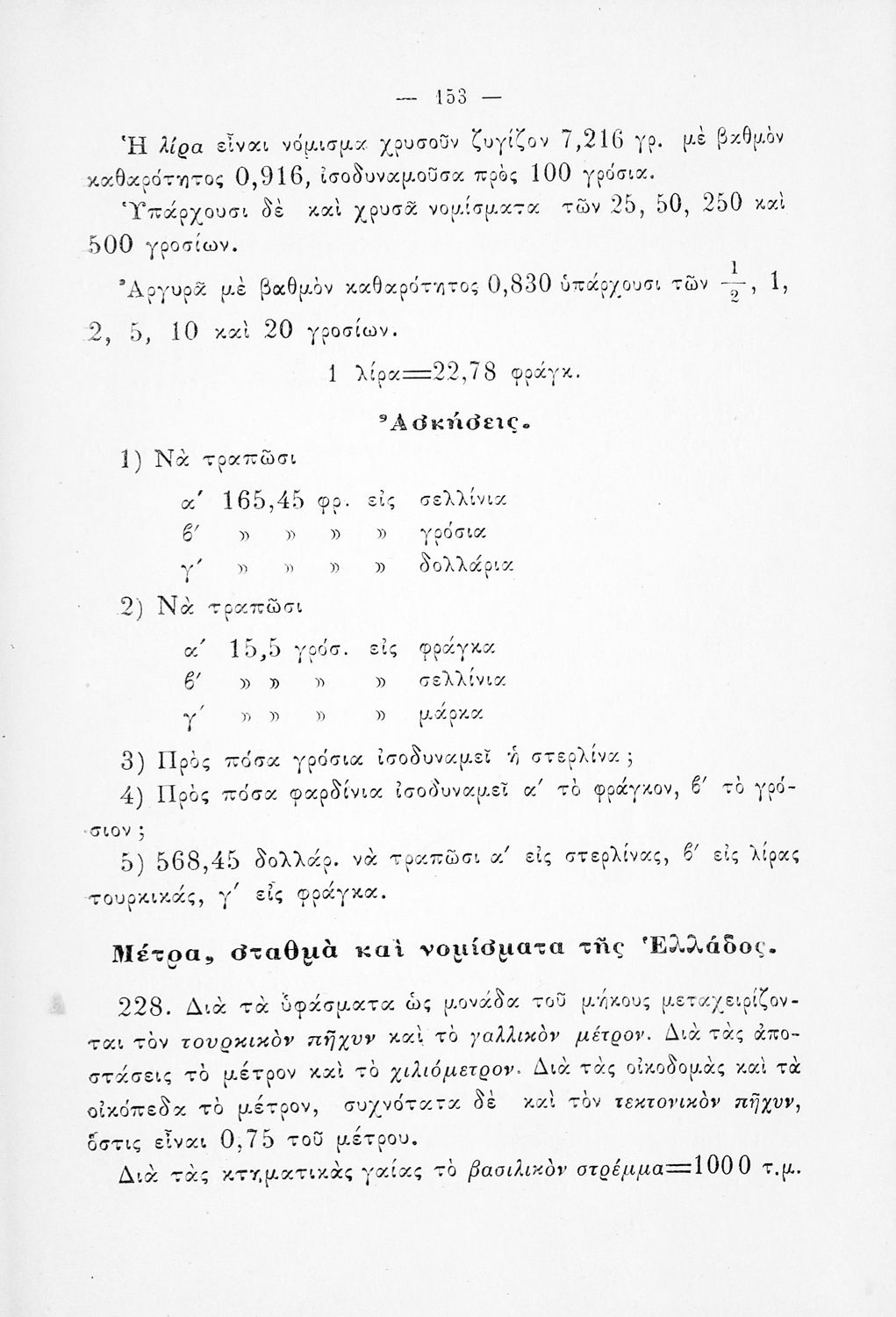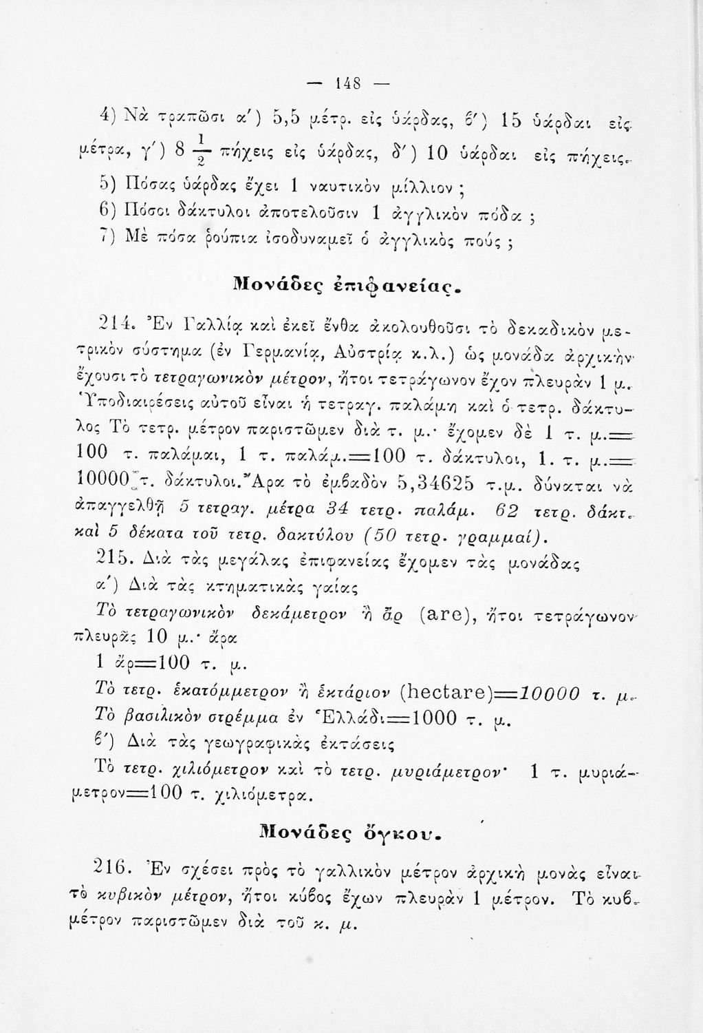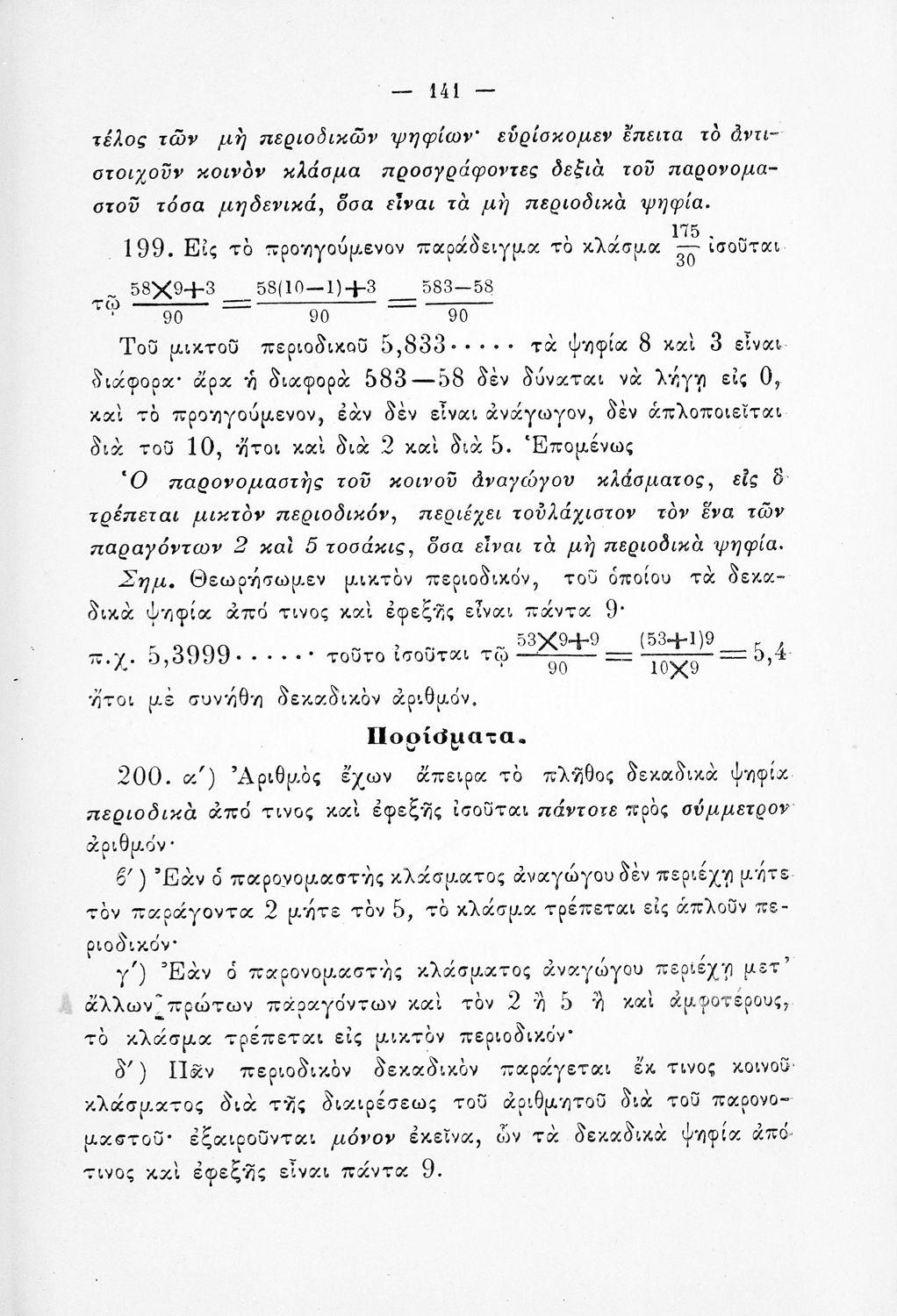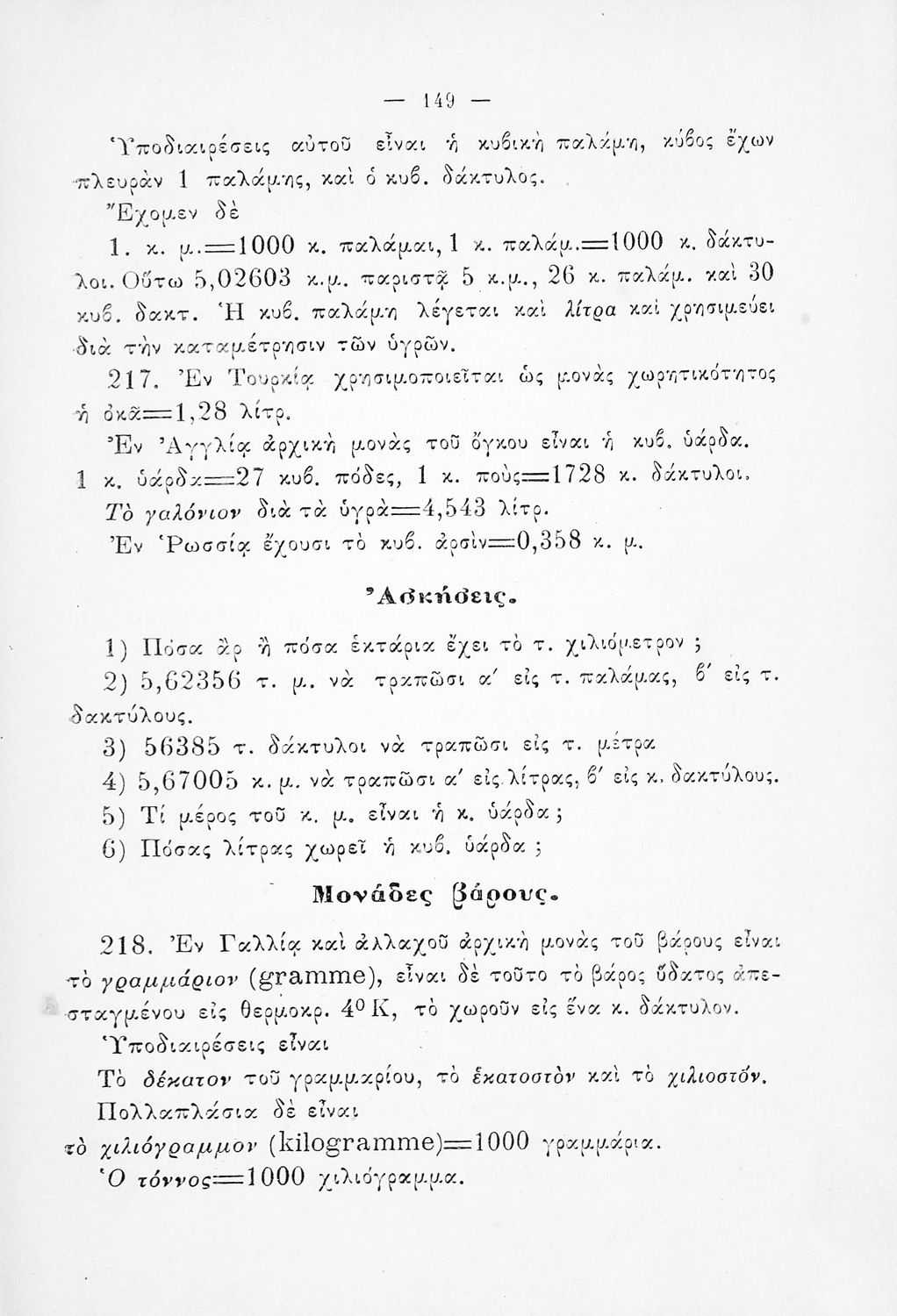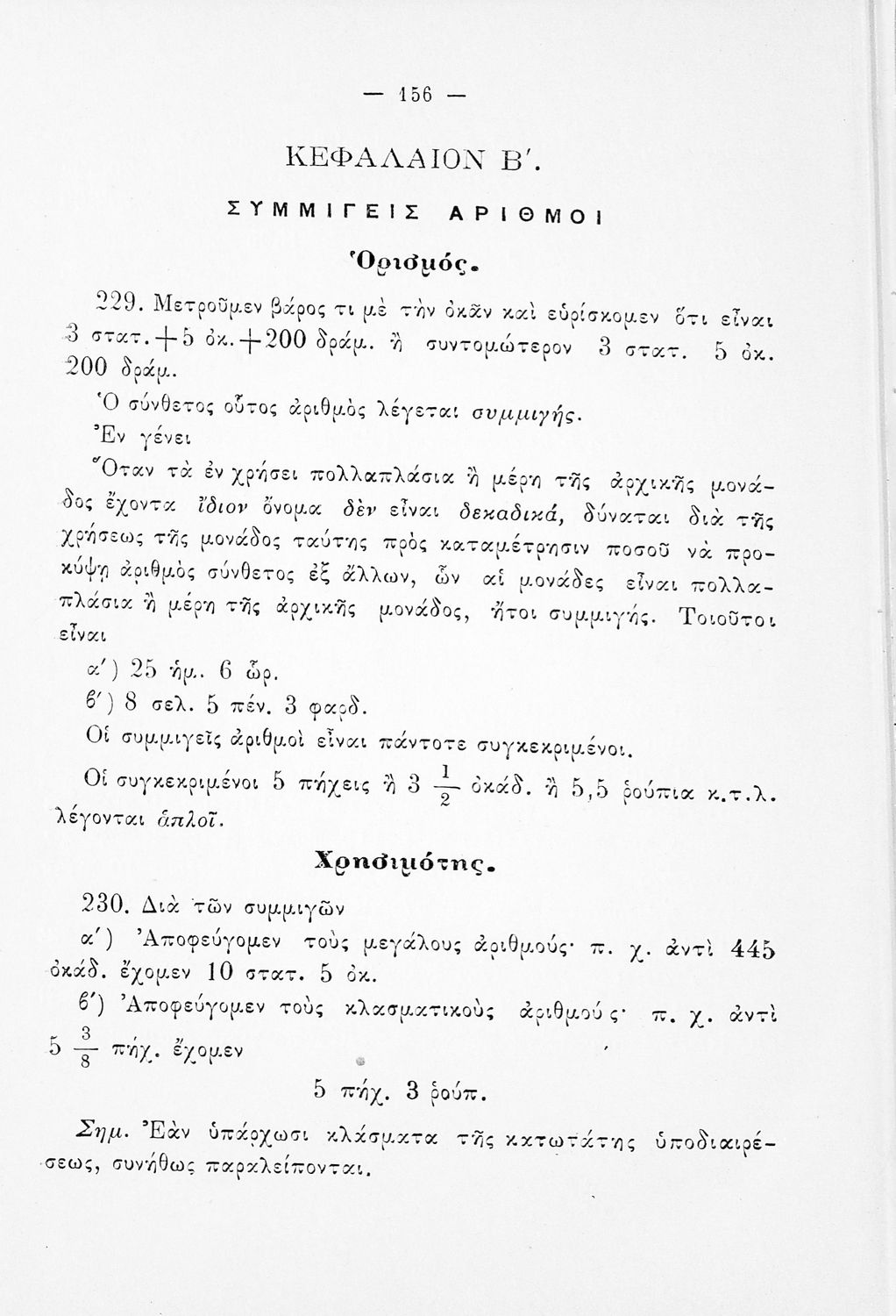 Βαθμίδα εκπαίδευσης: Δευτεροβάθμια Τάξη: Γυμνάσιο Μάθημα: Αριθμητική Γλώσσα: Καθαρεύουσα Παρουσίαση περιεχομένου: Σχολικό εγχειρίδιο Αριθμητικής Γυμνασίου που περιλαμβάνει θεωρία, ασκήσεις και προβλήματα που σχετίζονται με τις αριθμητικές πράξεις, τα κλάσματα, τις αριθμητικές παραστάσεις, τις εξισώσεις, τα ανάλογα ποσά, το επιτόκιο, και το μέρισμα. |