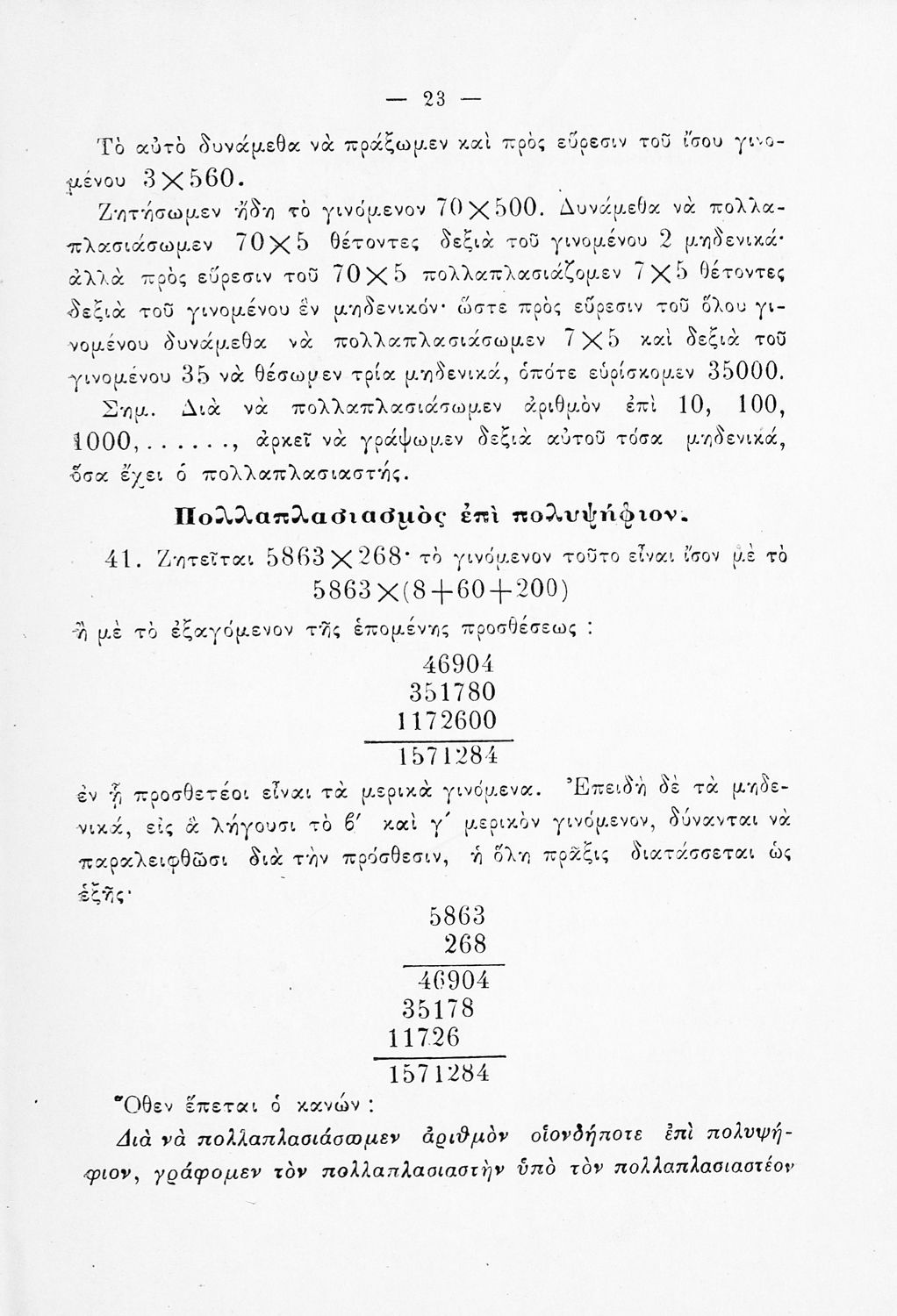Σχολικό εγχειρίδιο Αριθμητικής Γυμνασίου που περιλαμβάνει θεωρία, ασκήσεις και προβλήματα που σχετίζονται με τις αριθμητικές πράξεις, τα κλάσματα, τις αριθμητικές παραστάσεις, τις εξισώσεις, τα ανάλογα ποσά, το επιτόκιο, και το μέρισμα.