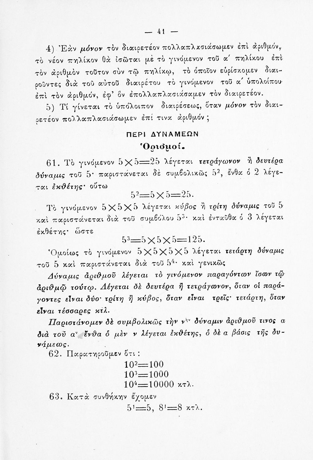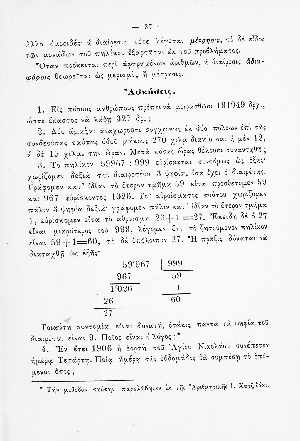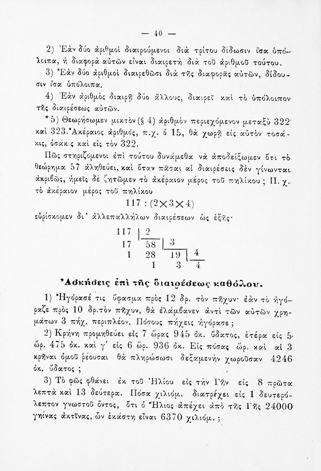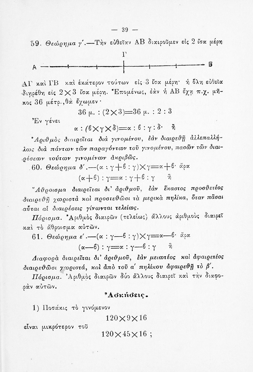 Βαθμίδα εκπαίδευσης: Δευτεροβάθμια Τάξη: Γυμνάσιο Μάθημα: Αριθμητική Γλώσσα: Καθαρεύουσα Παρουσίαση περιεχομένου: Σχολικό εγχειρίδιο Αριθμητικής Γυμνασίου που περιλαμβάνει θεωρία, ασκήσεις και προβλήματα που σχετίζονται με τις αριθμητικές πράξεις, τα κλάσματα, τις αριθμητικές παραστάσεις, τις εξισώσεις, τα ανάλογα ποσά, το επιτόκιο, και το μέρισμα. |