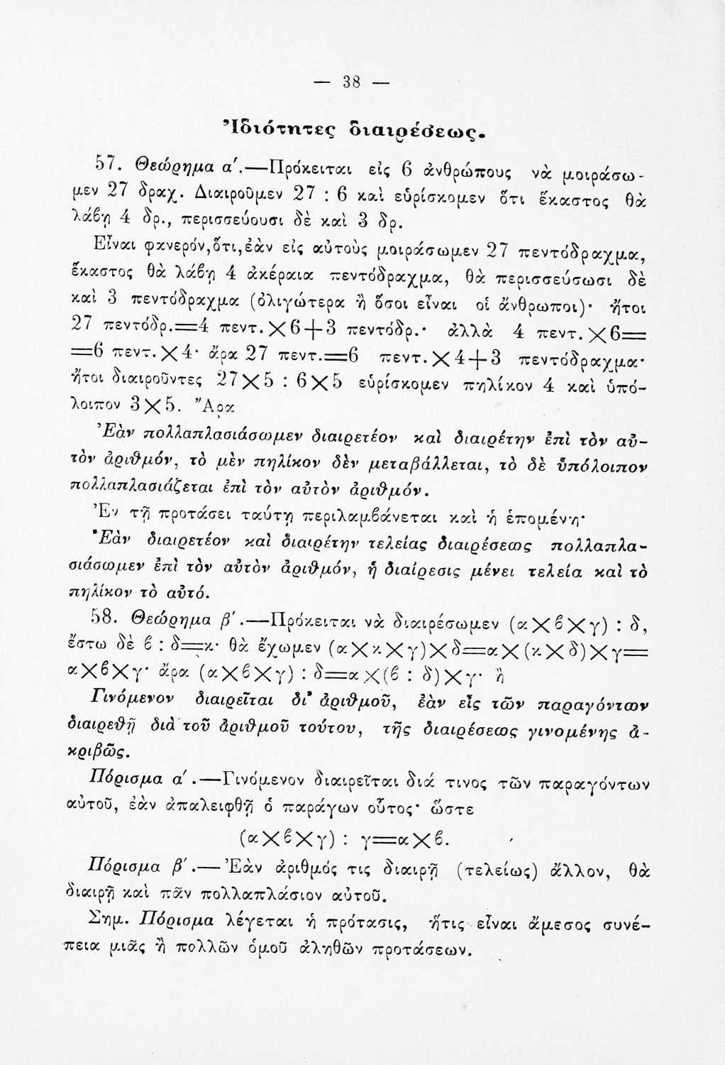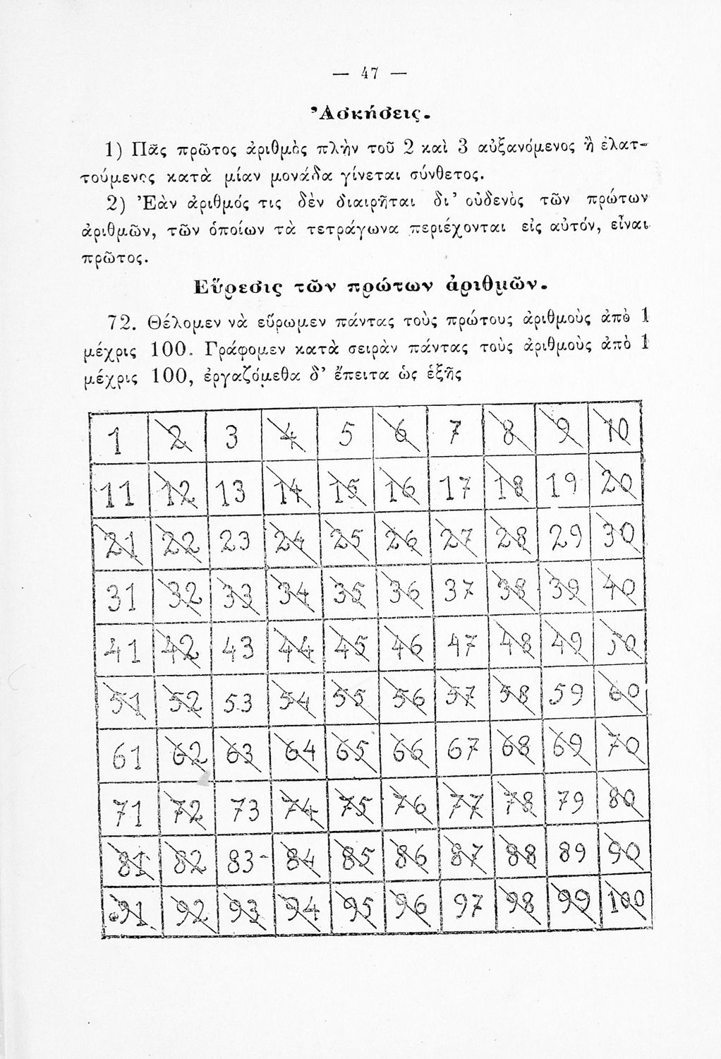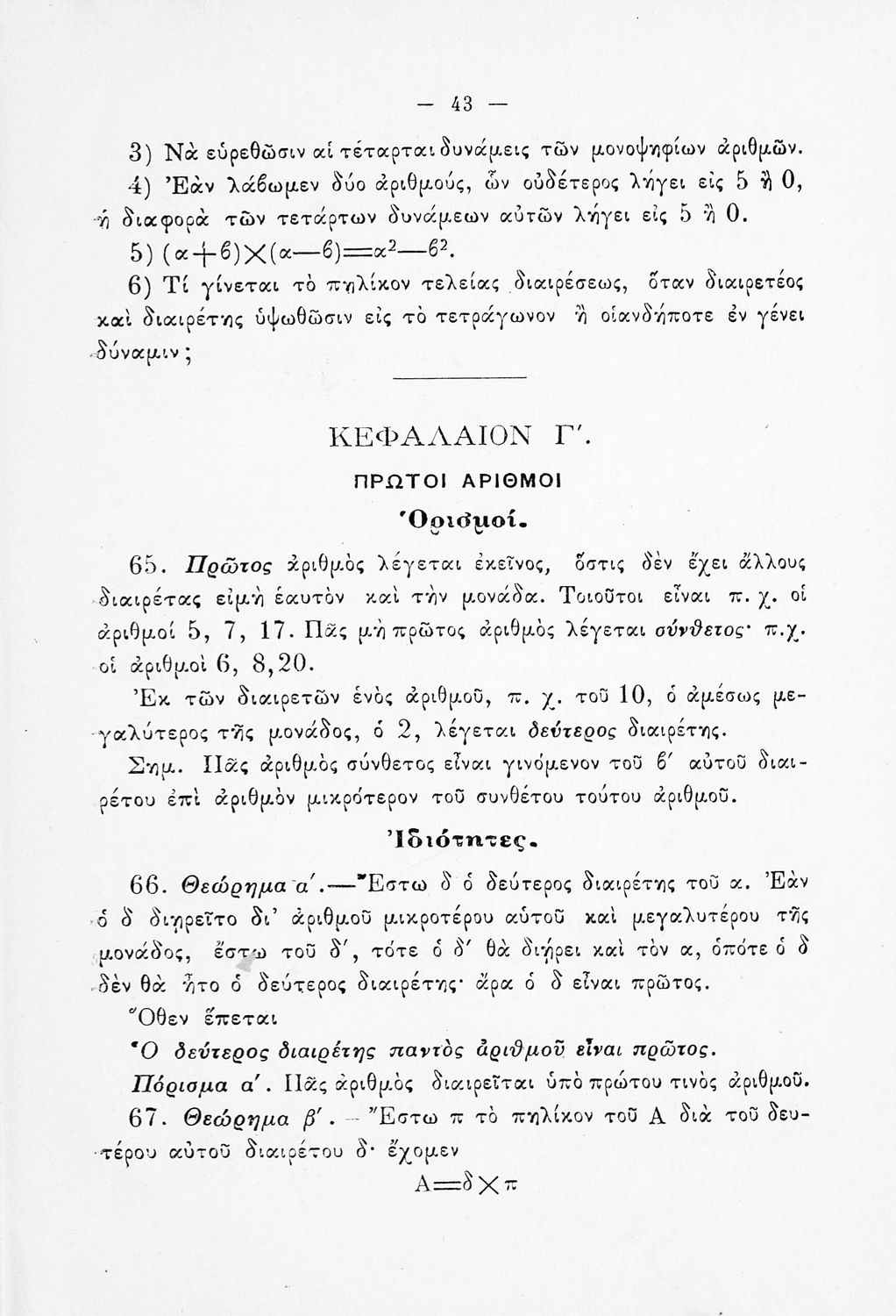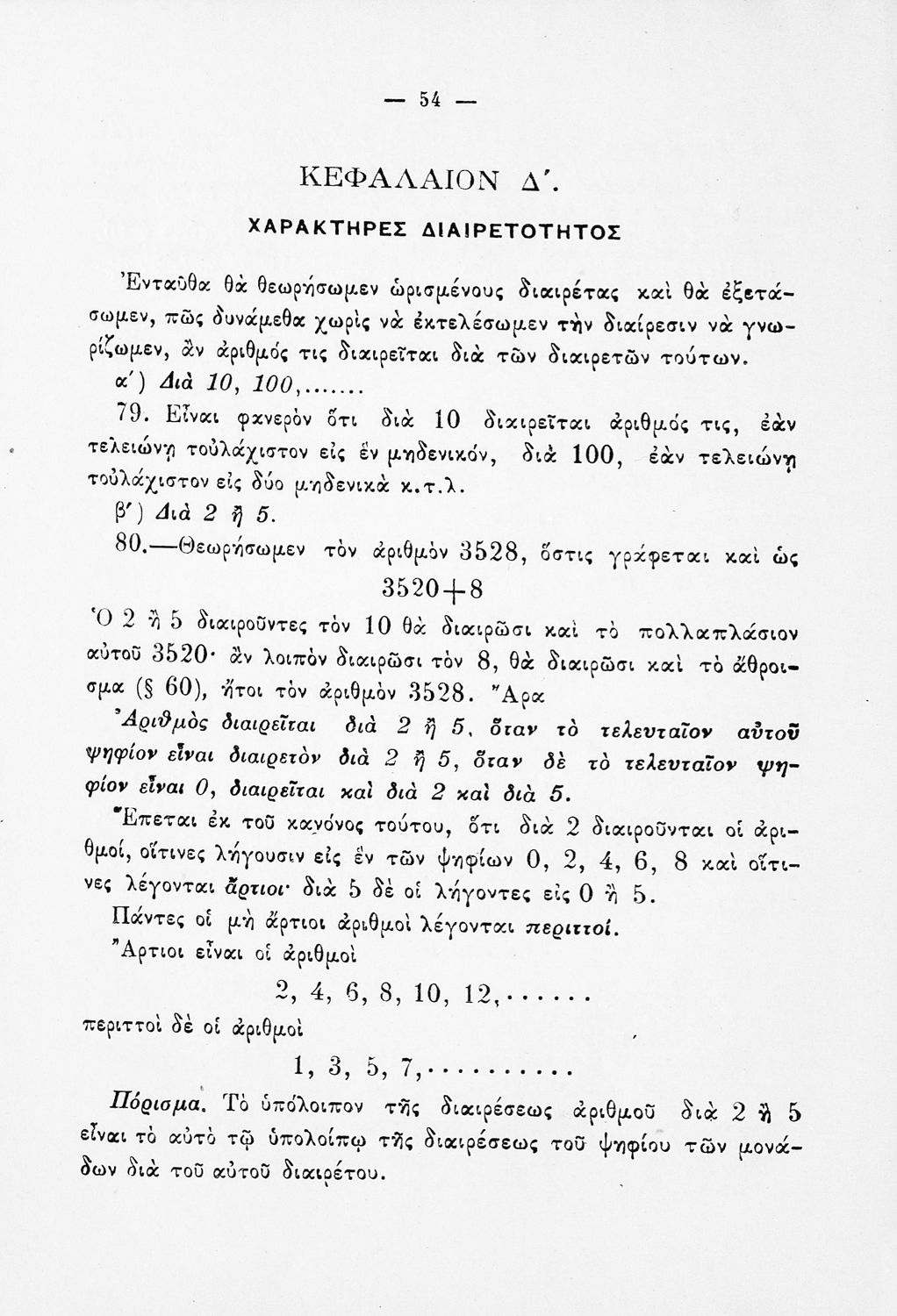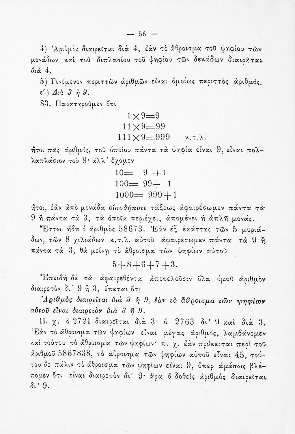 Βαθμίδα εκπαίδευσης: Δευτεροβάθμια Τάξη: Γυμνάσιο Μάθημα: Αριθμητική Γλώσσα: Καθαρεύουσα Παρουσίαση περιεχομένου: Σχολικό εγχειρίδιο Αριθμητικής Γυμνασίου που περιλαμβάνει θεωρία, ασκήσεις και προβλήματα που σχετίζονται με τις αριθμητικές πράξεις, τα κλάσματα, τις αριθμητικές παραστάσεις, τις εξισώσεις, τα ανάλογα ποσά, το επιτόκιο, και το μέρισμα. |