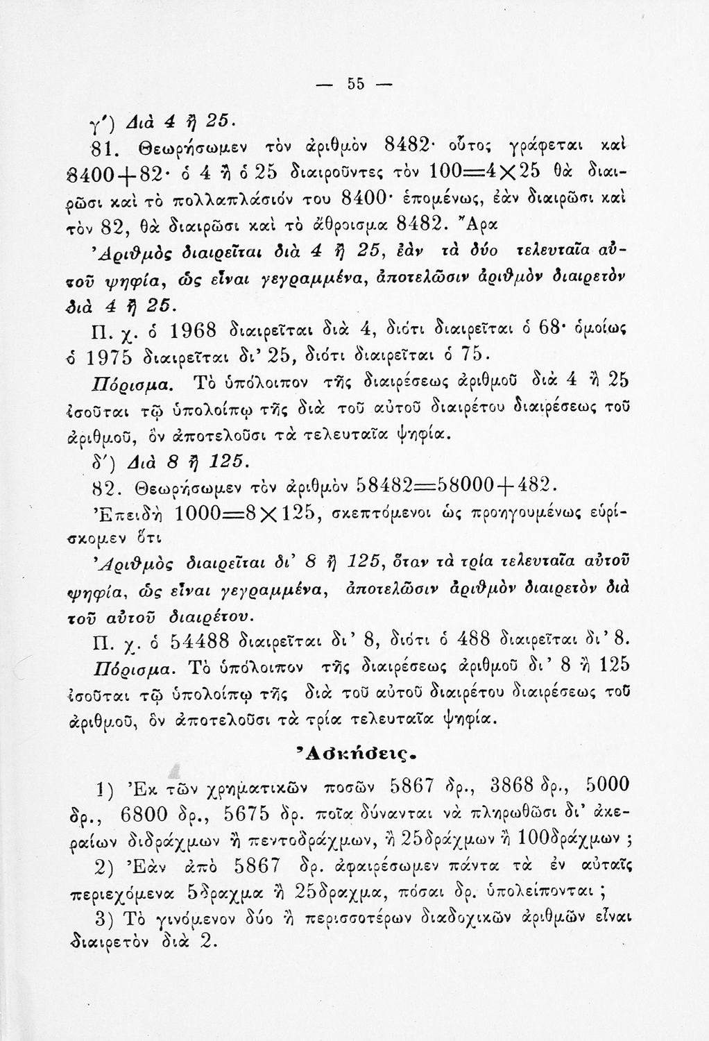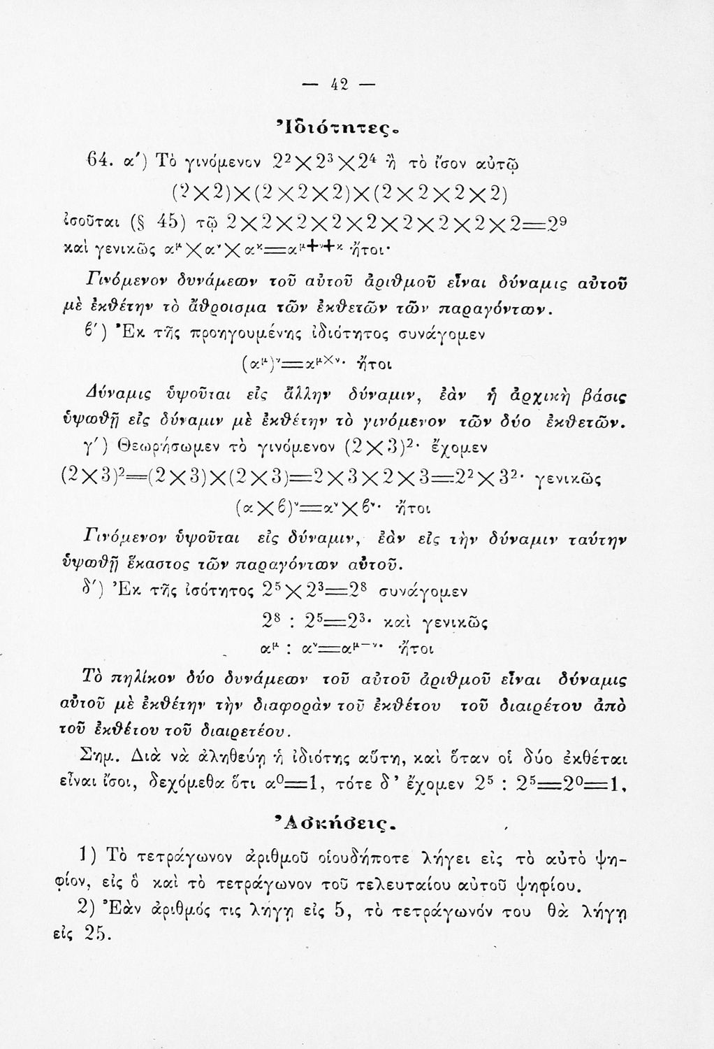 Σχολικό εγχειρίδιο Αριθμητικής Γυμνασίου που περιλαμβάνει θεωρία, ασκήσεις και προβλήματα που σχετίζονται με τις αριθμητικές πράξεις, τα κλάσματα, τις αριθμητικές παραστάσεις, τις εξισώσεις, τα ανάλογα ποσά, το επιτόκιο, και το μέρισμα.