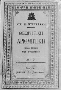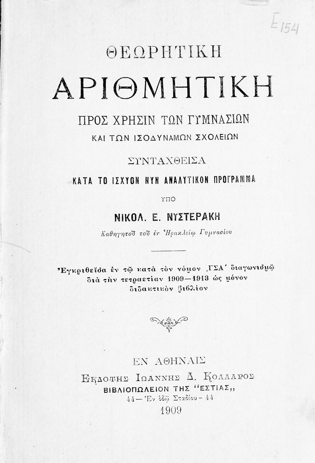 Κωδικός αναγνώρισης: 20-E0154 Τίτλος: Θεωρητική αριθμητική προς χρήσιν των Γυμνασίων Συγγραφέας: Νικ. Ε. Νυστεράκης Μέγεθος και υπόστρωμα: Σχολικό εγχειρίδιο, 20εκ., σκληρό εξώφυλλο, 242 σελίδες. Σχεδιαγράμματα. |