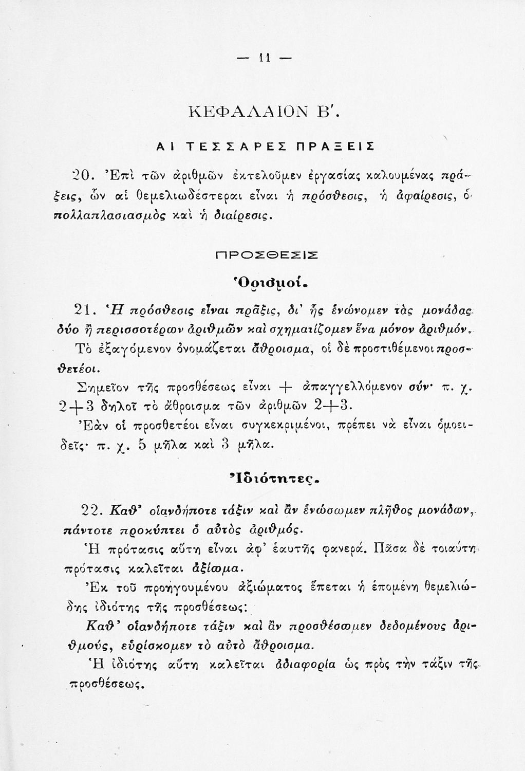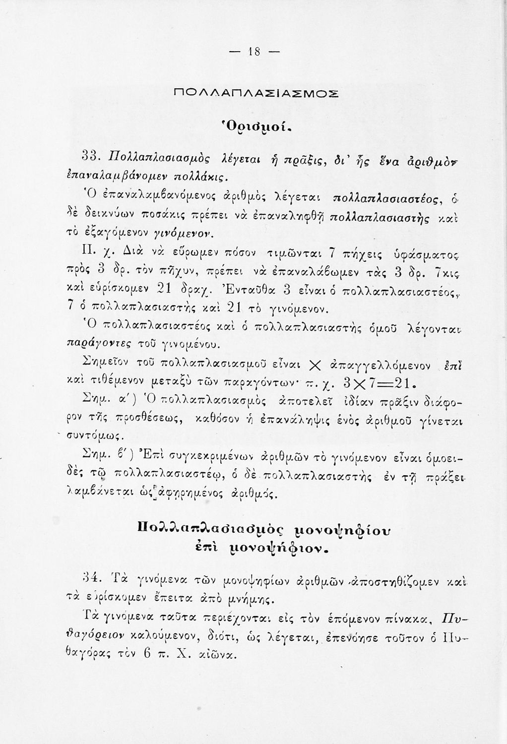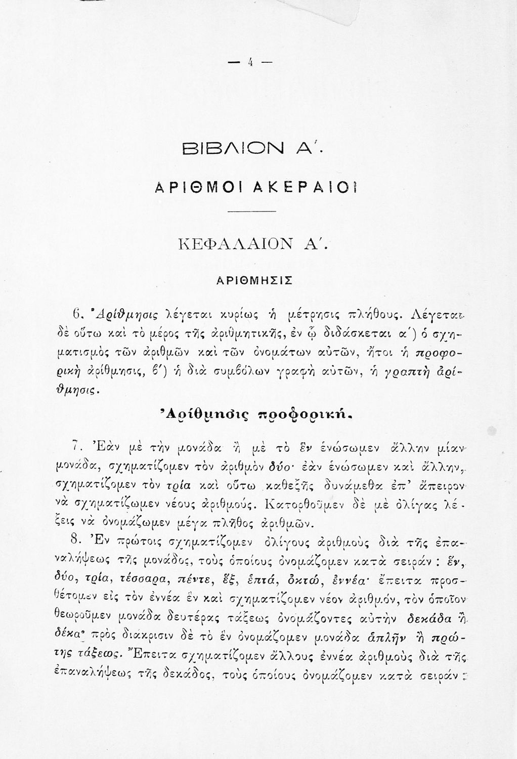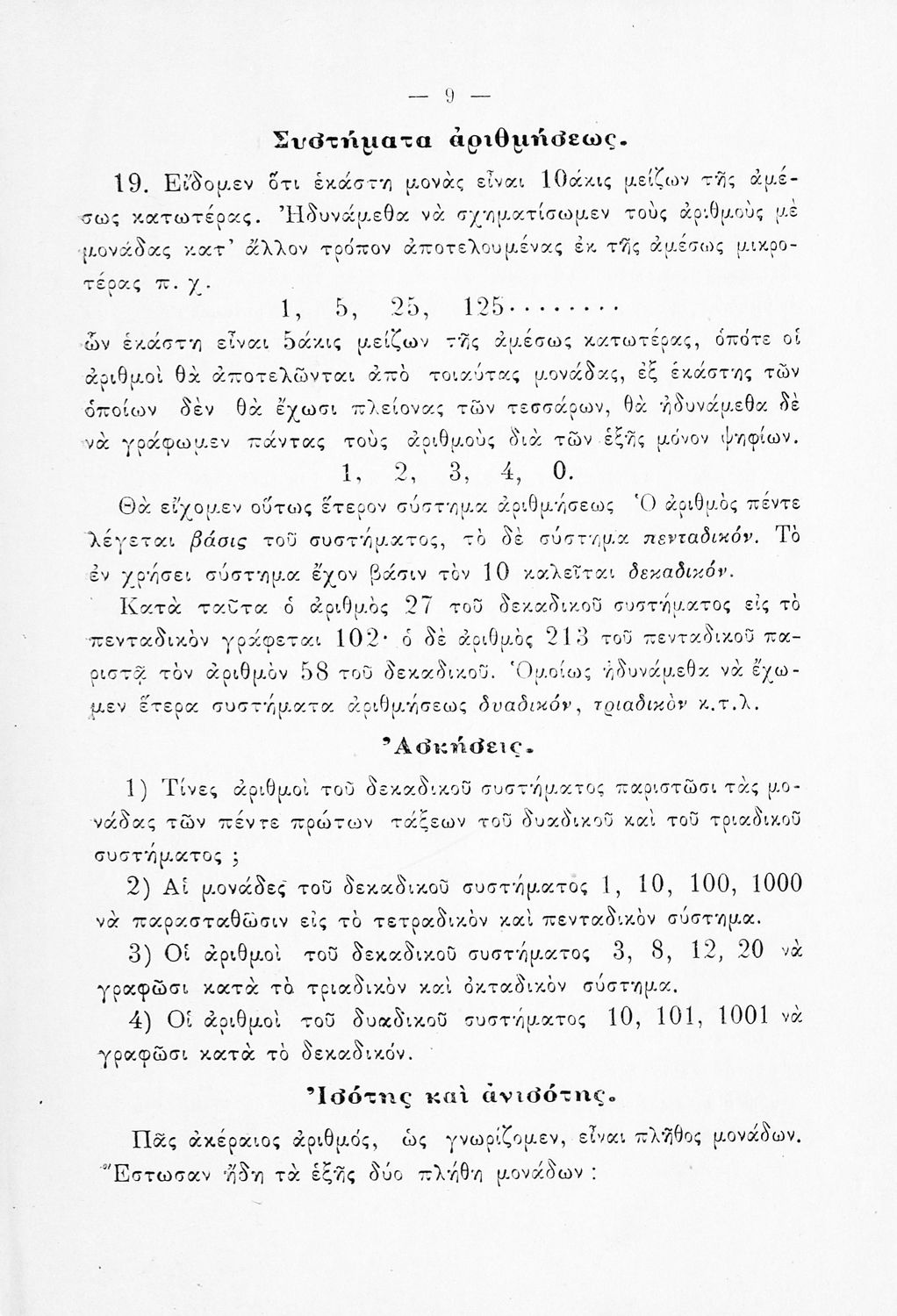 Βαθμίδα εκπαίδευσης: Δευτεροβάθμια Τάξη: Γυμνάσιο Μάθημα: Αριθμητική Γλώσσα: Καθαρεύουσα Παρουσίαση περιεχομένου: Σχολικό εγχειρίδιο Αριθμητικής Γυμνασίου που περιλαμβάνει θεωρία, ασκήσεις και προβλήματα που σχετίζονται με τις αριθμητικές πράξεις, τα κλάσματα, τις αριθμητικές παραστάσεις, τις εξισώσεις, τα ανάλογα ποσά, το επιτόκιο, και το μέρισμα. |