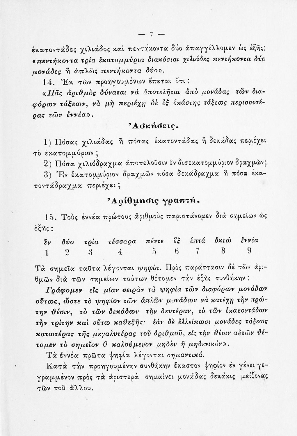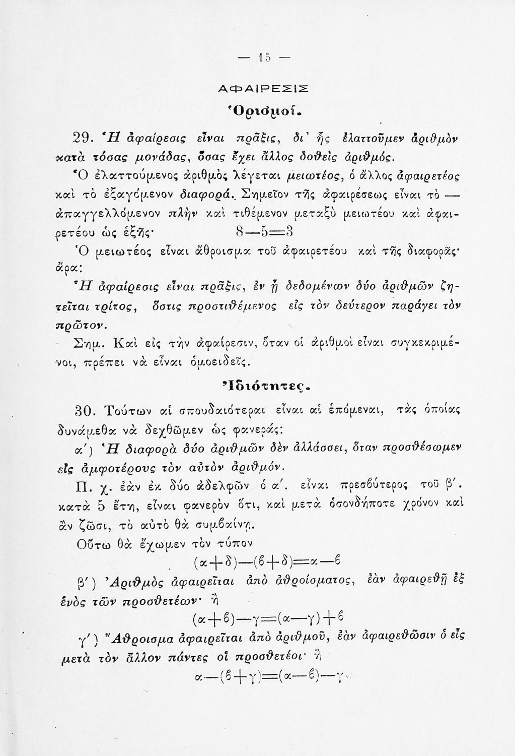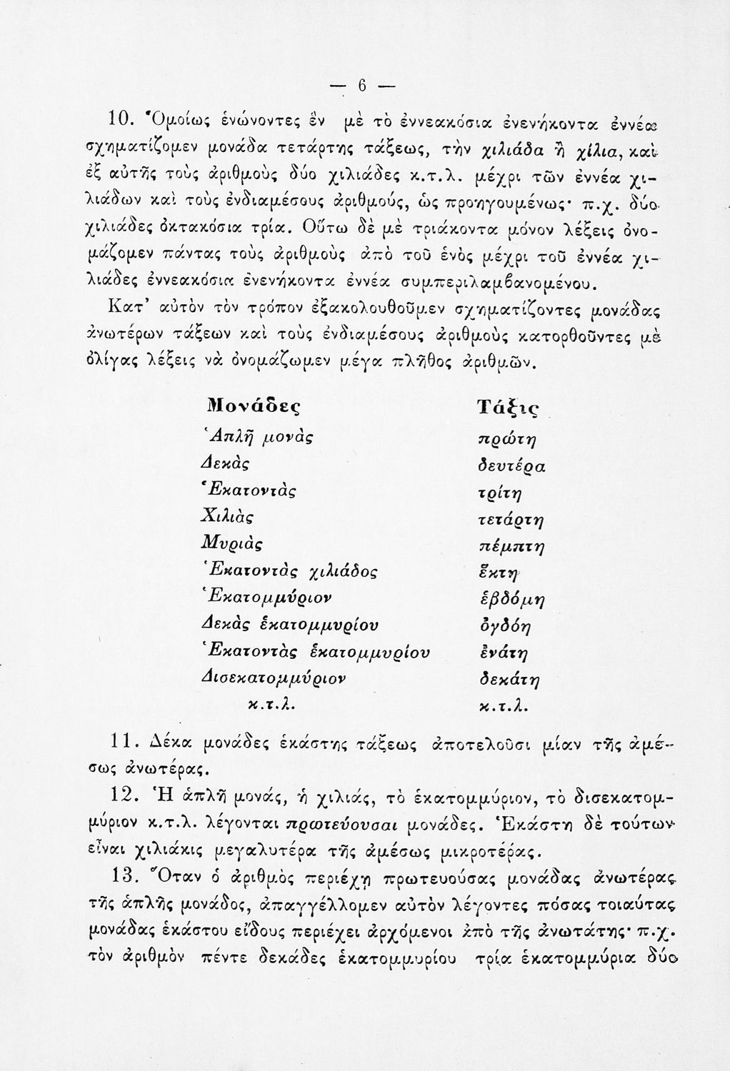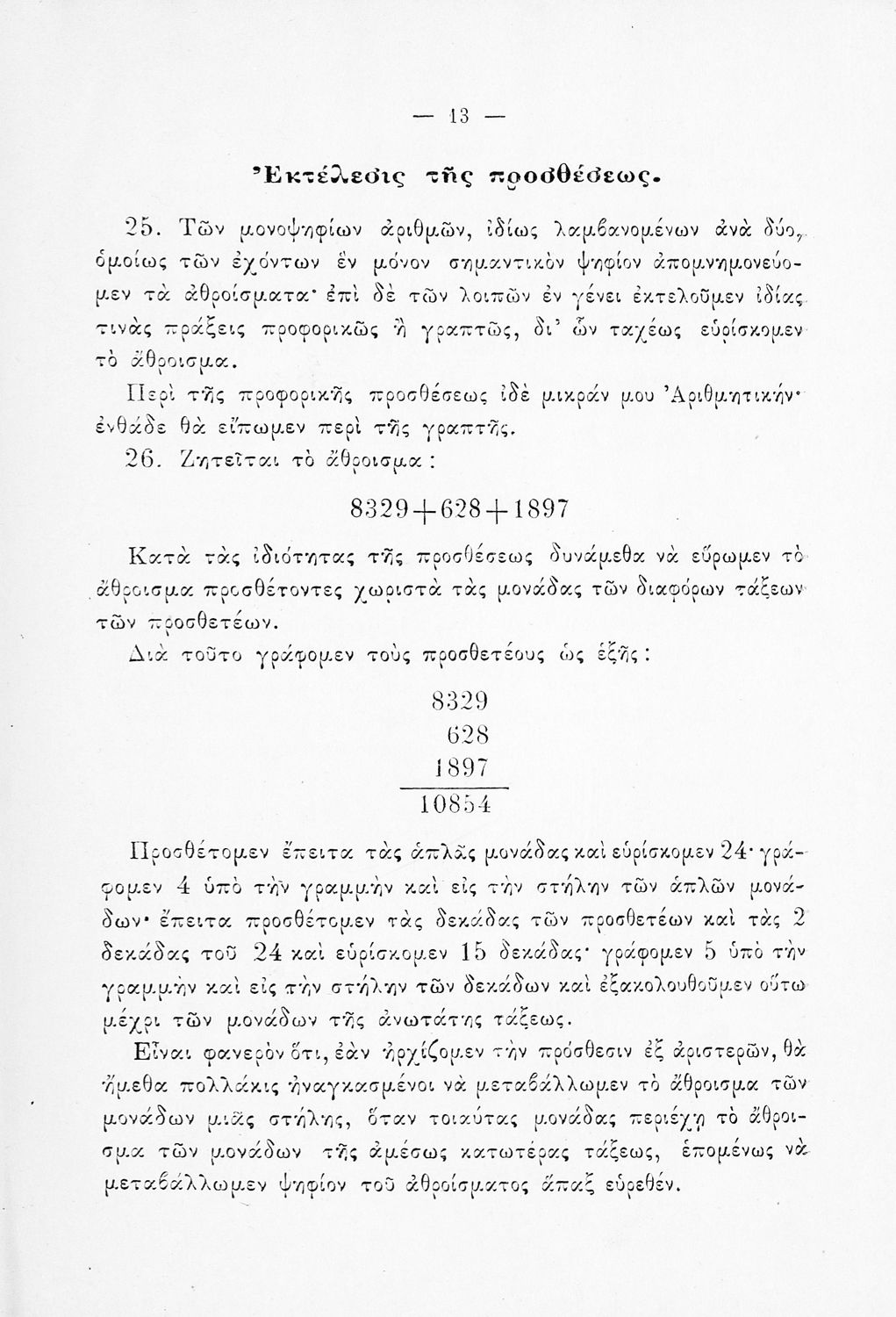 Βαθμίδα εκπαίδευσης: Δευτεροβάθμια Τάξη: Γυμνάσιο Μάθημα: Αριθμητική Γλώσσα: Καθαρεύουσα Παρουσίαση περιεχομένου: Σχολικό εγχειρίδιο Αριθμητικής Γυμνασίου που περιλαμβάνει θεωρία, ασκήσεις και προβλήματα που σχετίζονται με τις αριθμητικές πράξεις, τα κλάσματα, τις αριθμητικές παραστάσεις, τις εξισώσεις, τα ανάλογα ποσά, το επιτόκιο, και το μέρισμα. |