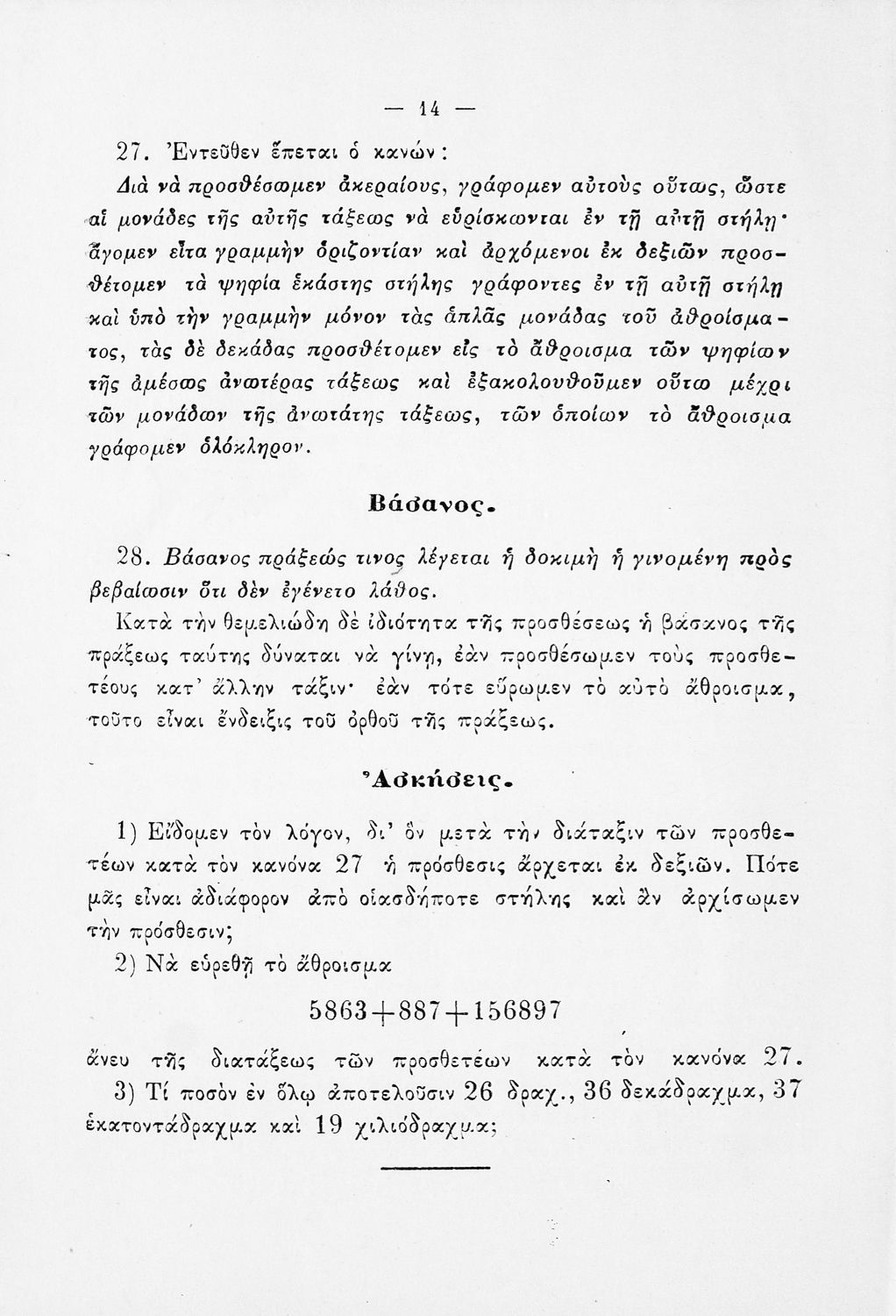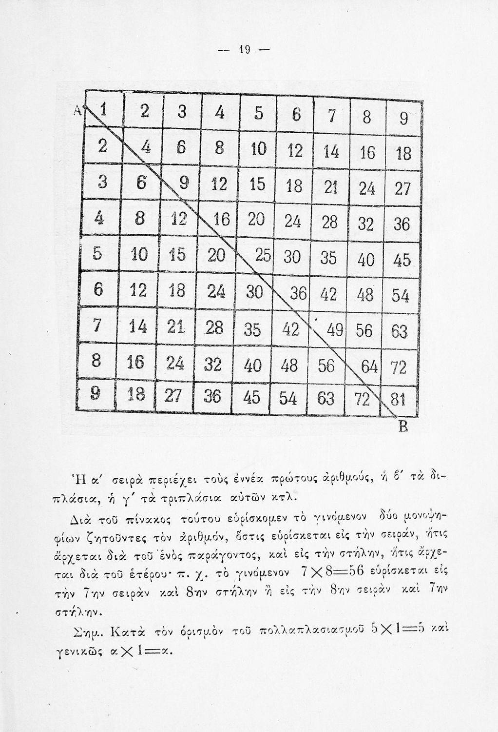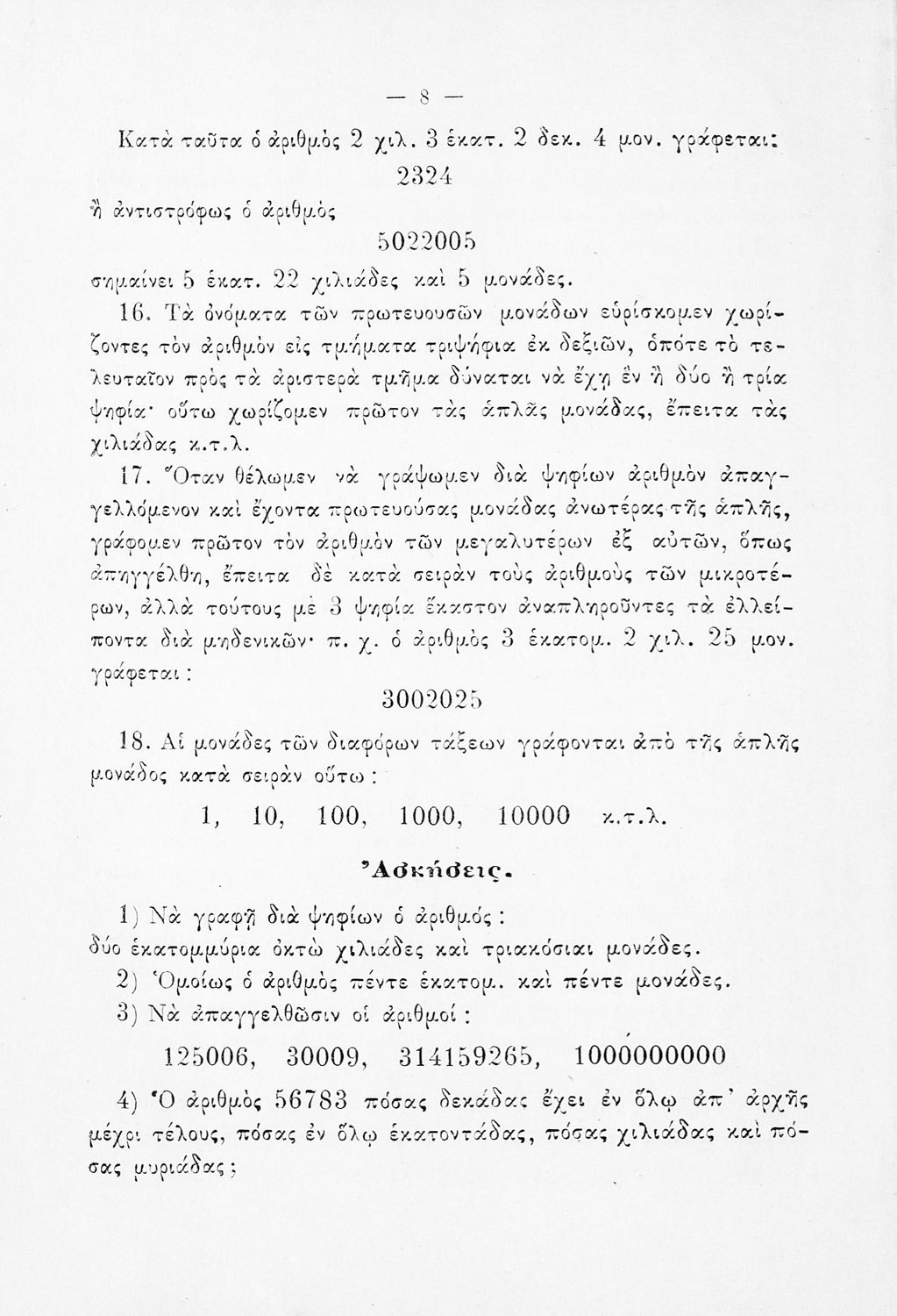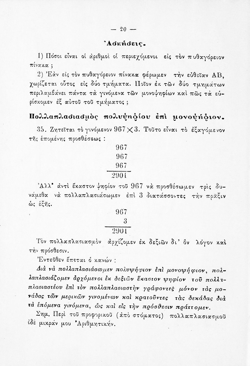 Βαθμίδα εκπαίδευσης: Δευτεροβάθμια Τάξη: Γυμνάσιο Μάθημα: Αριθμητική Γλώσσα: Καθαρεύουσα Παρουσίαση περιεχομένου: Σχολικό εγχειρίδιο Αριθμητικής Γυμνασίου που περιλαμβάνει θεωρία, ασκήσεις και προβλήματα που σχετίζονται με τις αριθμητικές πράξεις, τα κλάσματα, τις αριθμητικές παραστάσεις, τις εξισώσεις, τα ανάλογα ποσά, το επιτόκιο, και το μέρισμα. |
