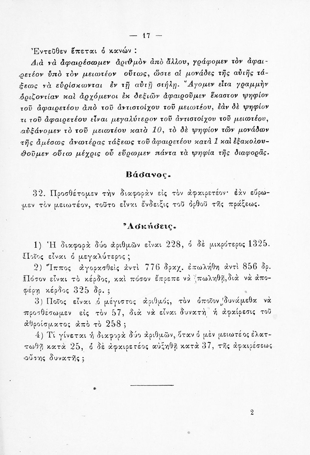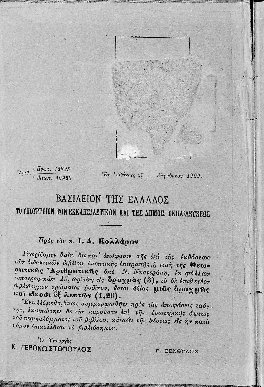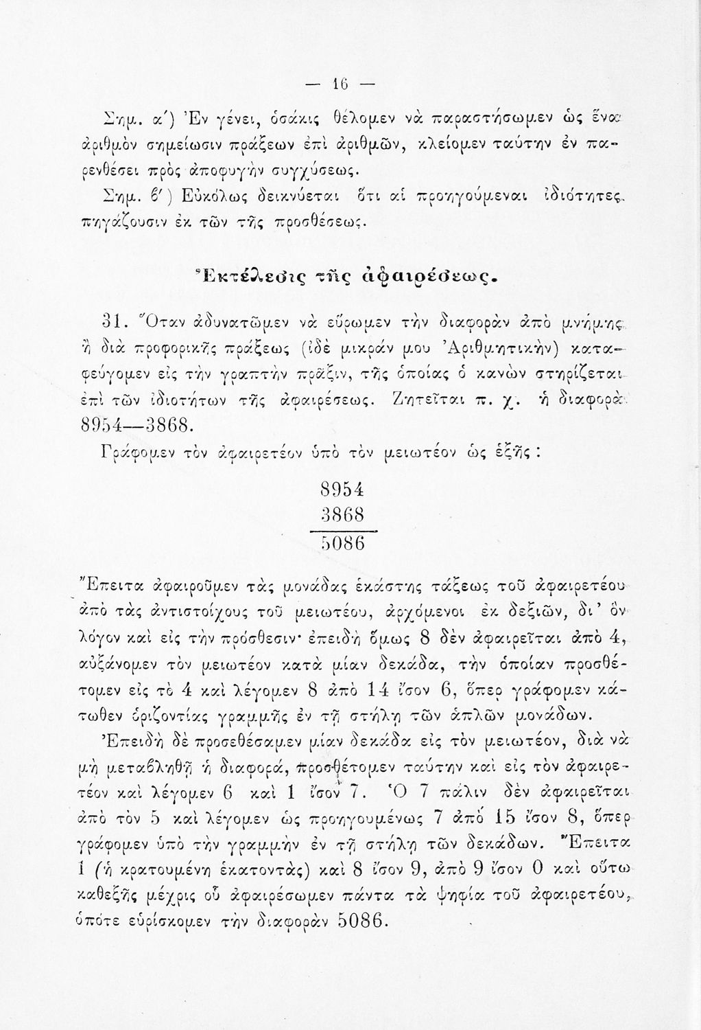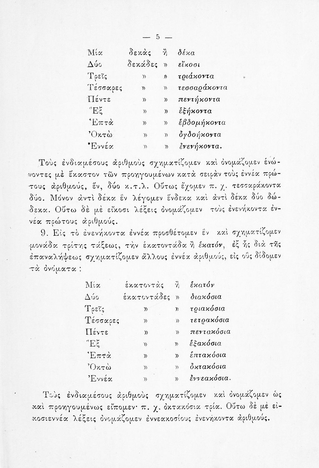 Βαθμίδα εκπαίδευσης: Δευτεροβάθμια Τάξη: Γυμνάσιο Μάθημα: Αριθμητική Γλώσσα: Καθαρεύουσα Παρουσίαση περιεχομένου: Σχολικό εγχειρίδιο Αριθμητικής Γυμνασίου που περιλαμβάνει θεωρία, ασκήσεις και προβλήματα που σχετίζονται με τις αριθμητικές πράξεις, τα κλάσματα, τις αριθμητικές παραστάσεις, τις εξισώσεις, τα ανάλογα ποσά, το επιτόκιο, και το μέρισμα. |
