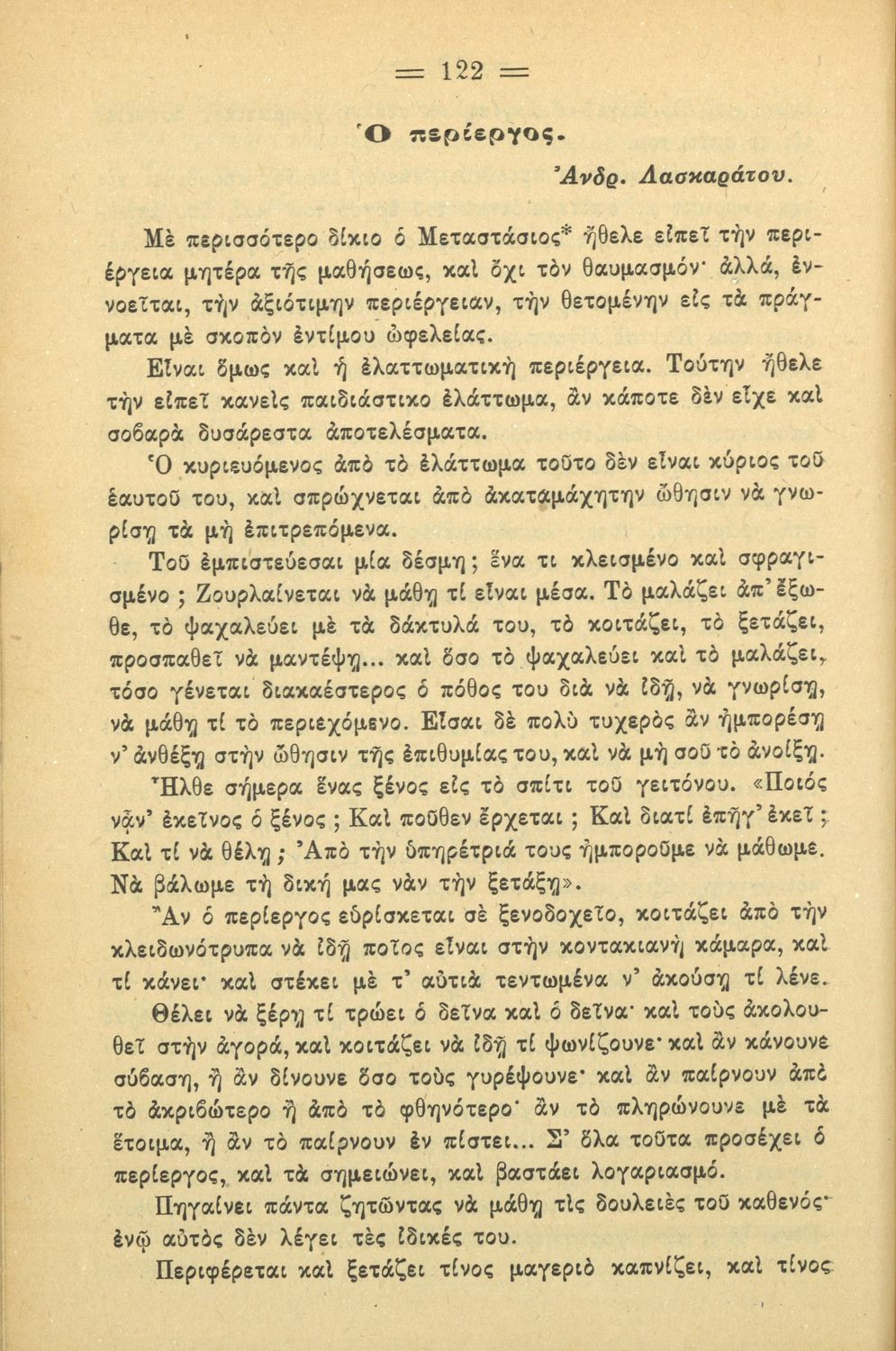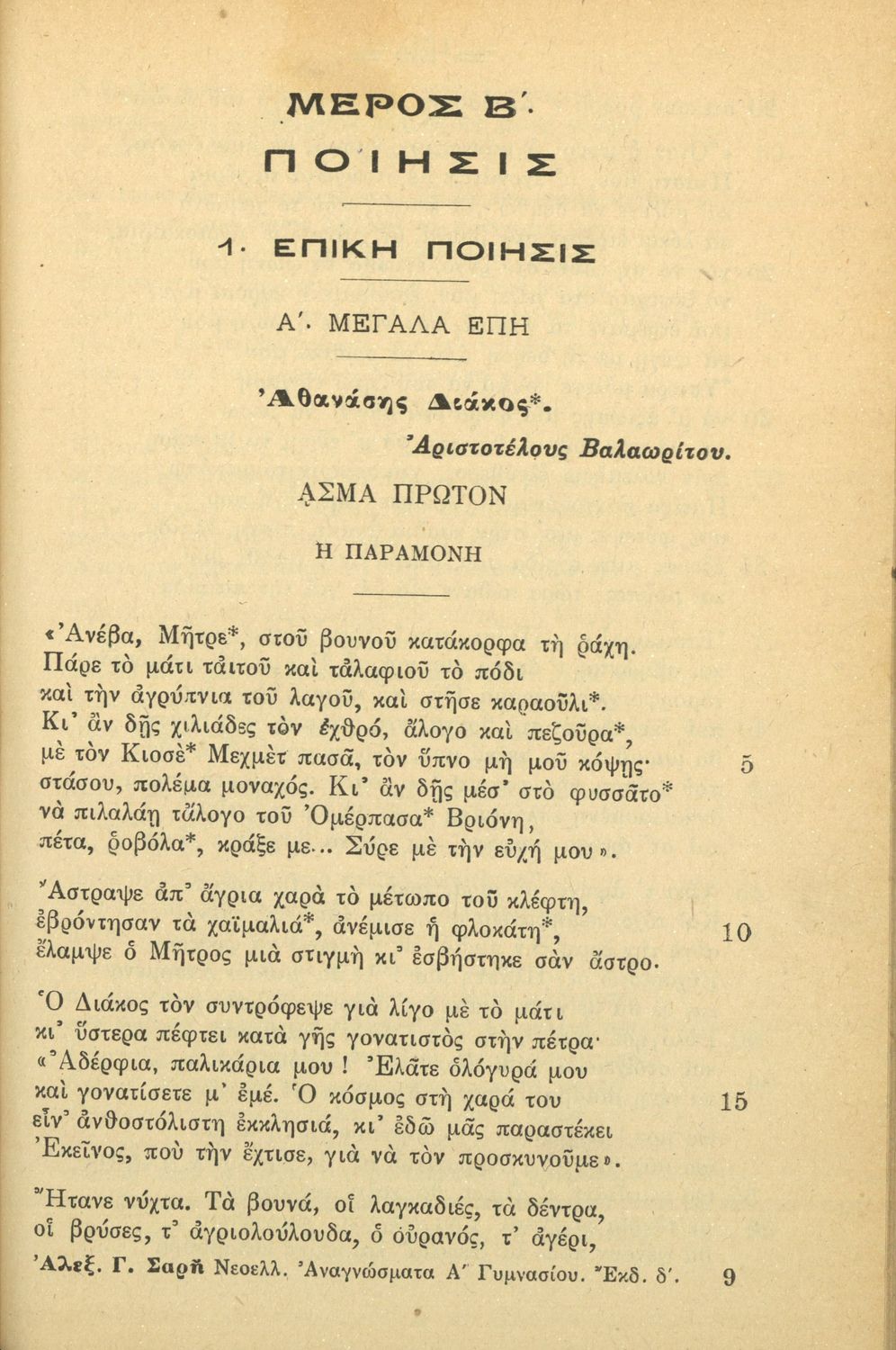 Σχολικό εγχειρίδιο για την Β΄ Γυμνασίου και την Γ΄ Αστικού Θηλέων για το μάθημα των Νέων Ελληνικών. Το εγχειρίδιο αποτελείται από κείμενα πεζού λόγου, επικολυρικά ποιήματα, ωδές, ηθογραφικά διηγήματα, ρητορικά