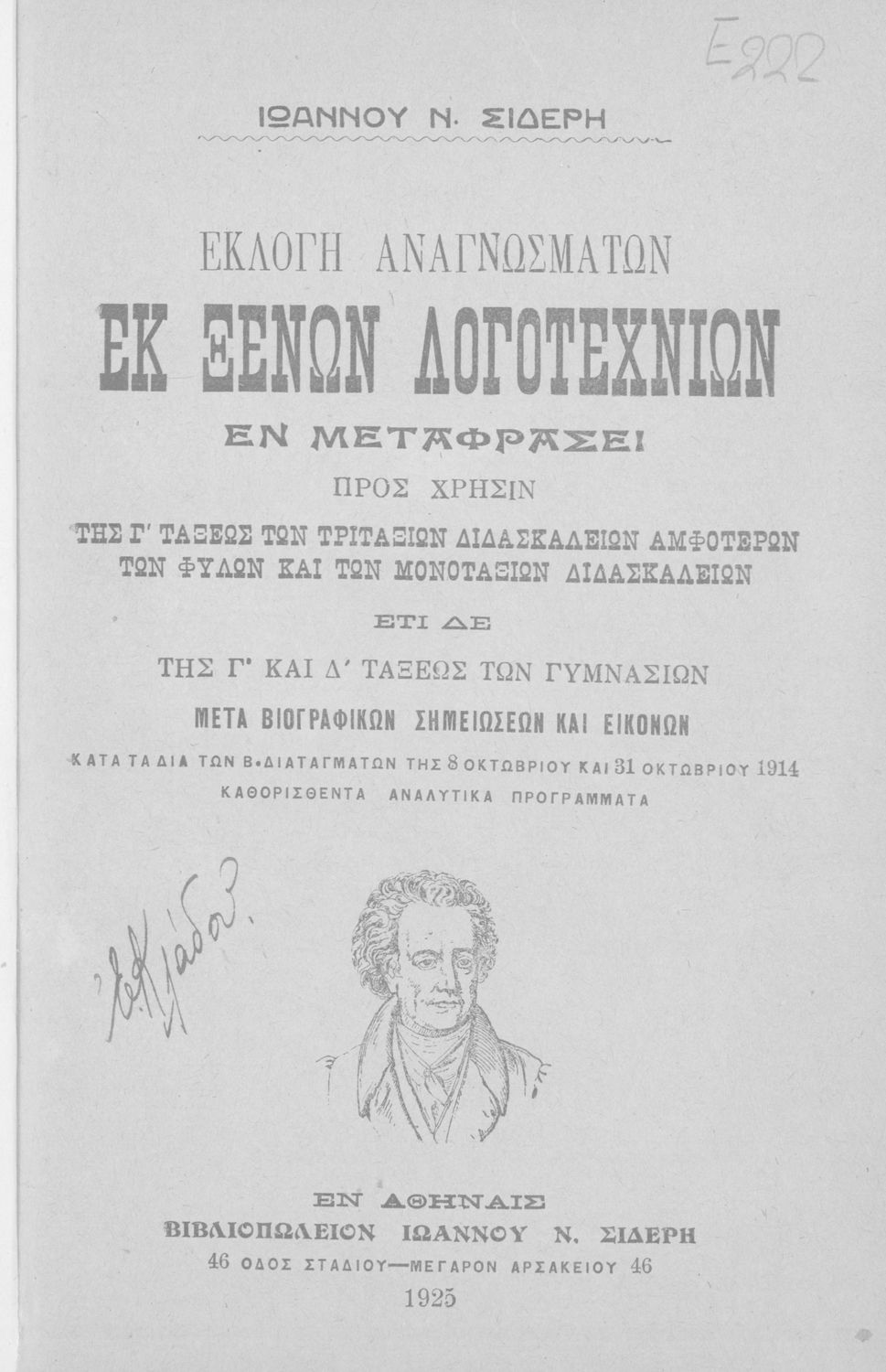 Εκδότης: Ιωάννης Ν. Σιδέρης Έτος έκδοσης: 1925 Τόπος έκδοσης: Αθήνα |