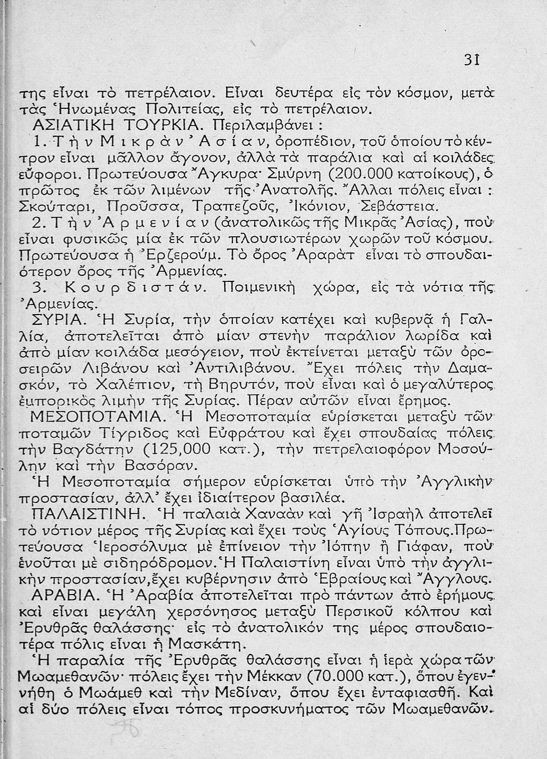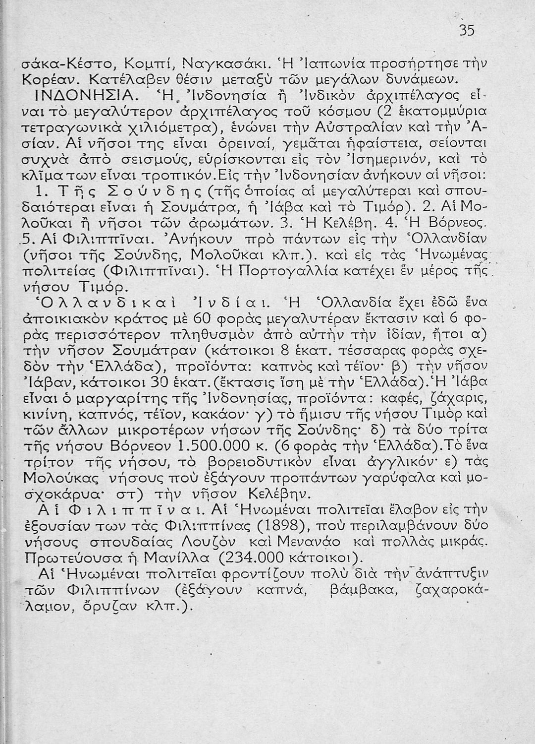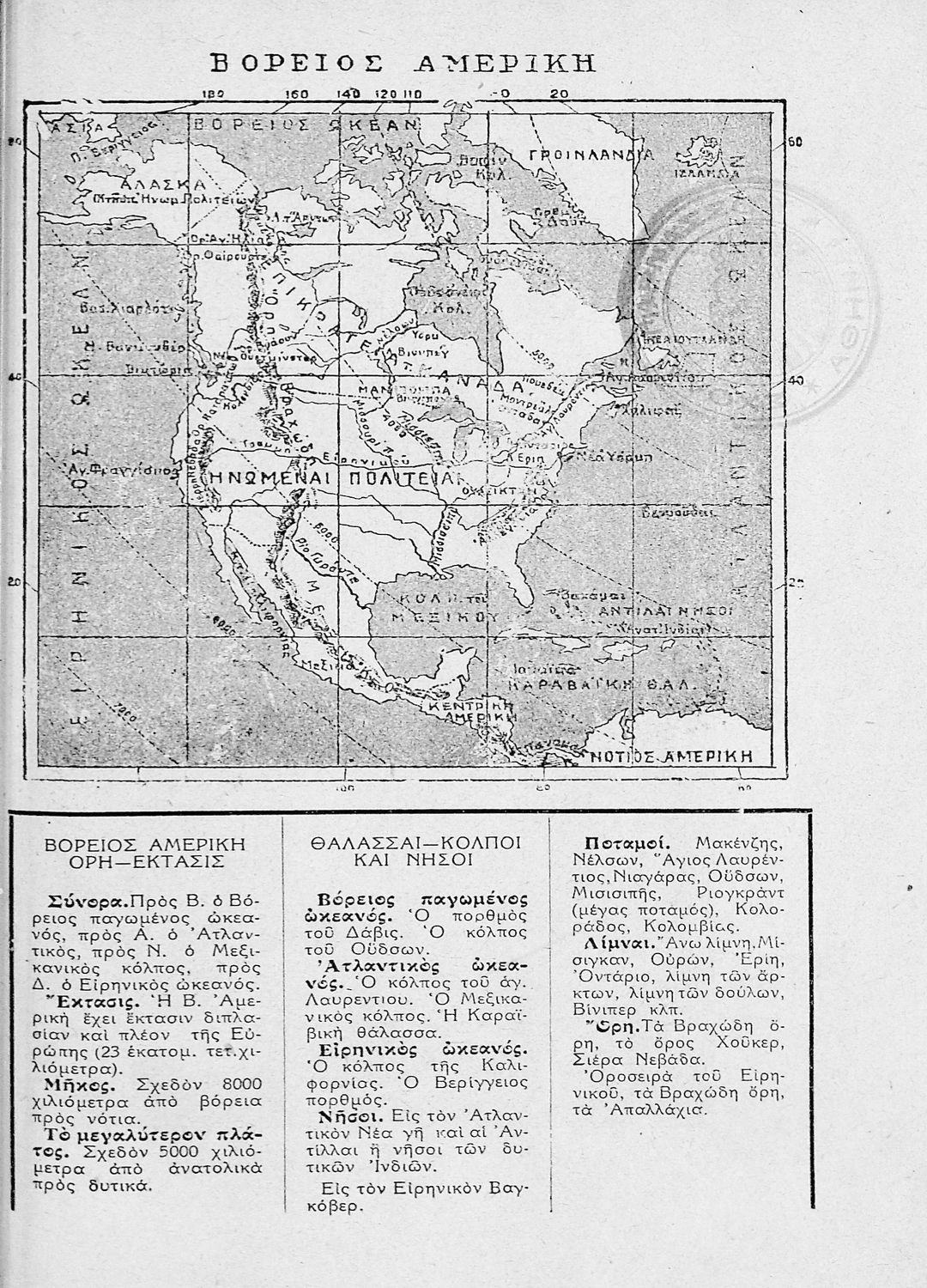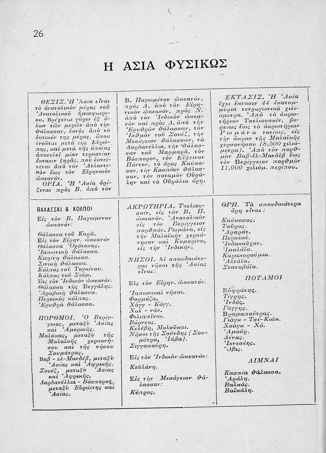 Μαθητικό βοήθημα Γεωγραφίας Ε΄ Δημοτικού που πραγματεύεται την σύσταση και δομή της Γης, τις ηπείρους πλην της Ευρώπης και τις μεγαλύτερες πληθυσμιακά πόλεις κατά το 1920. Περιέχει και συγκριτική μελέτη για την παραγωγή και διάθεση προϊόντων μεταξύ των κρατών και πληροφορίες για τους μεγάλους θαλασσοπόρους και εξερευνητές.