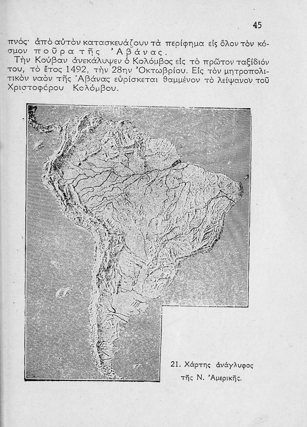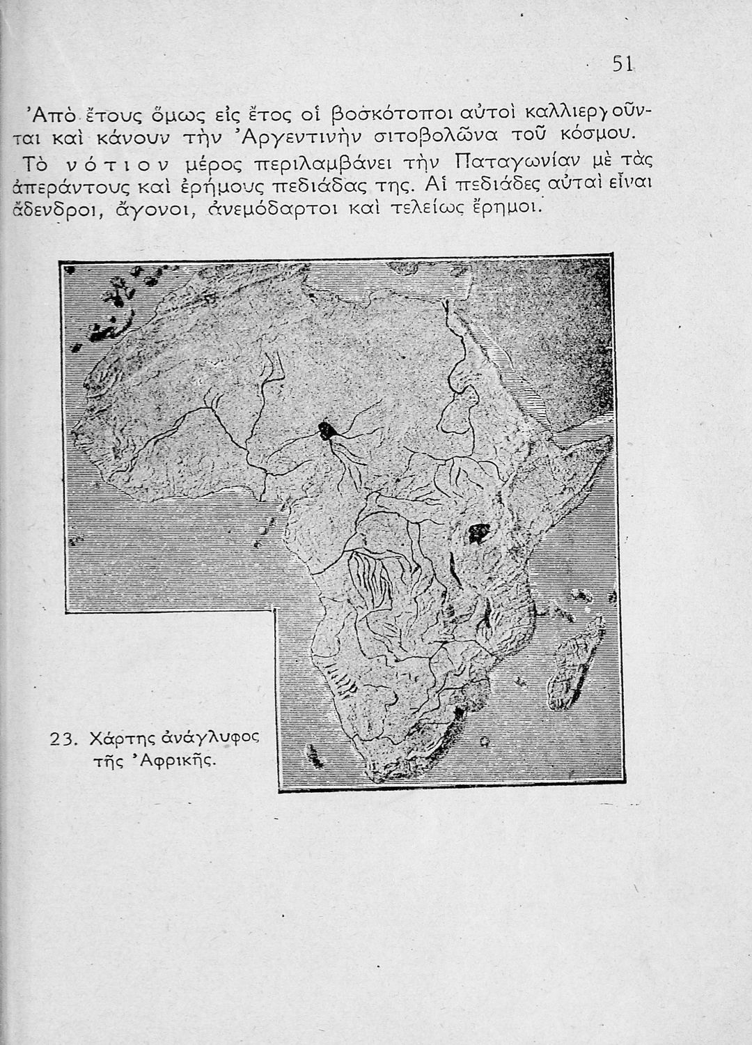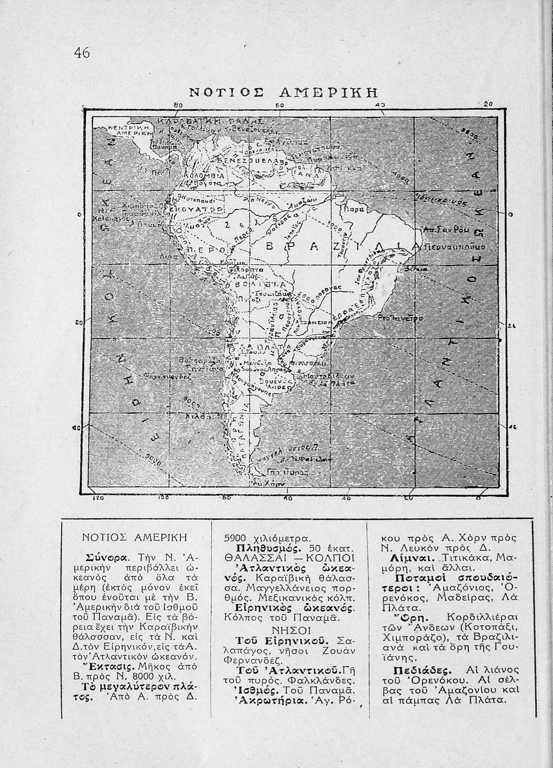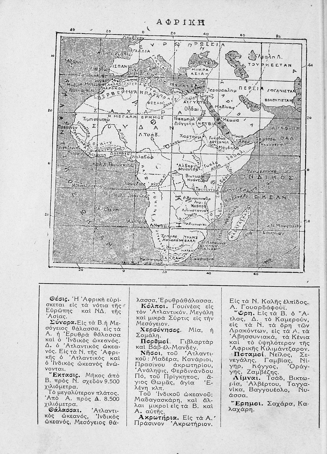 Μαθητικό βοήθημα Γεωγραφίας Ε΄ Δημοτικού που πραγματεύεται την σύσταση και δομή της Γης, τις ηπείρους πλην της Ευρώπης και τις μεγαλύτερες πληθυσμιακά πόλεις κατά το 1920. Περιέχει και συγκριτική μελέτη για την παραγωγή και διάθεση προϊόντων μεταξύ των κρατών και πληροφορίες για τους μεγάλους θαλασσοπόρους και εξερευνητές.